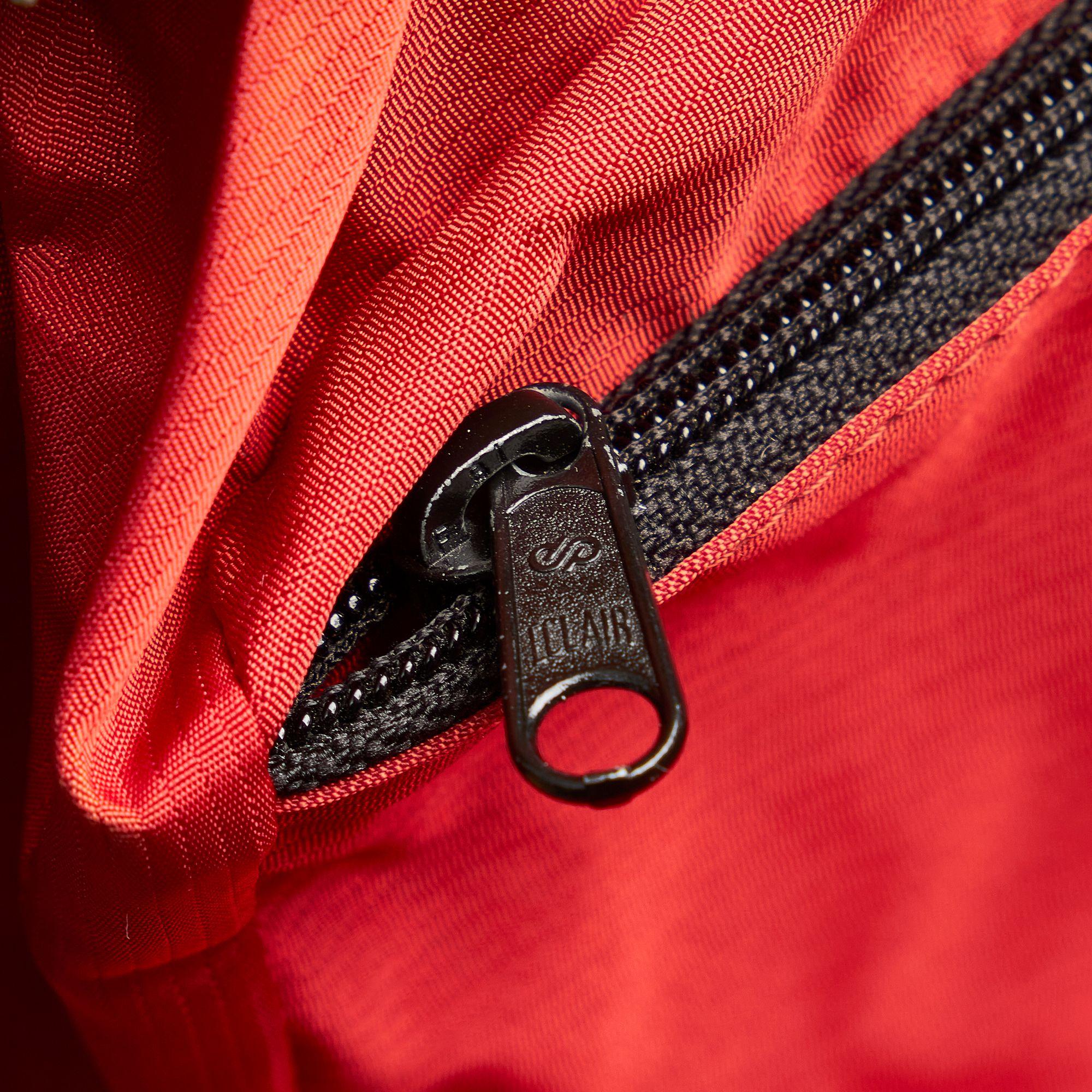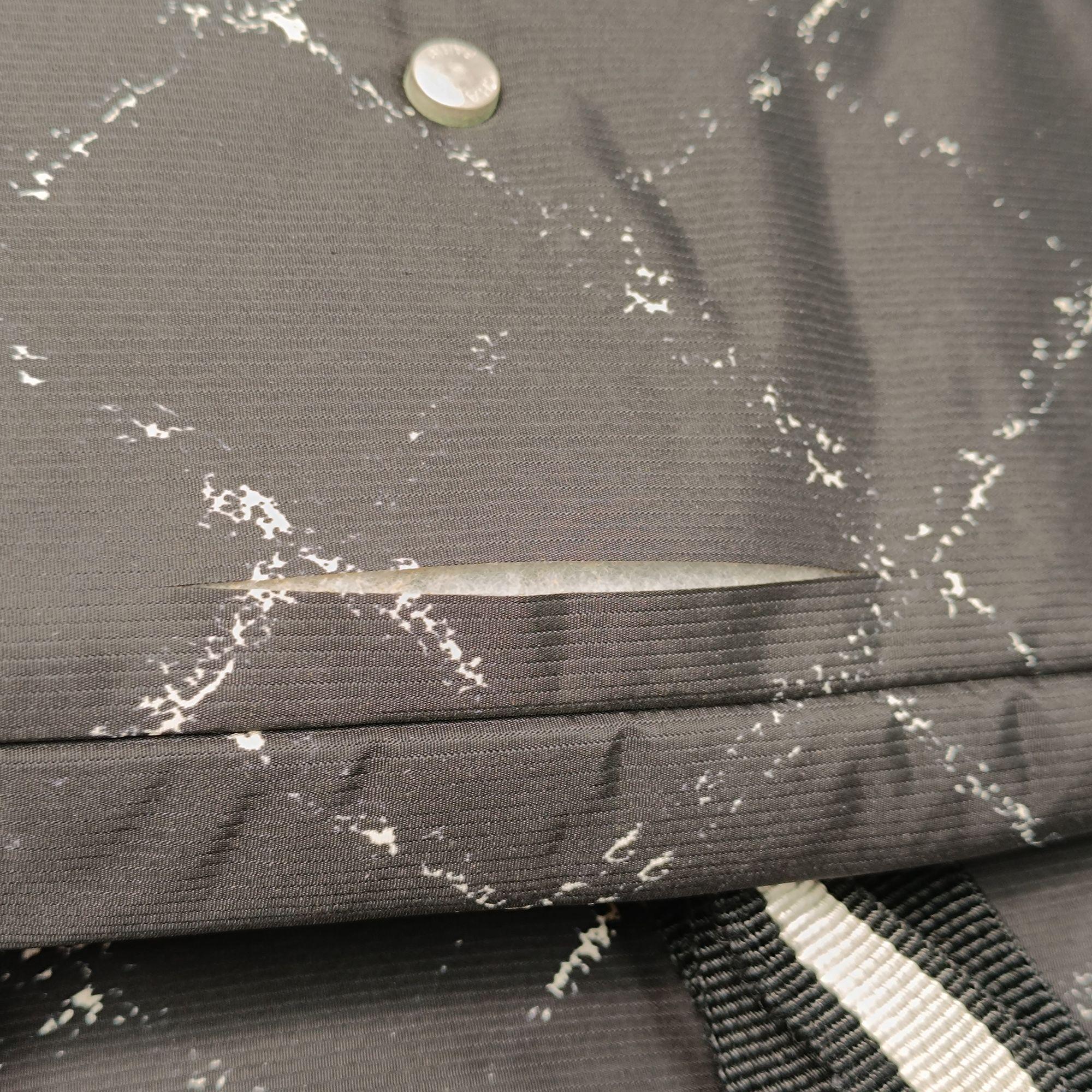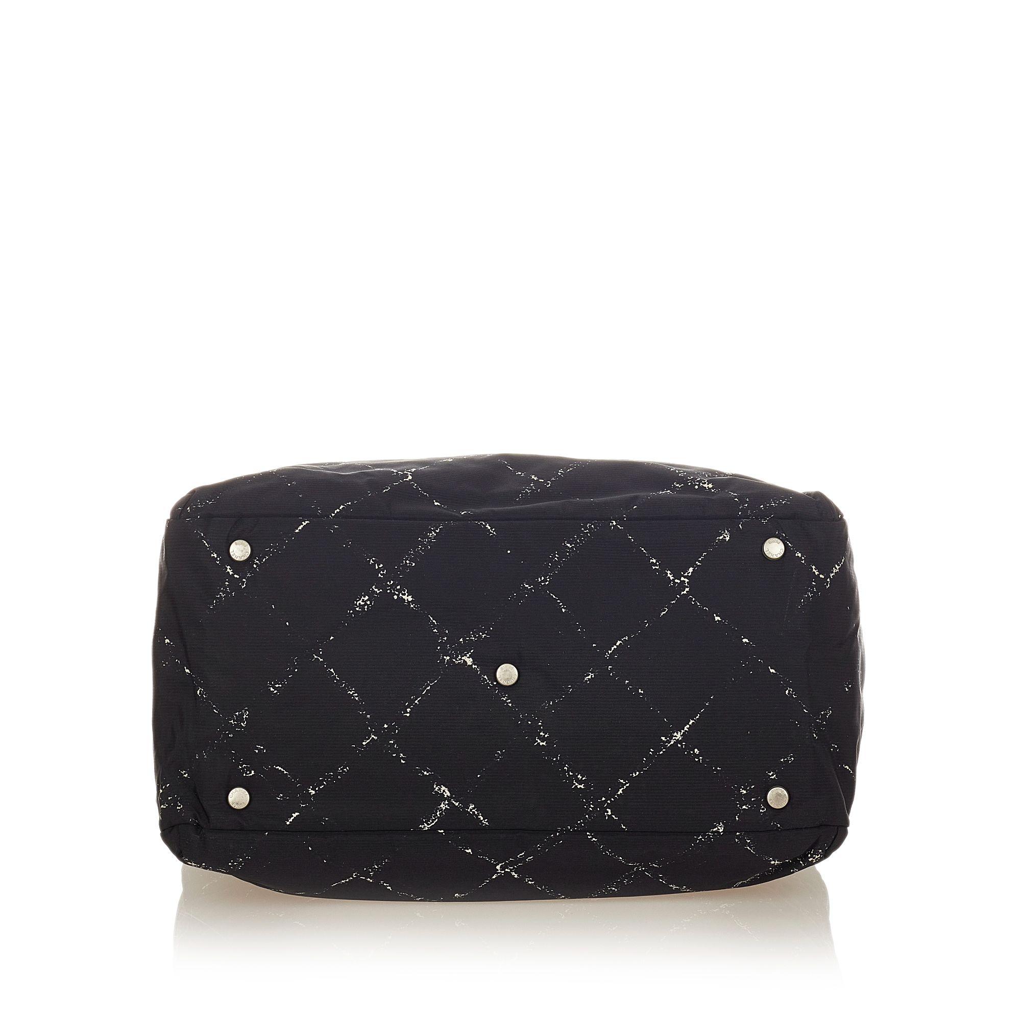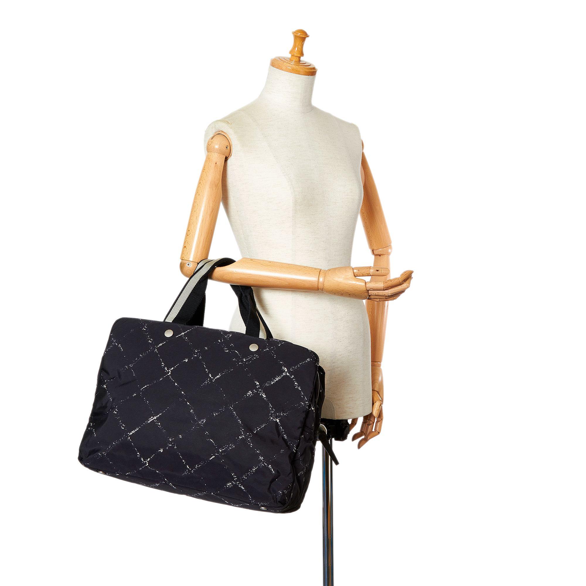 The Old Travel Line handbag features a nylon body, flat straps, a top zip closure, and interior zip pockets.