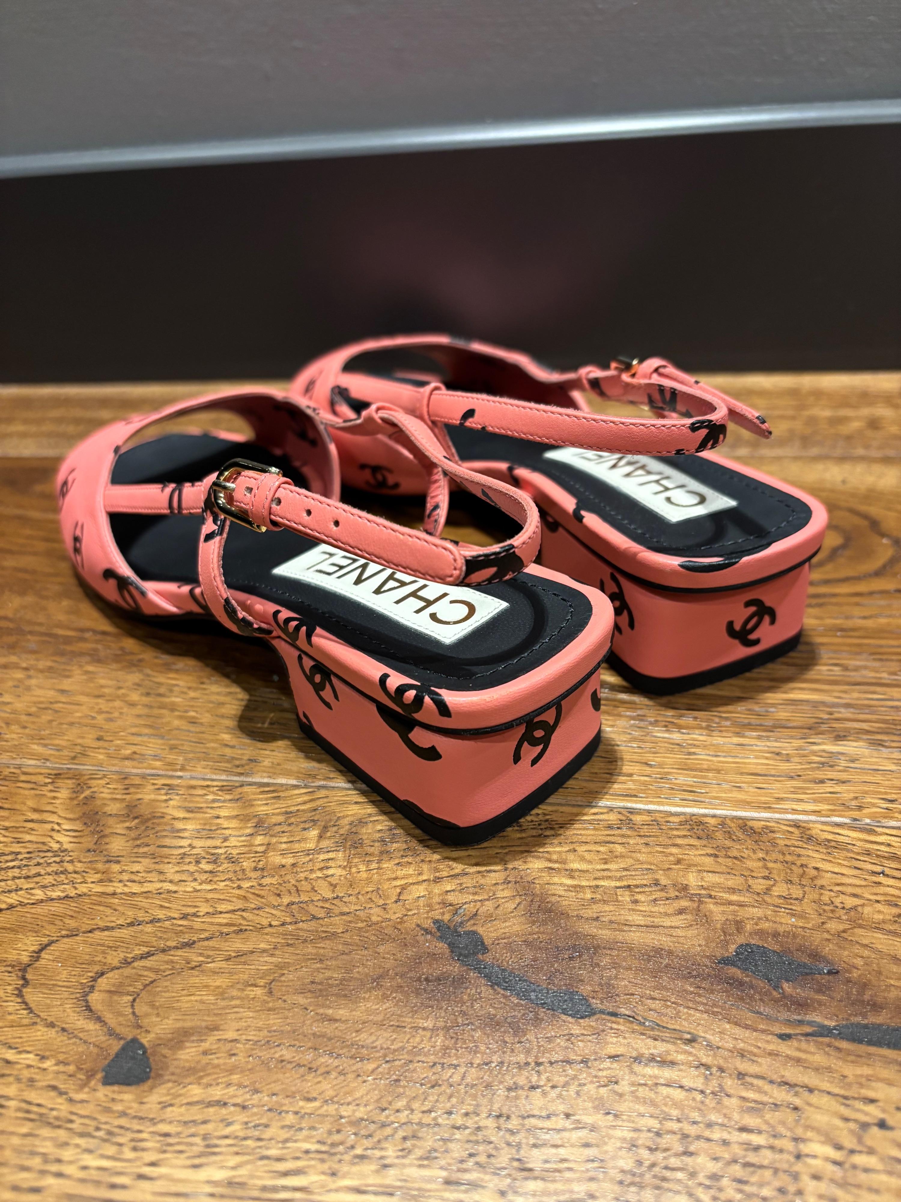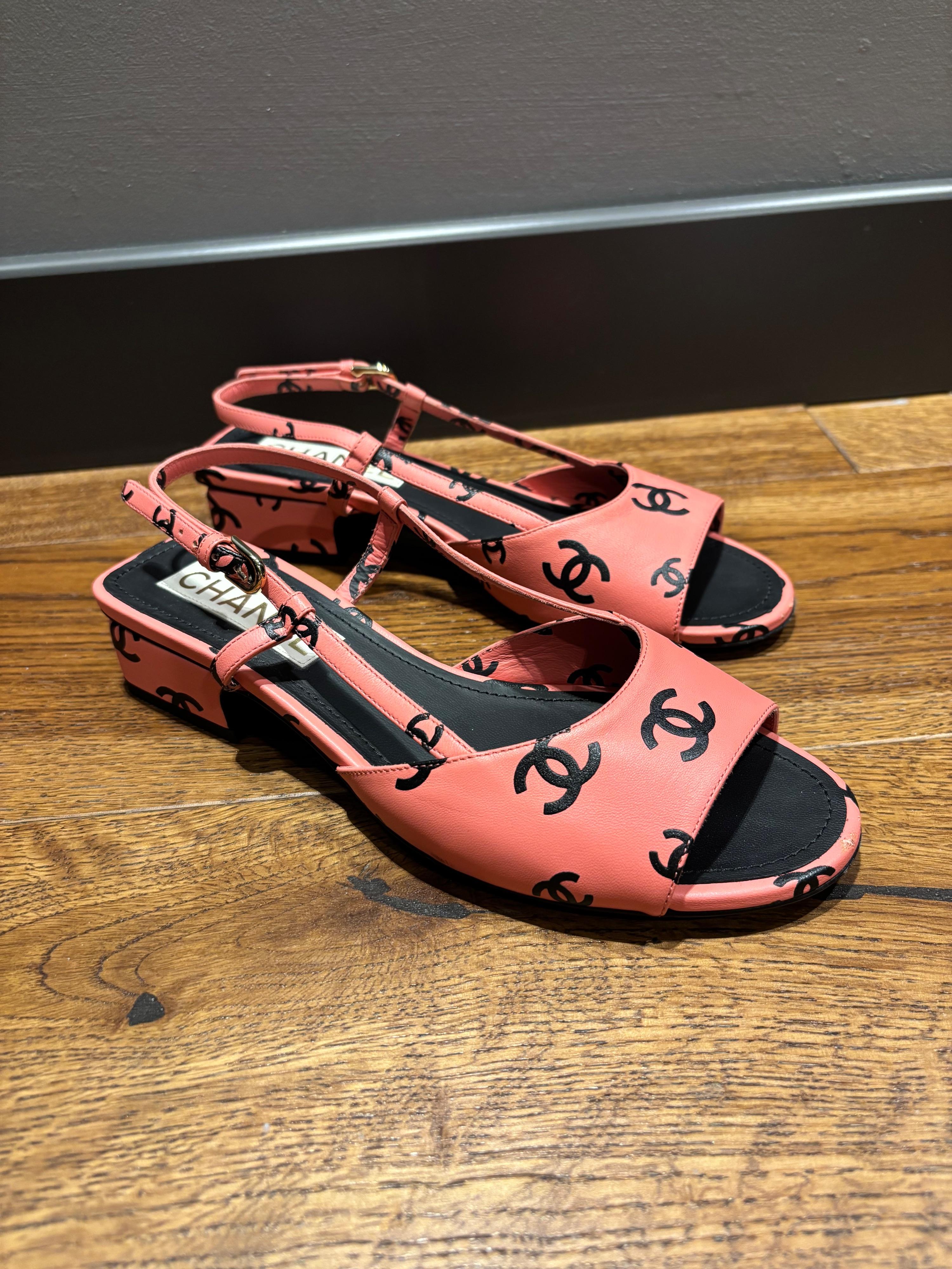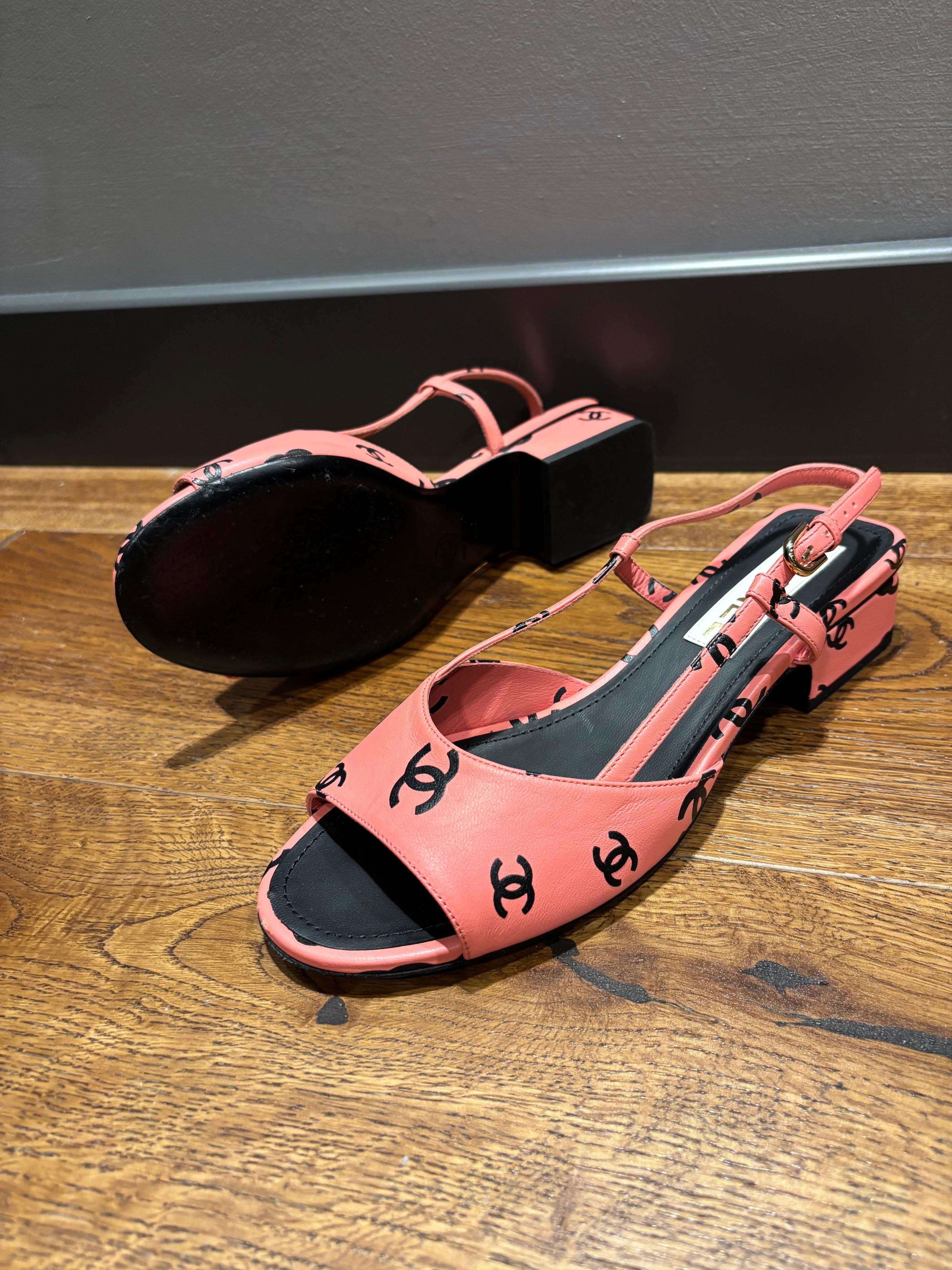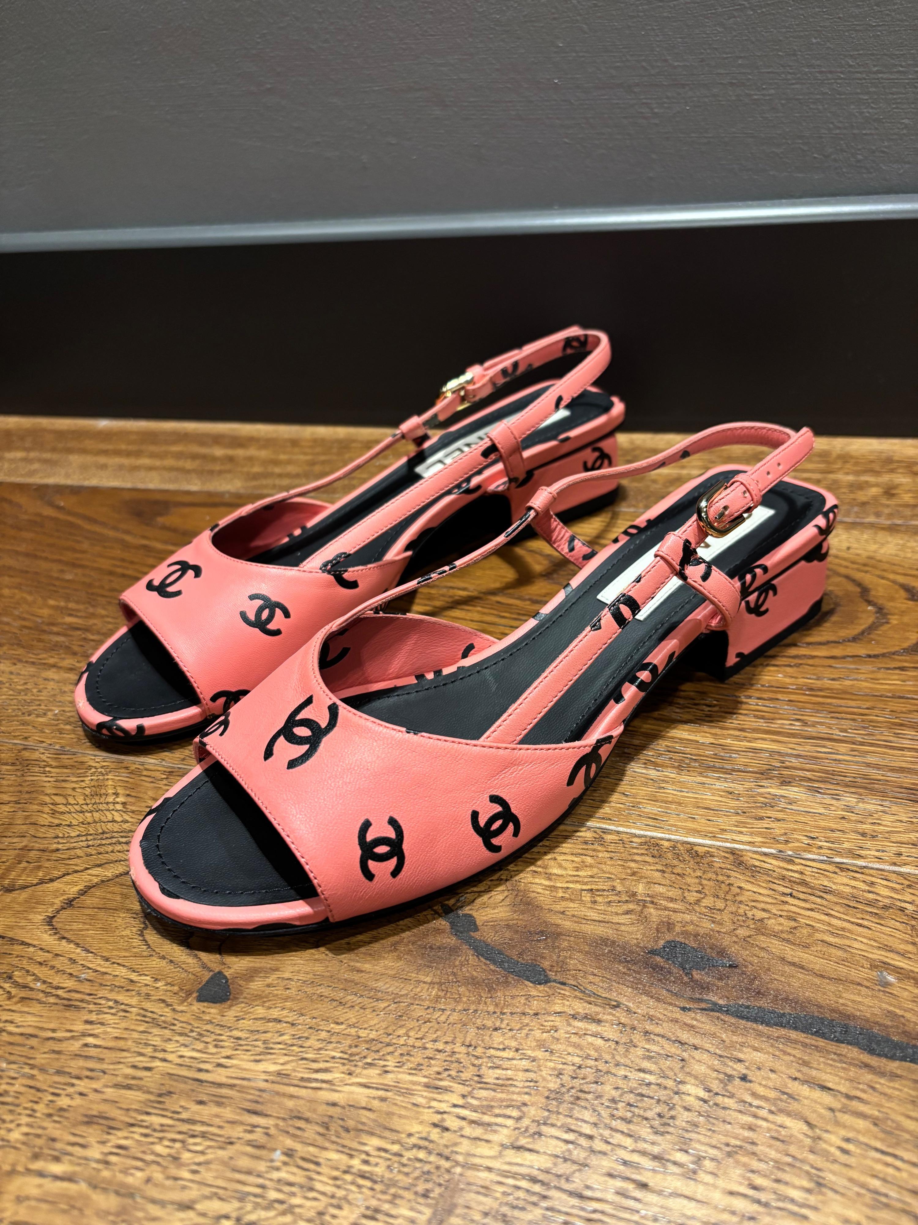 Pink leather Chanel slingback sandals with black CC logo print, adjustable ankle strap, and a low block heel. Made in Italy. Includes dust bag.