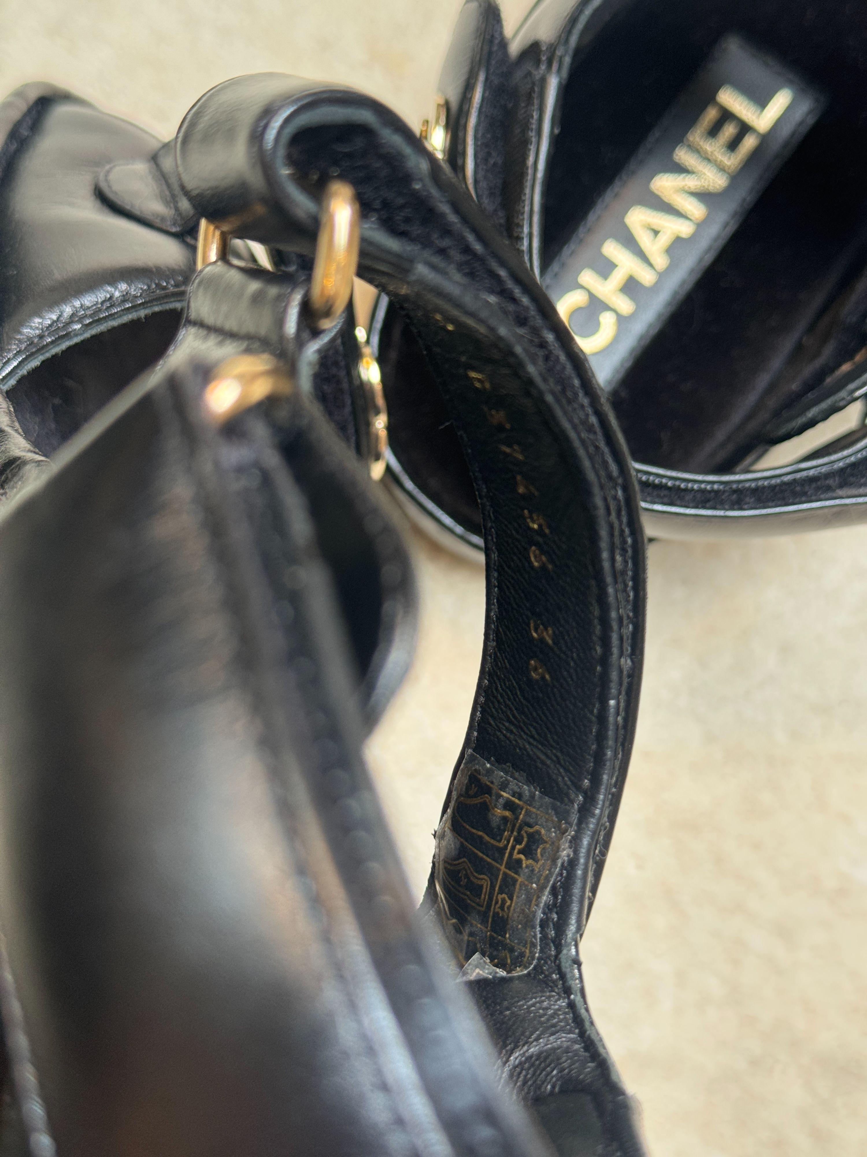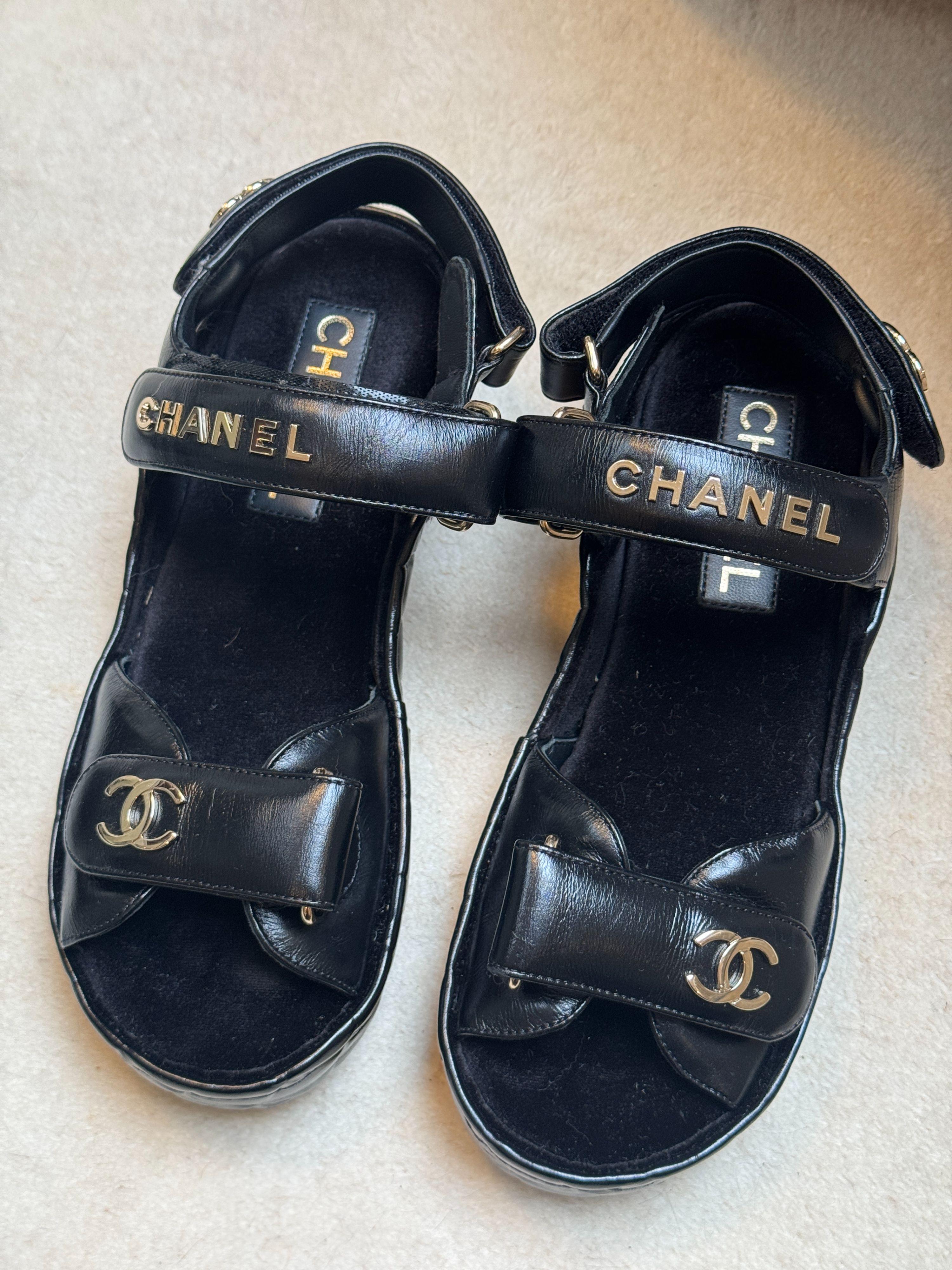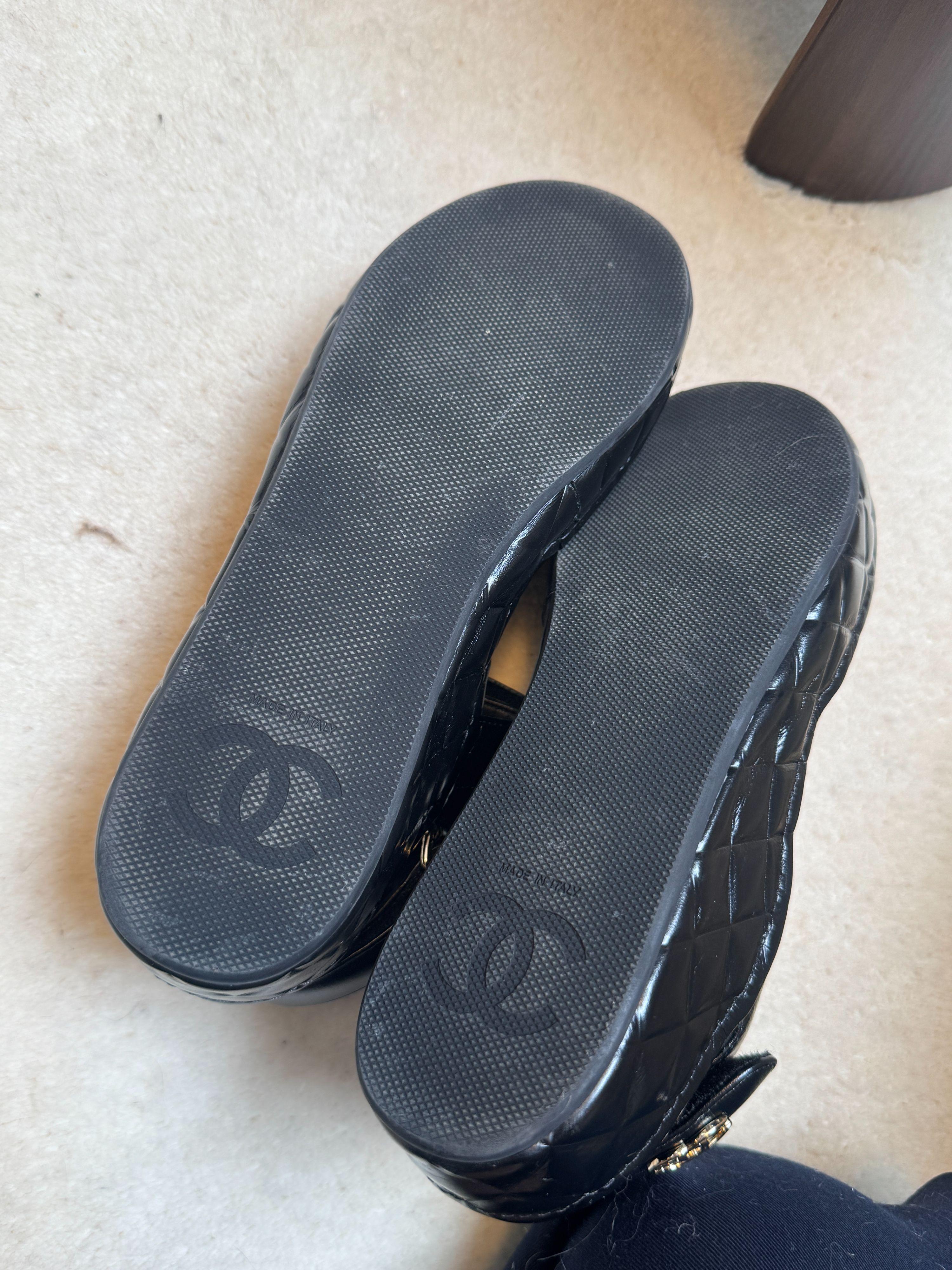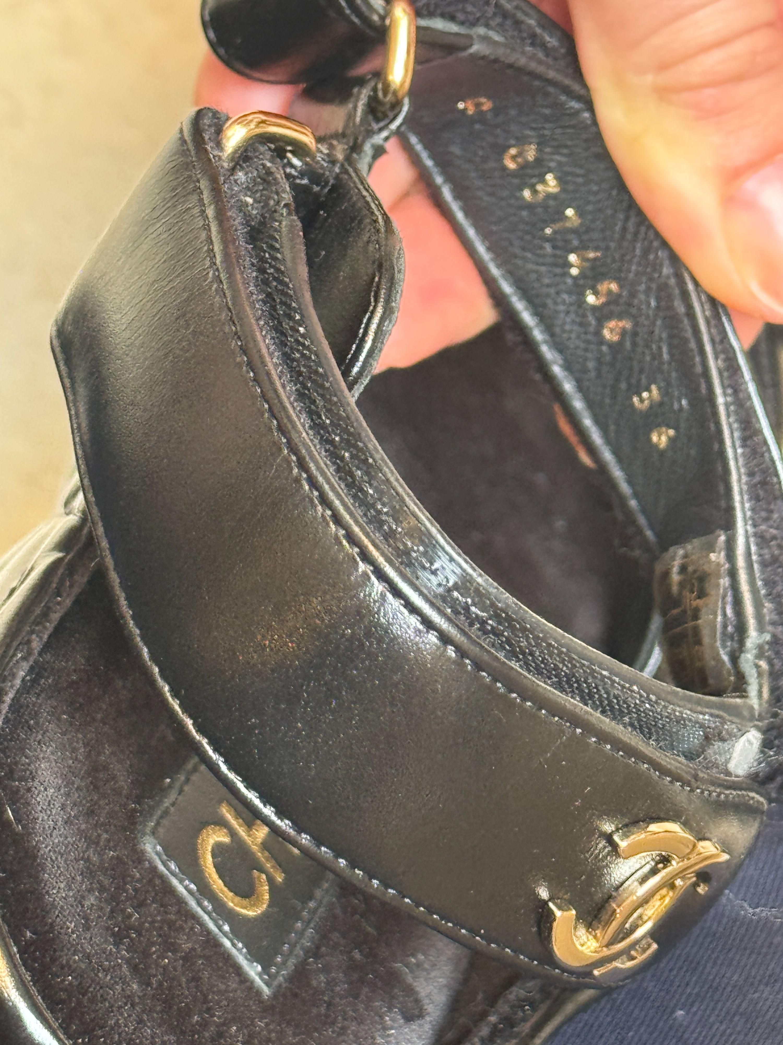 Chanel Black Quilted Leather Logo Velcro Strap Wedge Sandals. Pristine condition