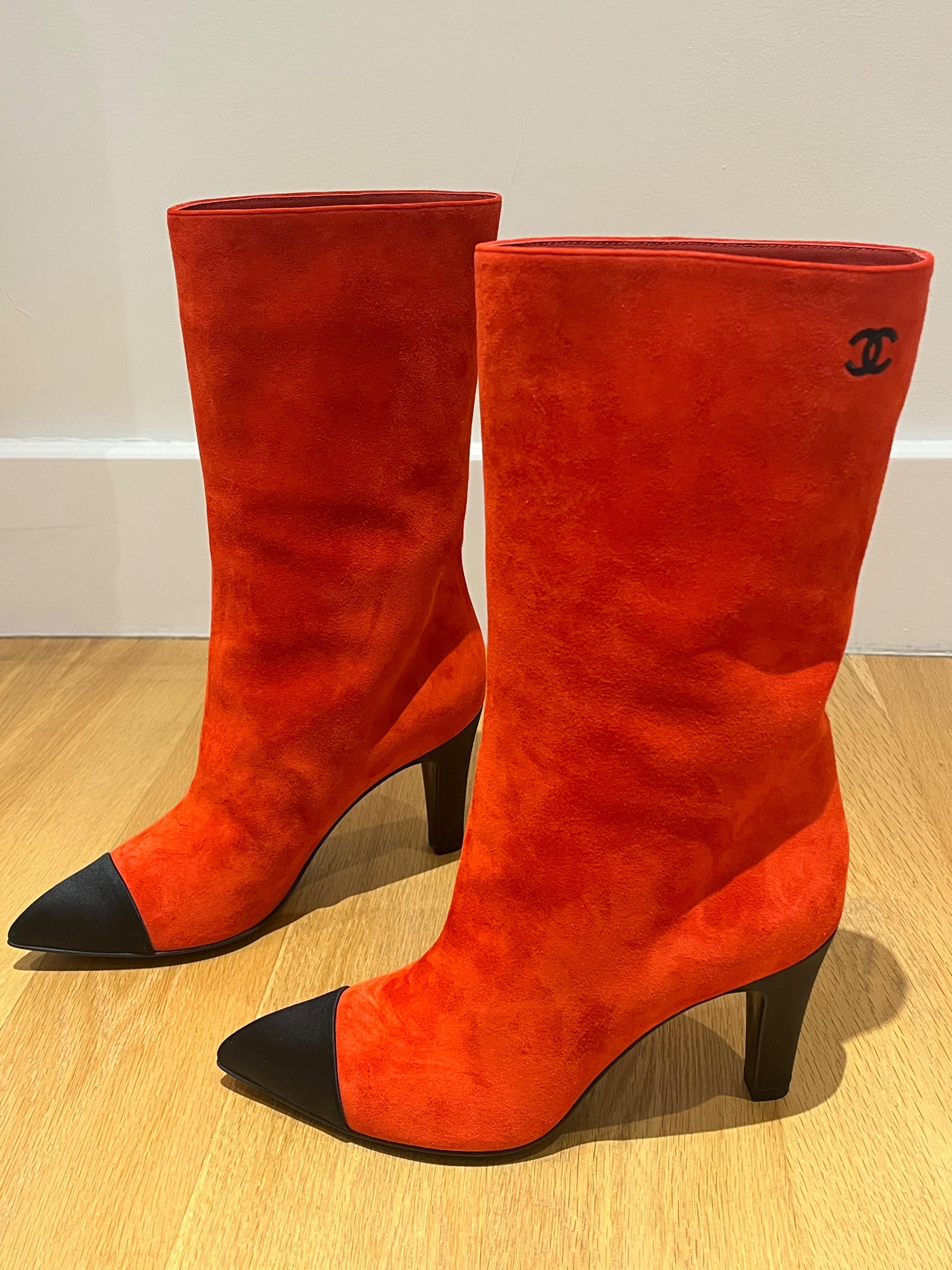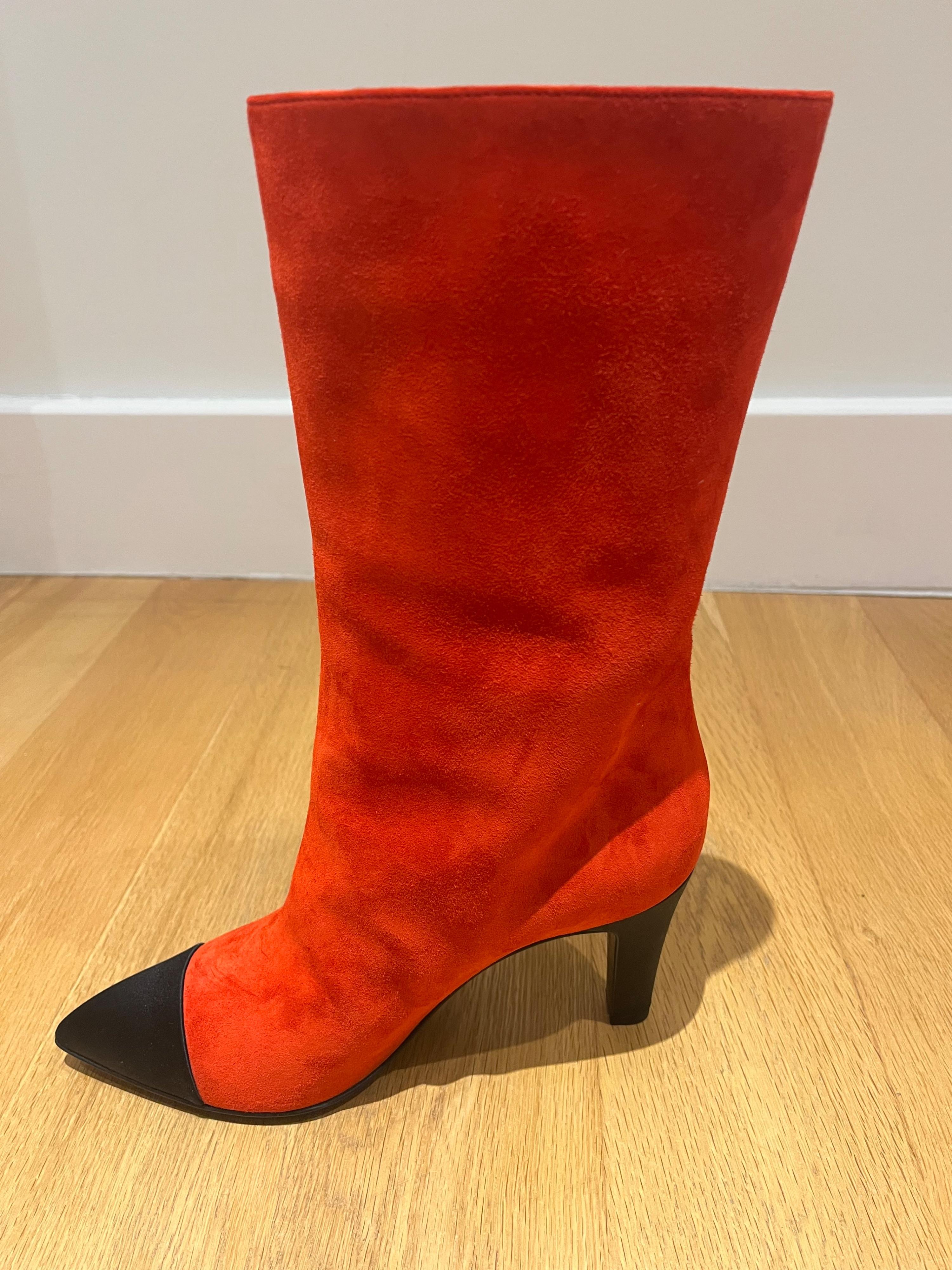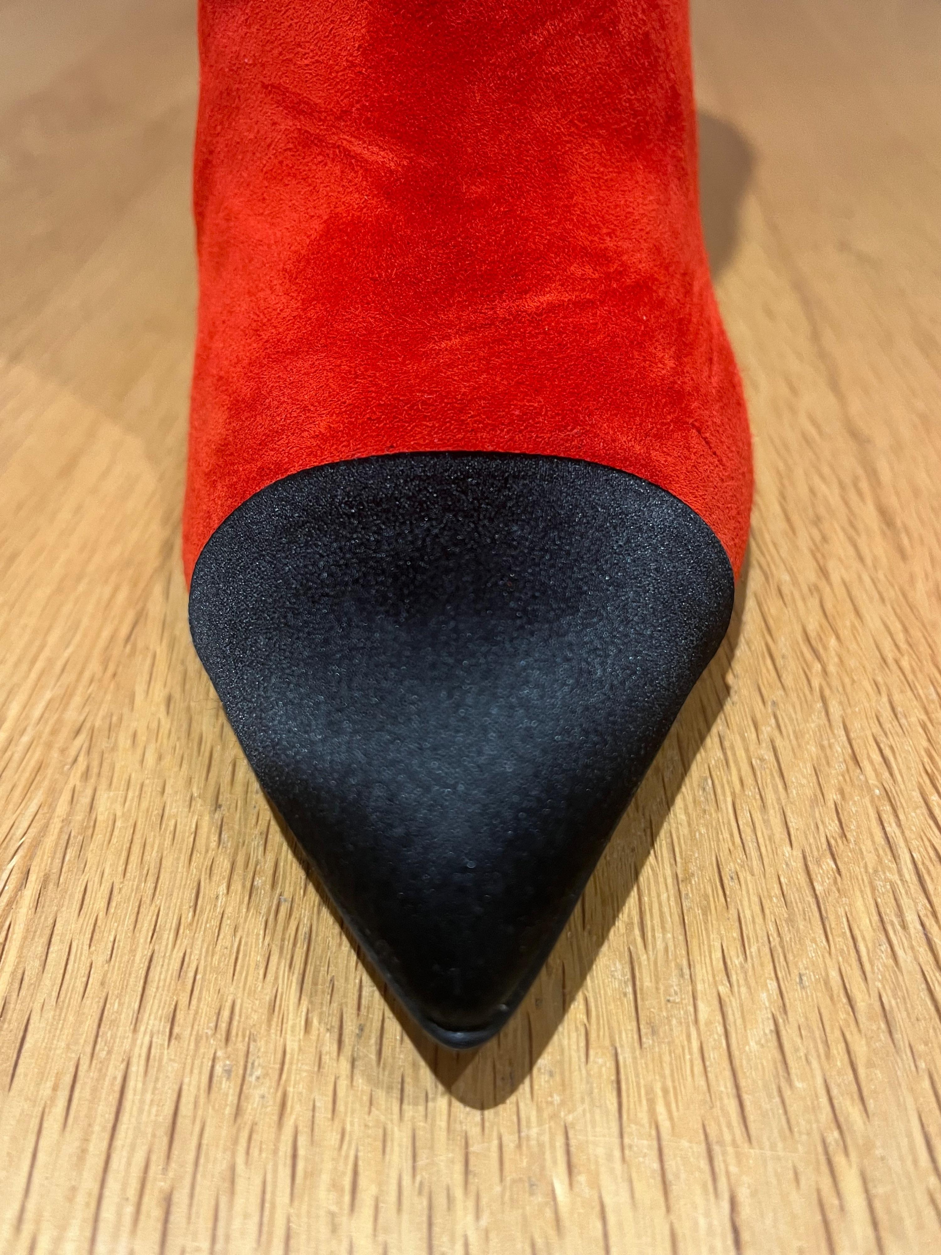 Chanel Red Suede Gabrielle Heeled Boots with Black Pointed Toe Cap Size EU 38.5 - never worn