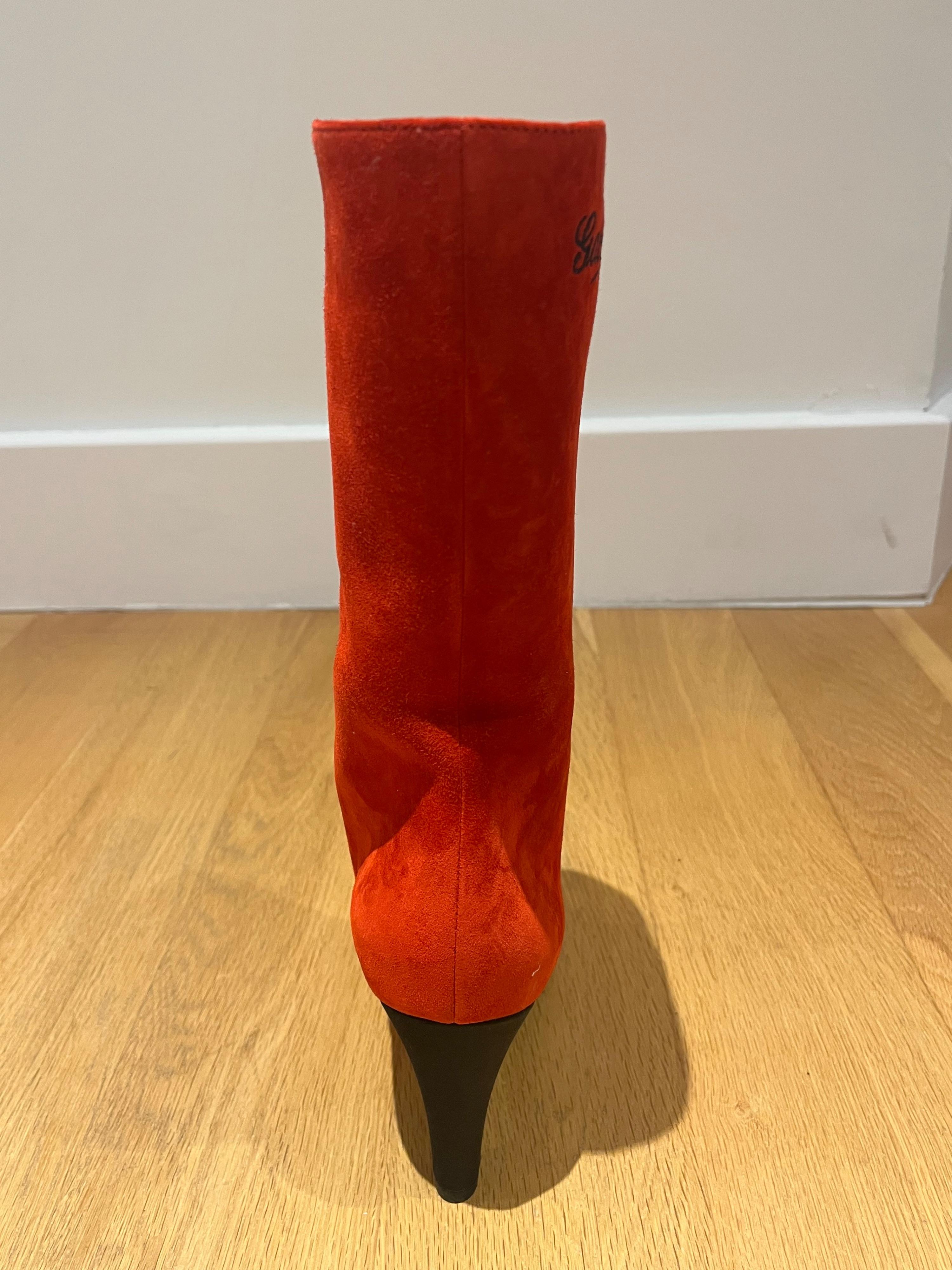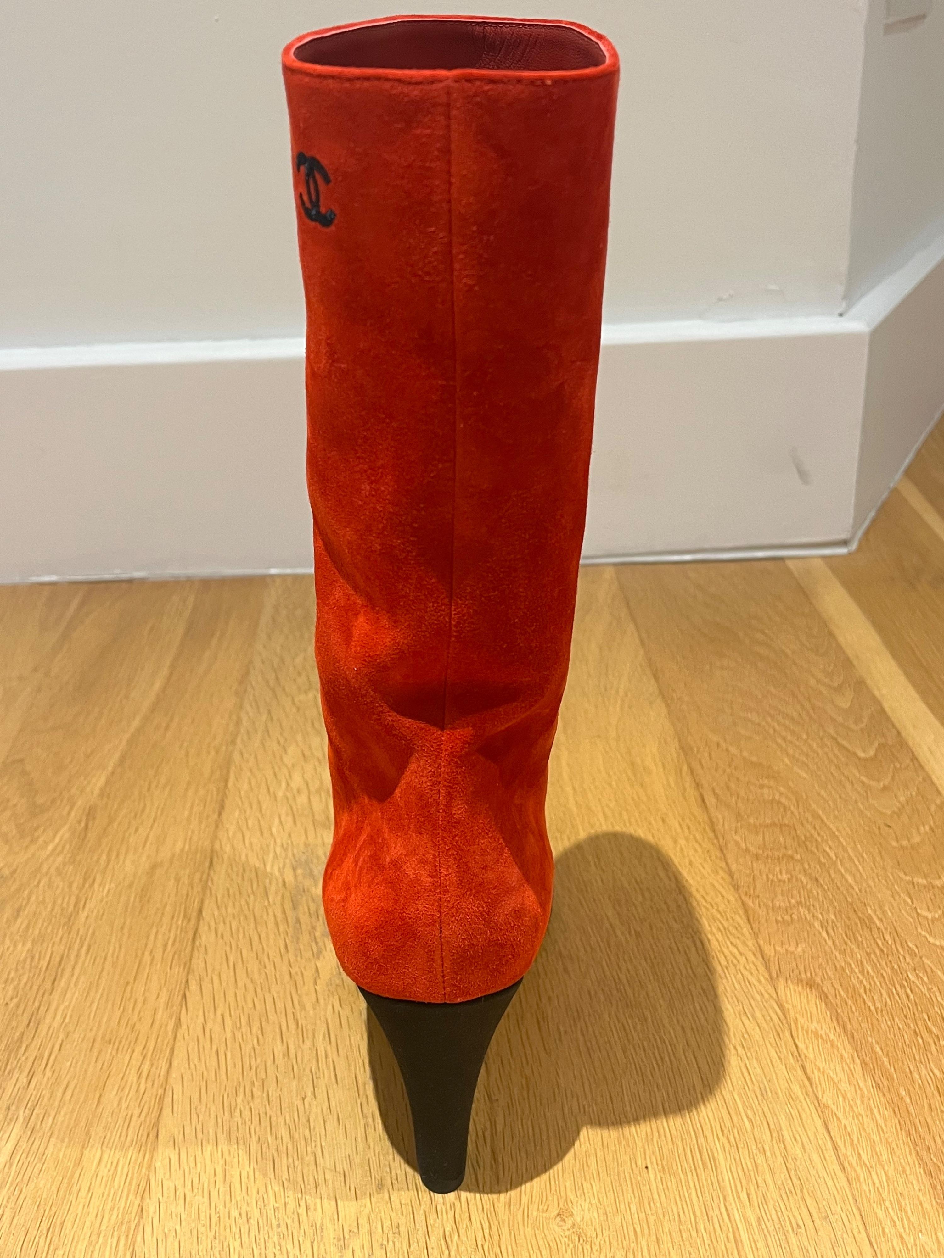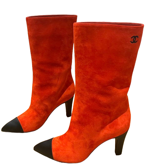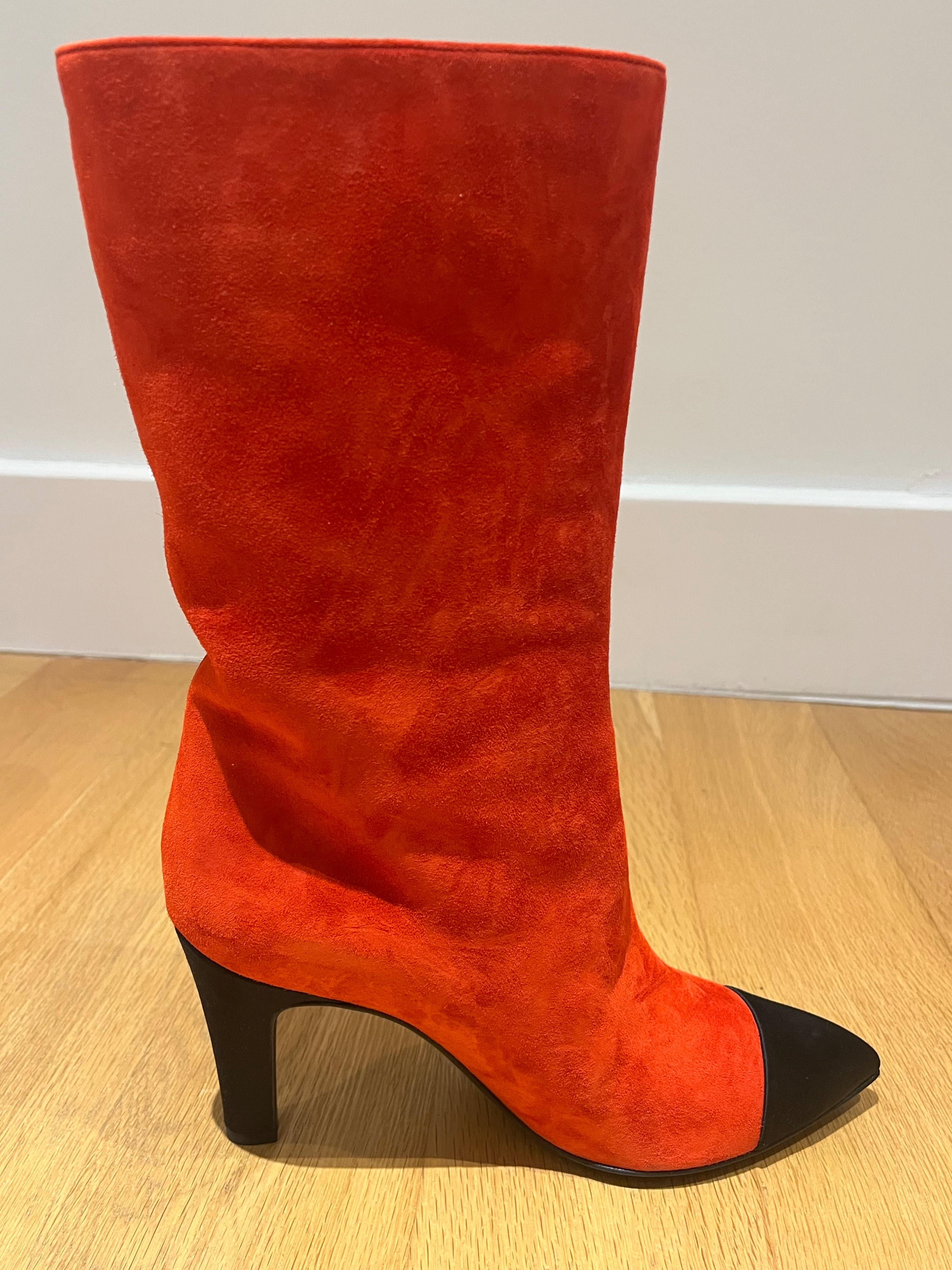 Chanel Red Suede Gabrielle Heeled Boots with Black Pointed Toe Cap Size EU 38.5 - never worn