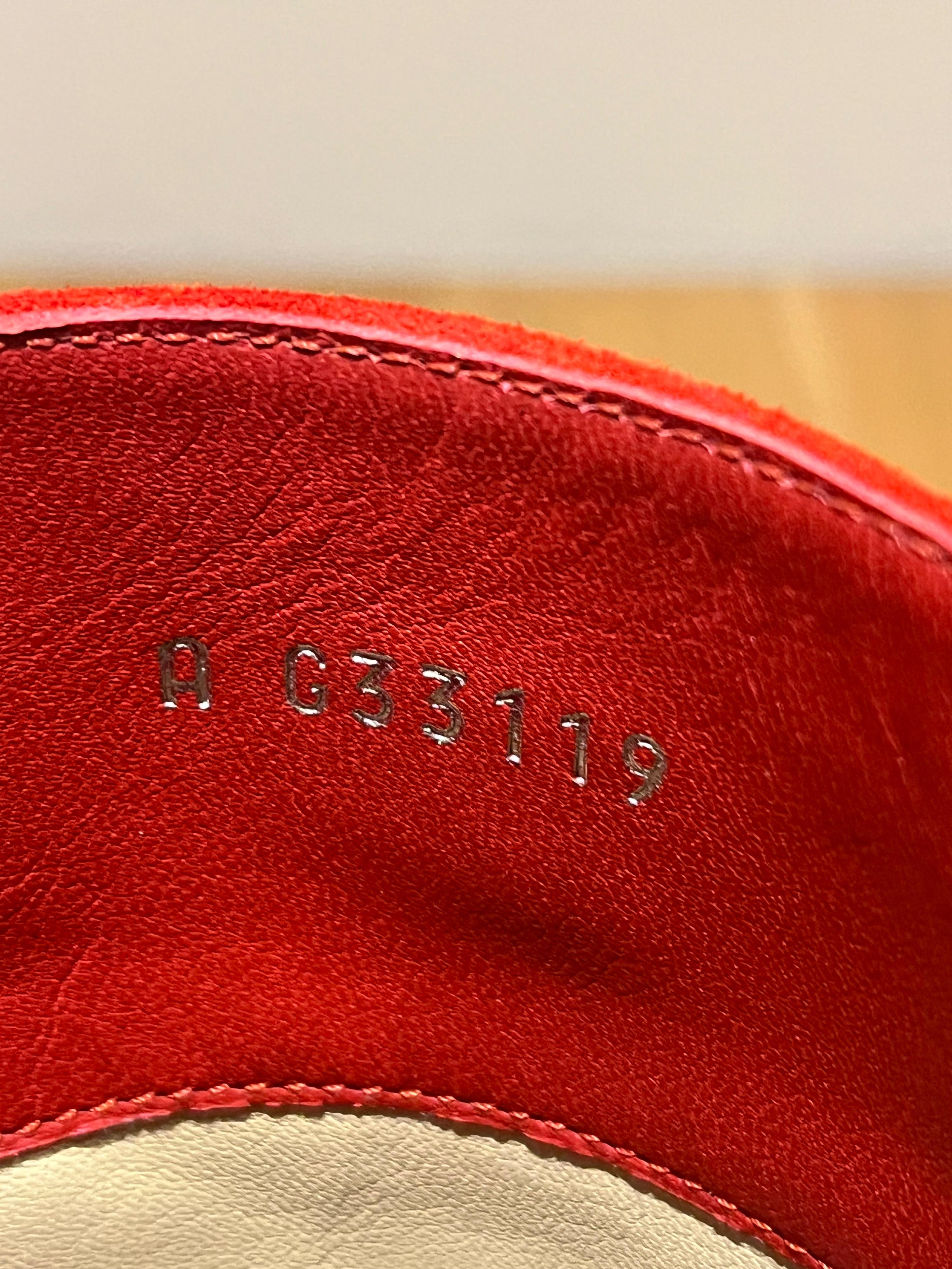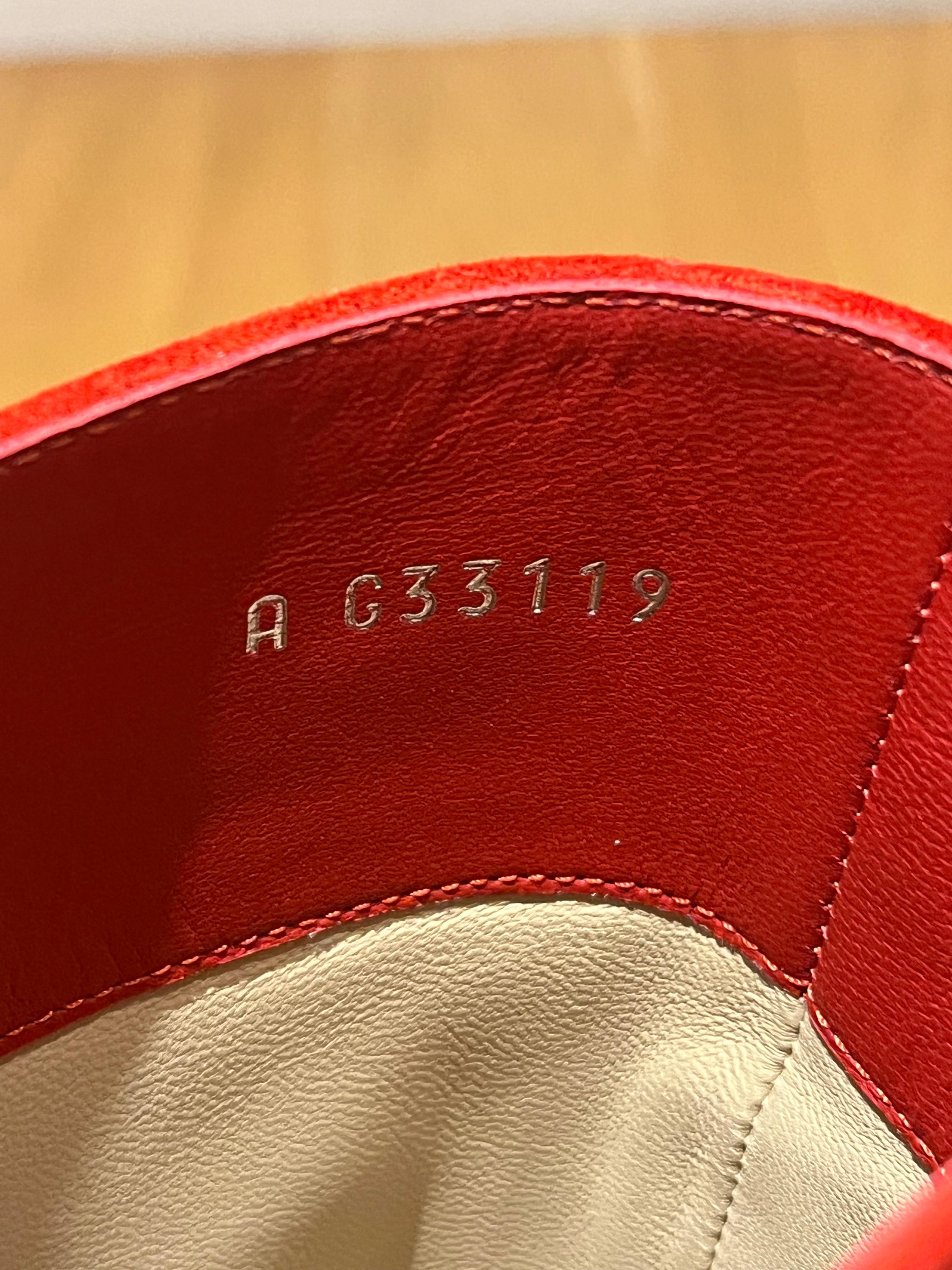 Tomato red colour, suede upper and heels, black pointed to caps, leather sole. Leather lining inside. Made in Italy.