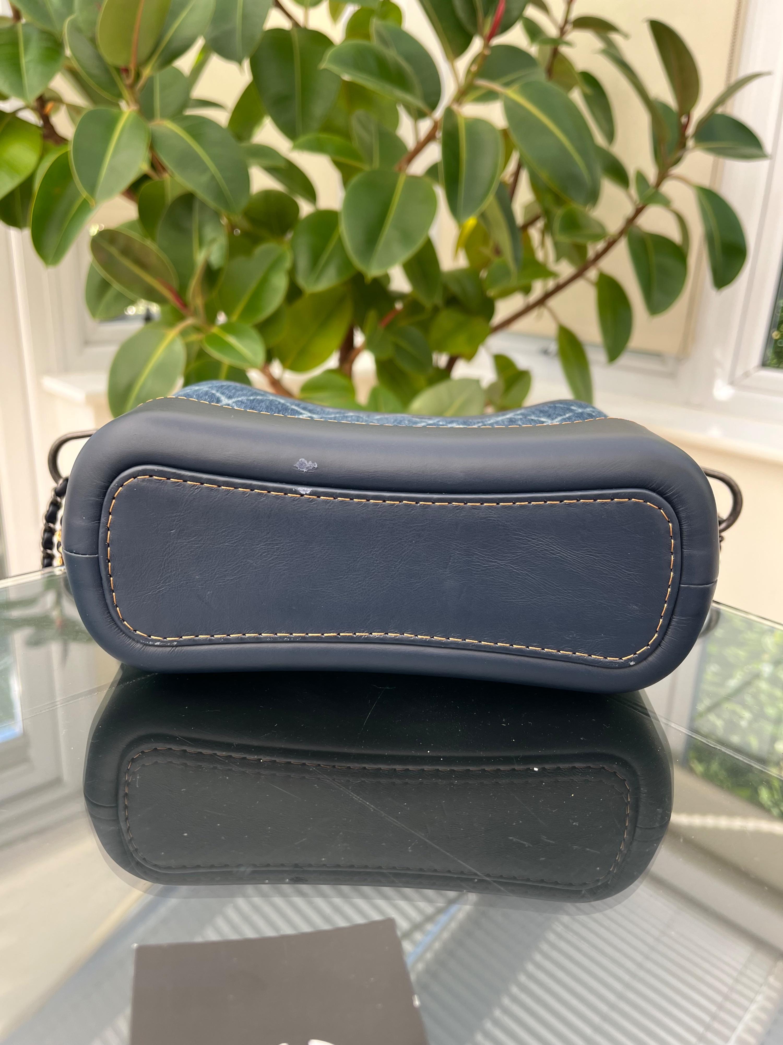 CHANEL Denim Calfskin Small Gabrielle Hobo in Blue. This chic shoulder bag is featured in diamond stitched tweed in denim blue with a sturdy smooth blue calfskin base. The cross body bag features thin polished gold tone, silver tone and ruthenium chain link and blue leather threaded shoulder straps with a shoulder pad. The top zipper has a blue leather, matte gold CC logo zipper pull that opens to a spacious fabric interior with zipper and patch pockets. This elegant and functional shoulder bag is both versatile and chic, from Chanel! Never used as such is perfect condition apart from small scuff on base where bag was dropped! Measurements: 8” x 6.5" x 3" Drop: 16.5" or 26.5" Comes With Authenticity Card