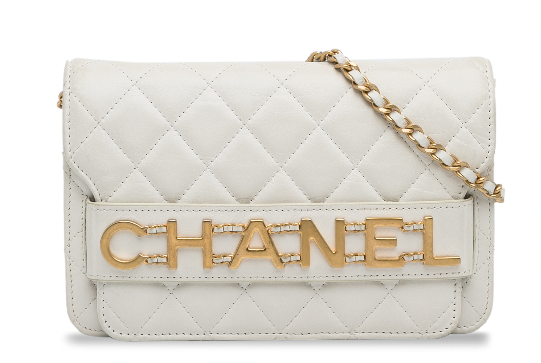 This Wallet on Chain features a quilted lambskin leather body, a front flap with slip-through closure, front and back slip pockets, an interior zip compartment, and interior slip compartments.