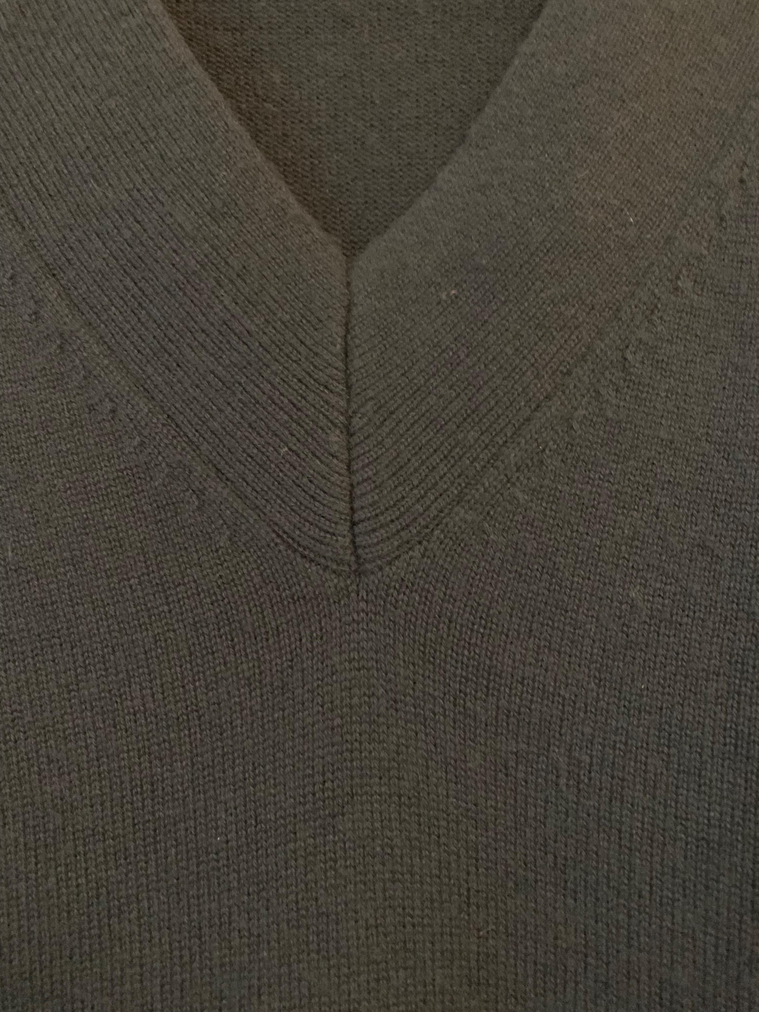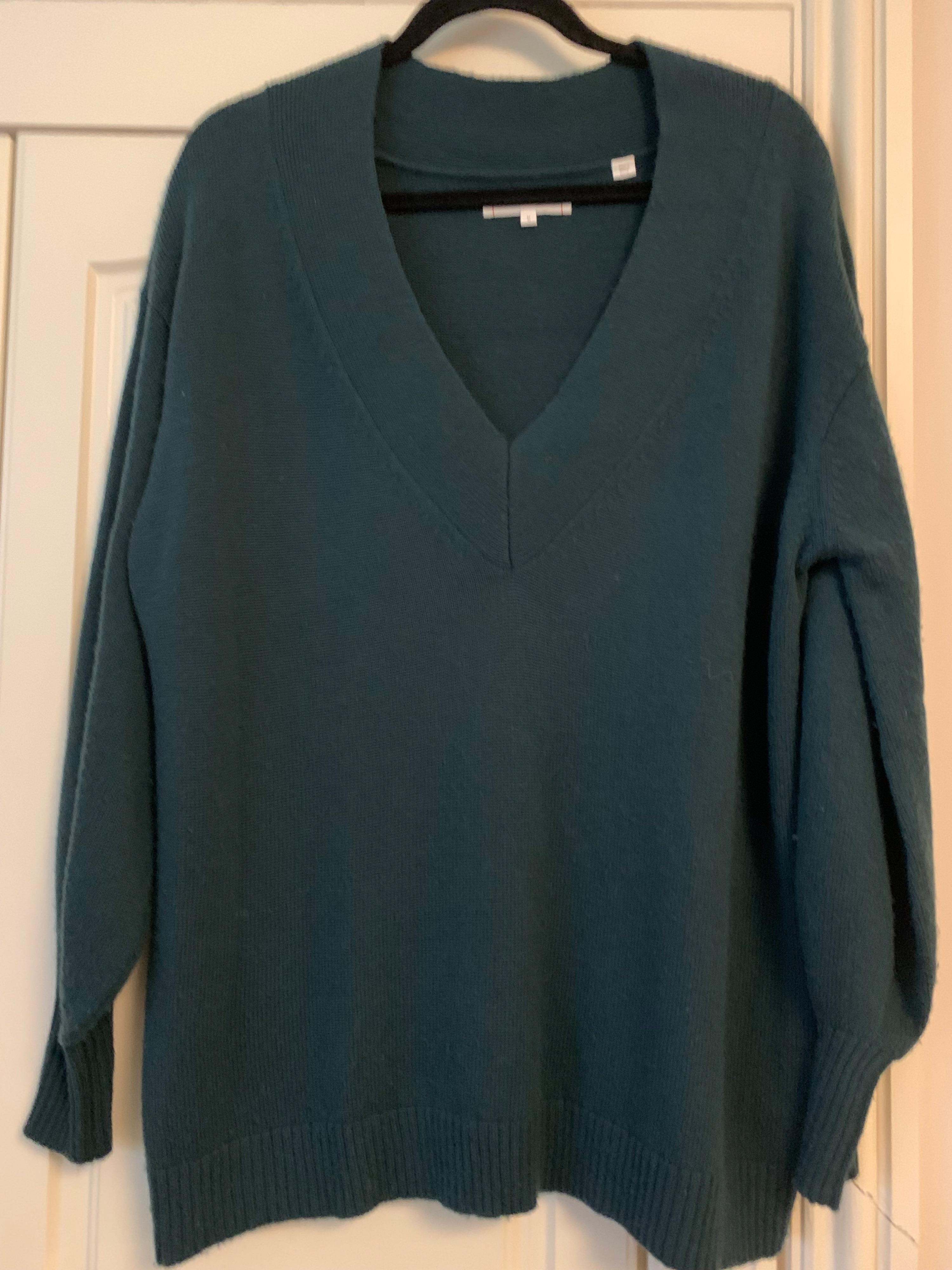A emerald green jumper with a deep V-neck and balloon cuffs loose fit in a medium would fit 12/14