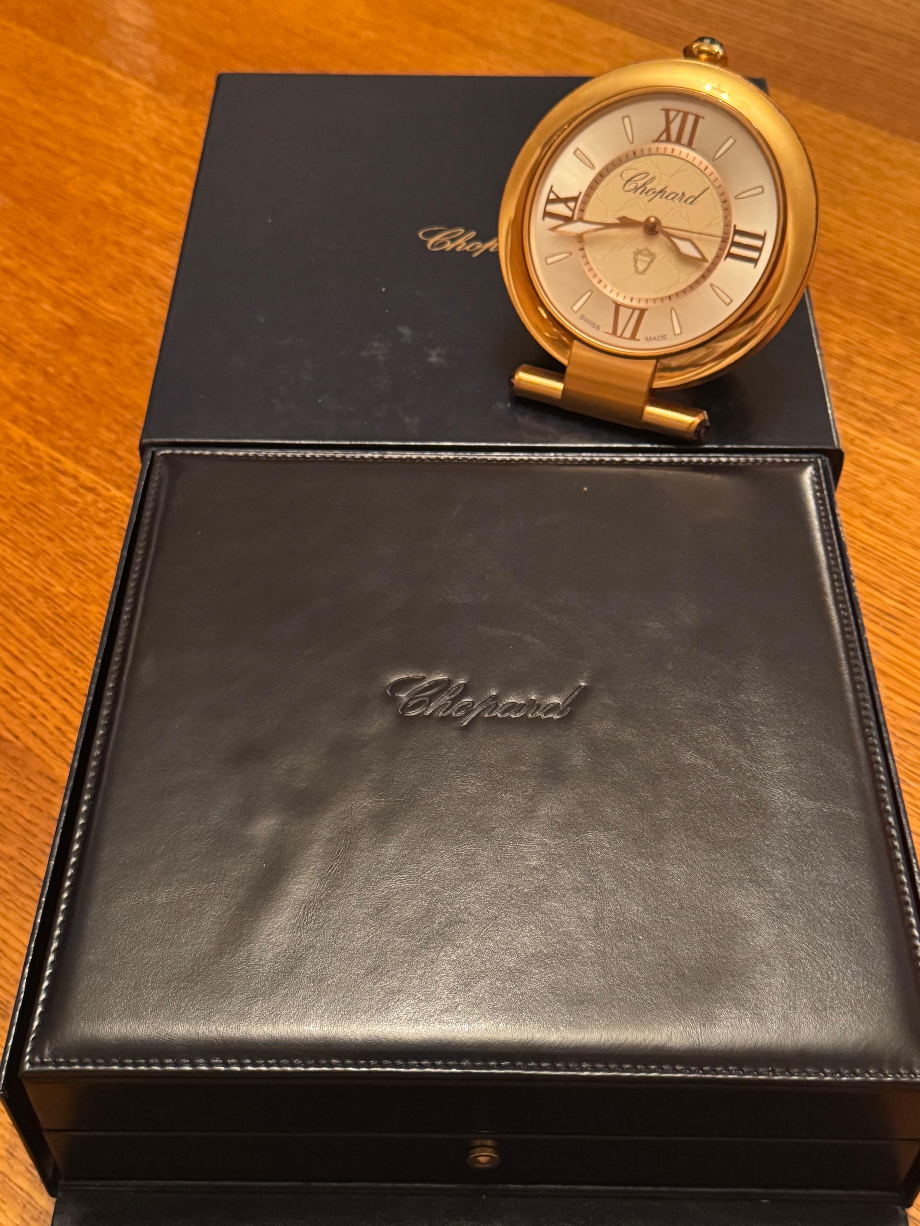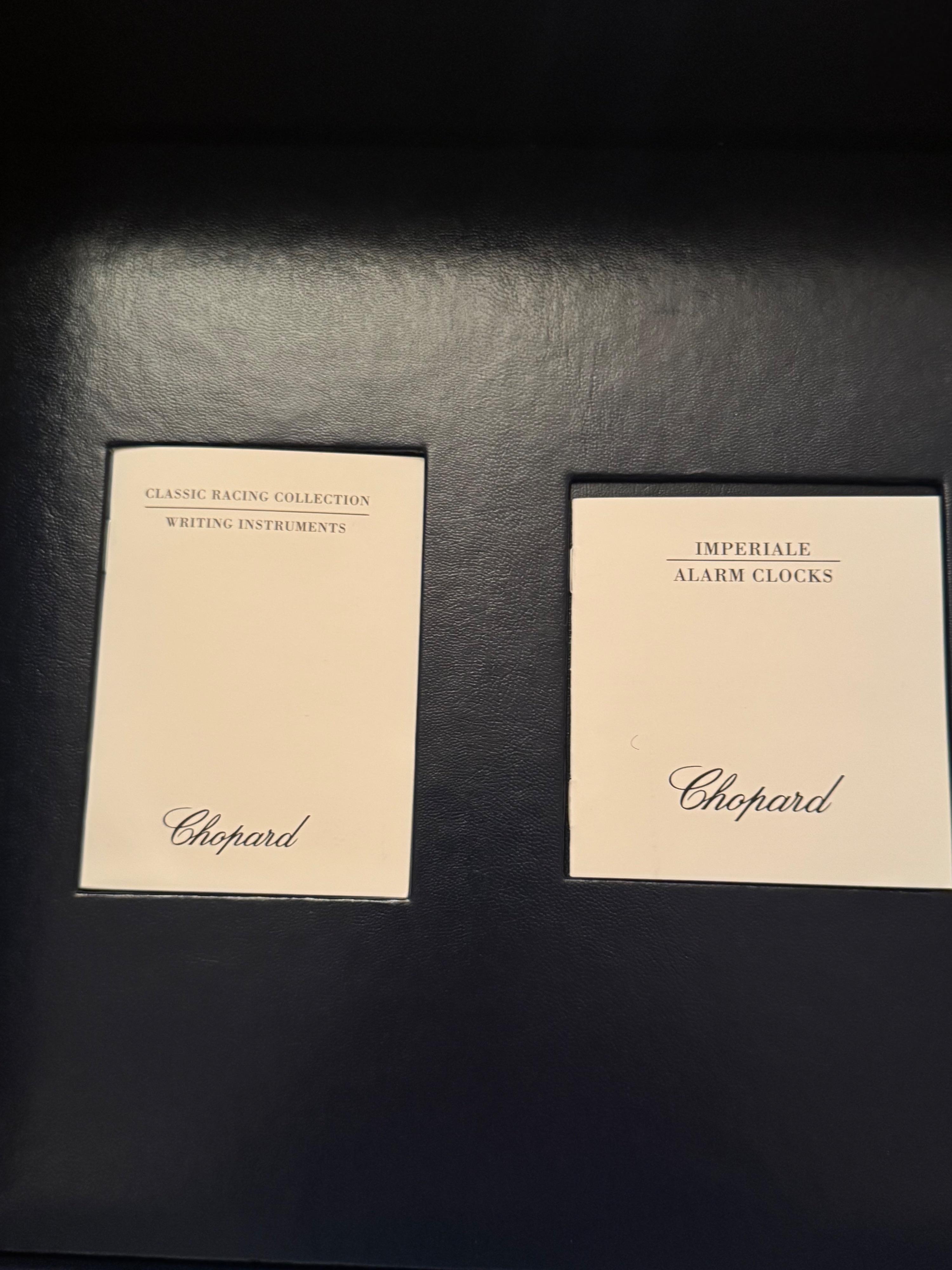 A majestic presentation compendium comprising a Chopard Imperiale travelling alarm clock and a Chopard pen.