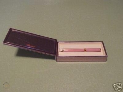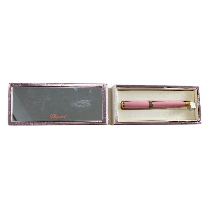 This is a very interesting and rare Chopard pen and mirrored box set that was part of the gift bag at the Elton John AIDS Foundation's 2008 Oscar party in Hollywood. The pen is petite, pink, and retractible. It fits into this very elegant Chopard box. The Chopard name is on the top, in glimmering stones. When the box is opened, it is a mirror on the back side of the panel. The base that holds the pen can be removed to reveal a hidden chamber below. So you can carry your pen, check yourself out in the mirror, keep something secret in the bottom of the box and look good doing it!