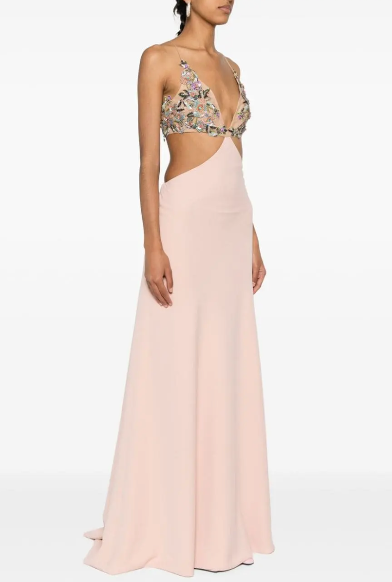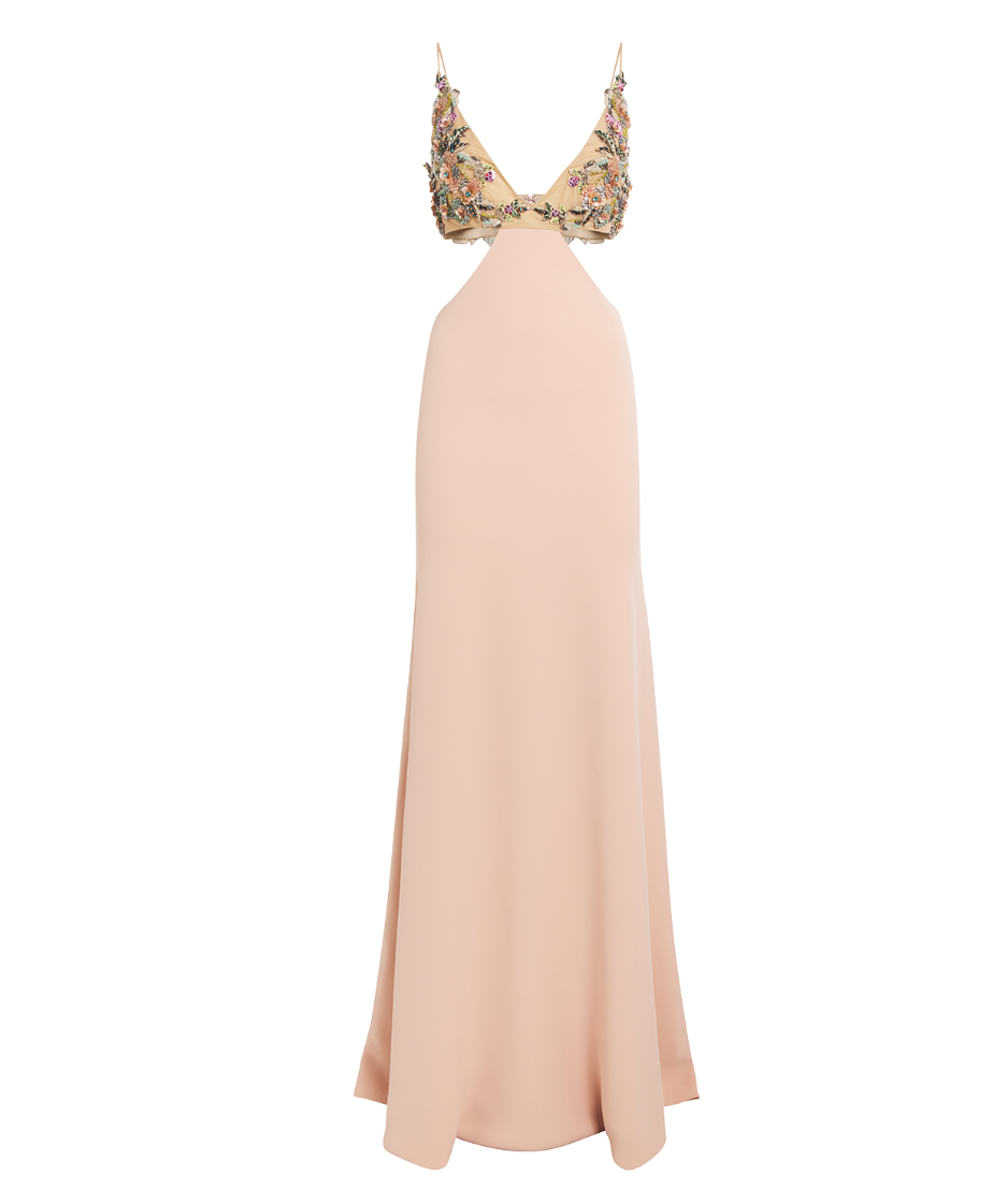 This Costarellos maxi dress features a cady texture, floral appliqué with crystal, bead and sequin embellishment and cut-out detailing. It also features fabric-covered buttons, a plunging U-neck, spaghetti straps, a rear button fastening, a concealed side hook and zip fastening, a long length, flared hem and full lining.