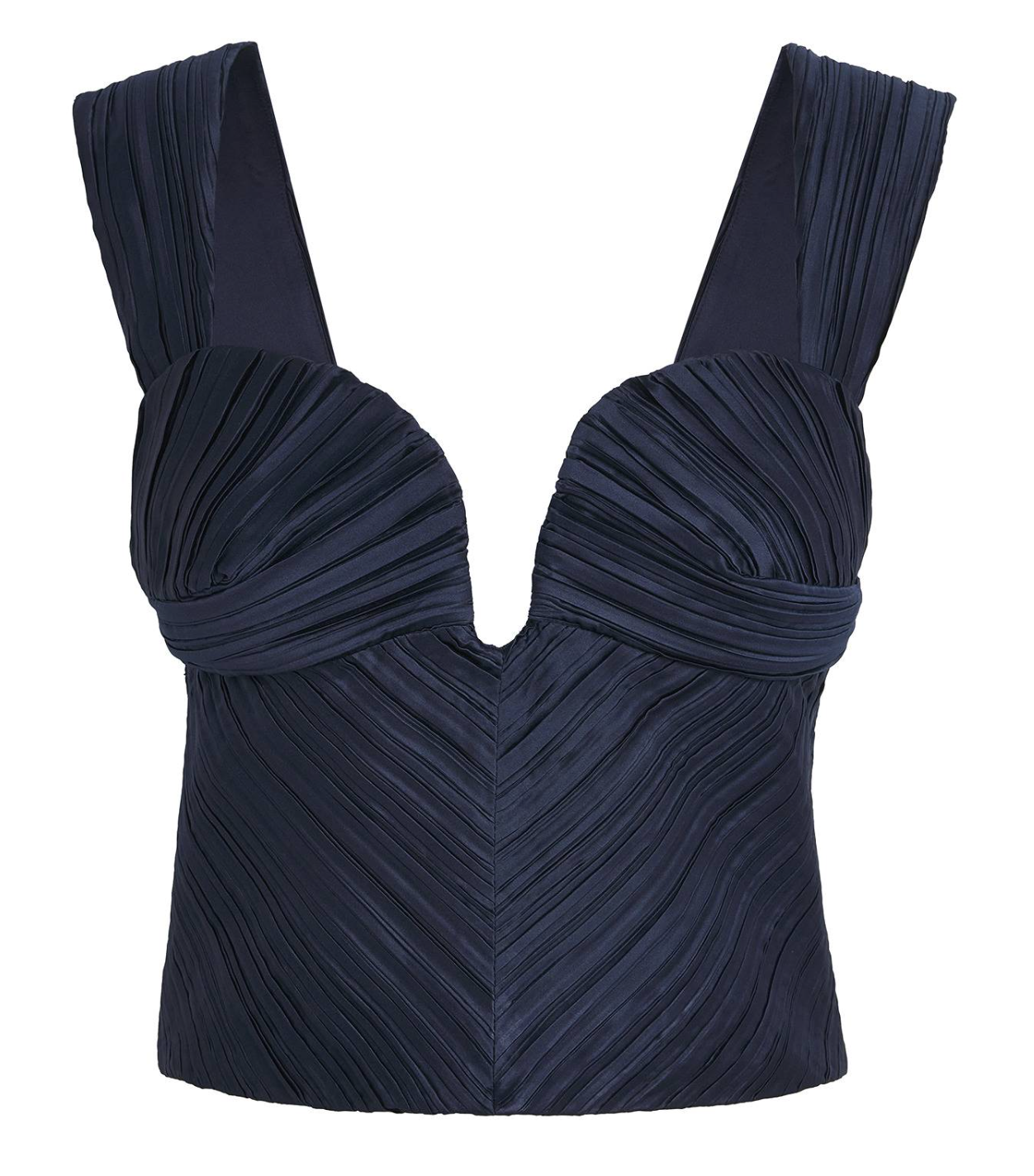 Cult Gaia Navy Blue Pleated Sweetheart-Neck Top