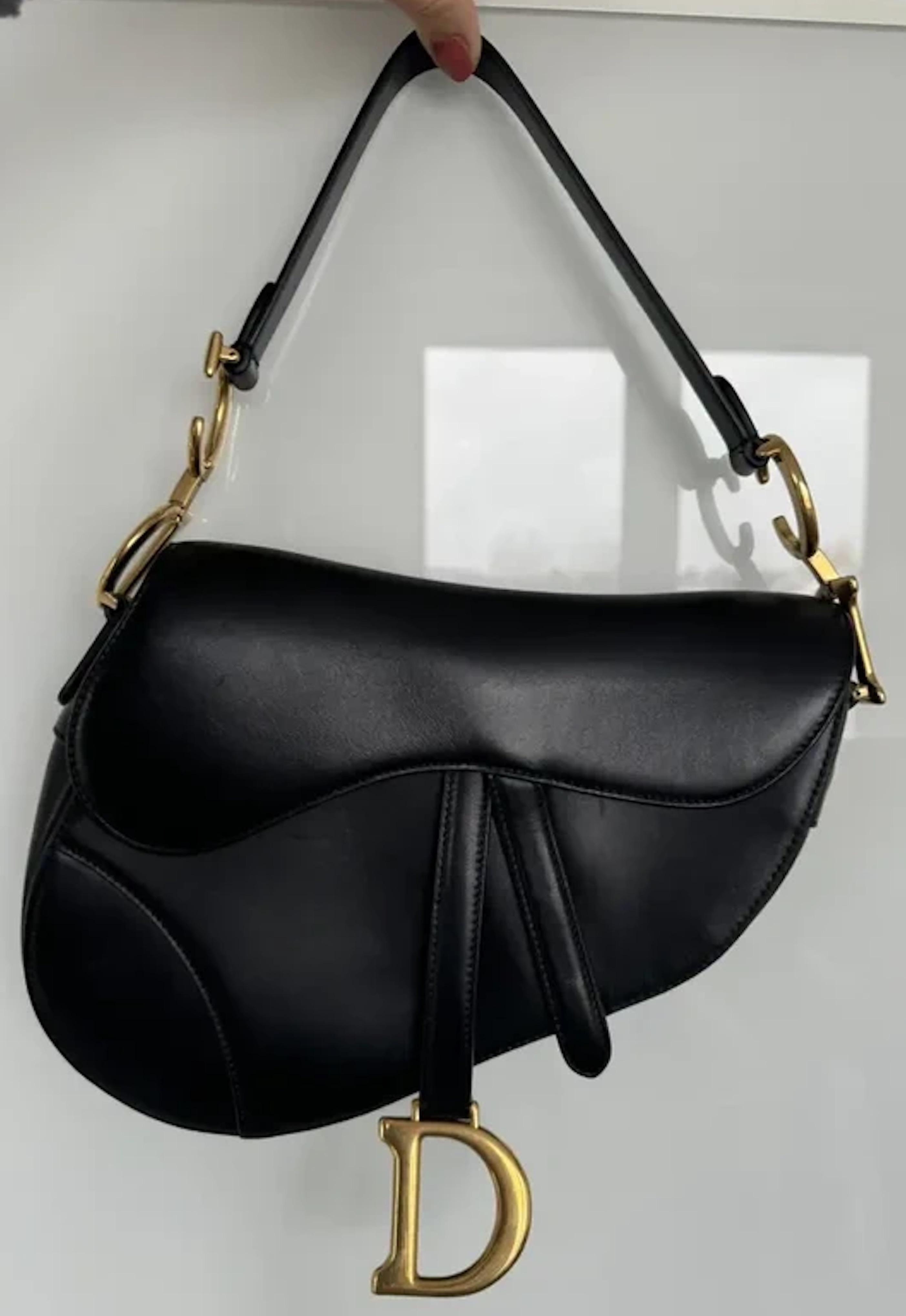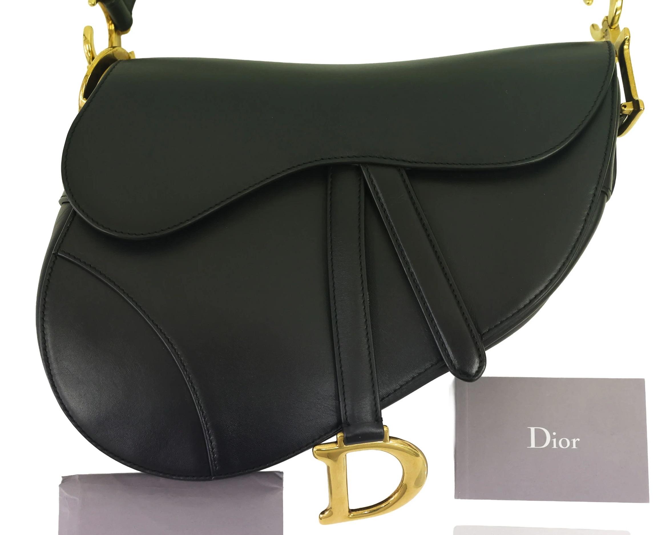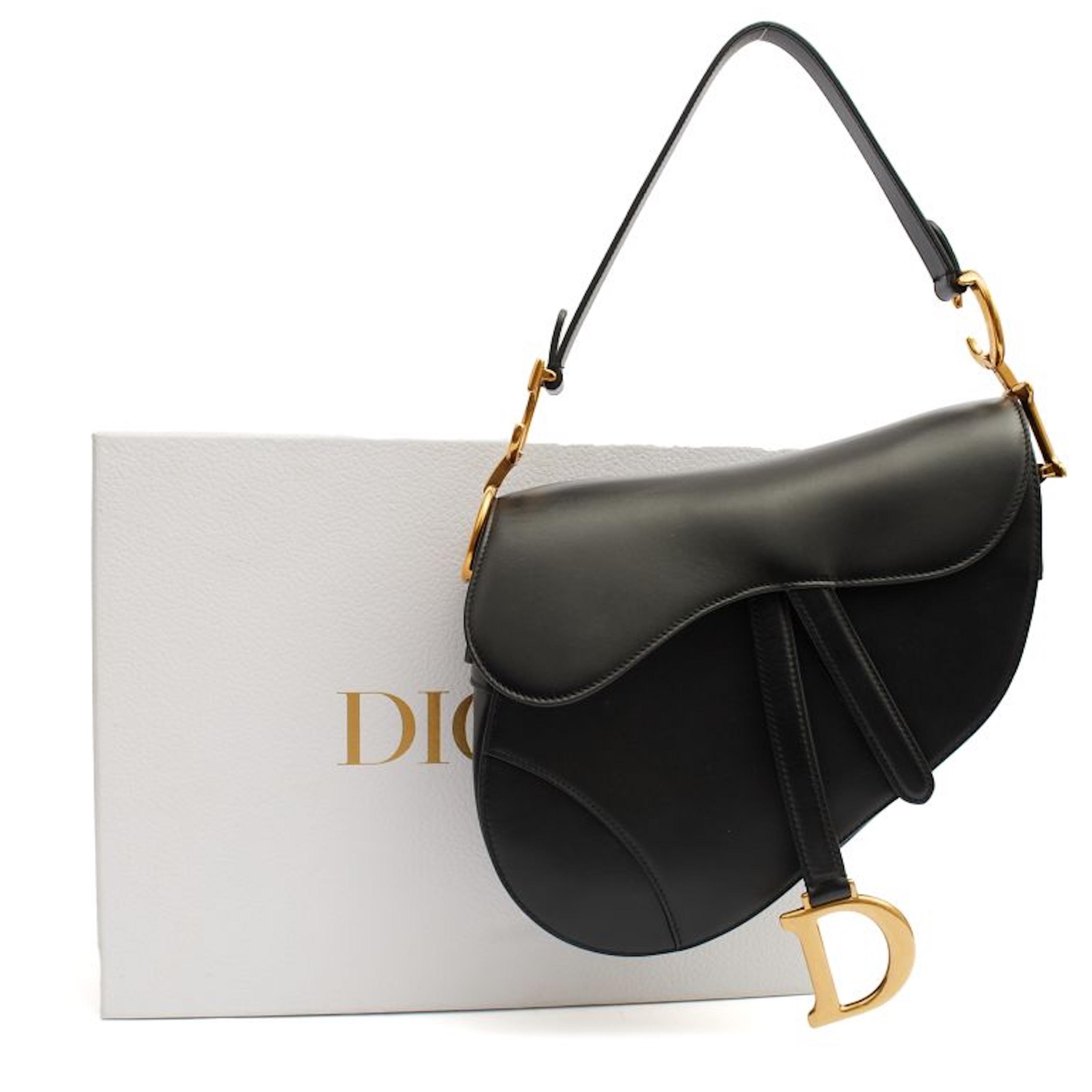 Medium Sized this is a iconic and legendary Saddle Trotter bag is crafted in black Leather calfskin. It features a Saddle flap with a D stirrup strap and magnetic pull, as well as an antique gold-finish metal CD signature on either side of the top handle.the Saddle bag may be carried by hand, worn over the shoulder or crossbody.