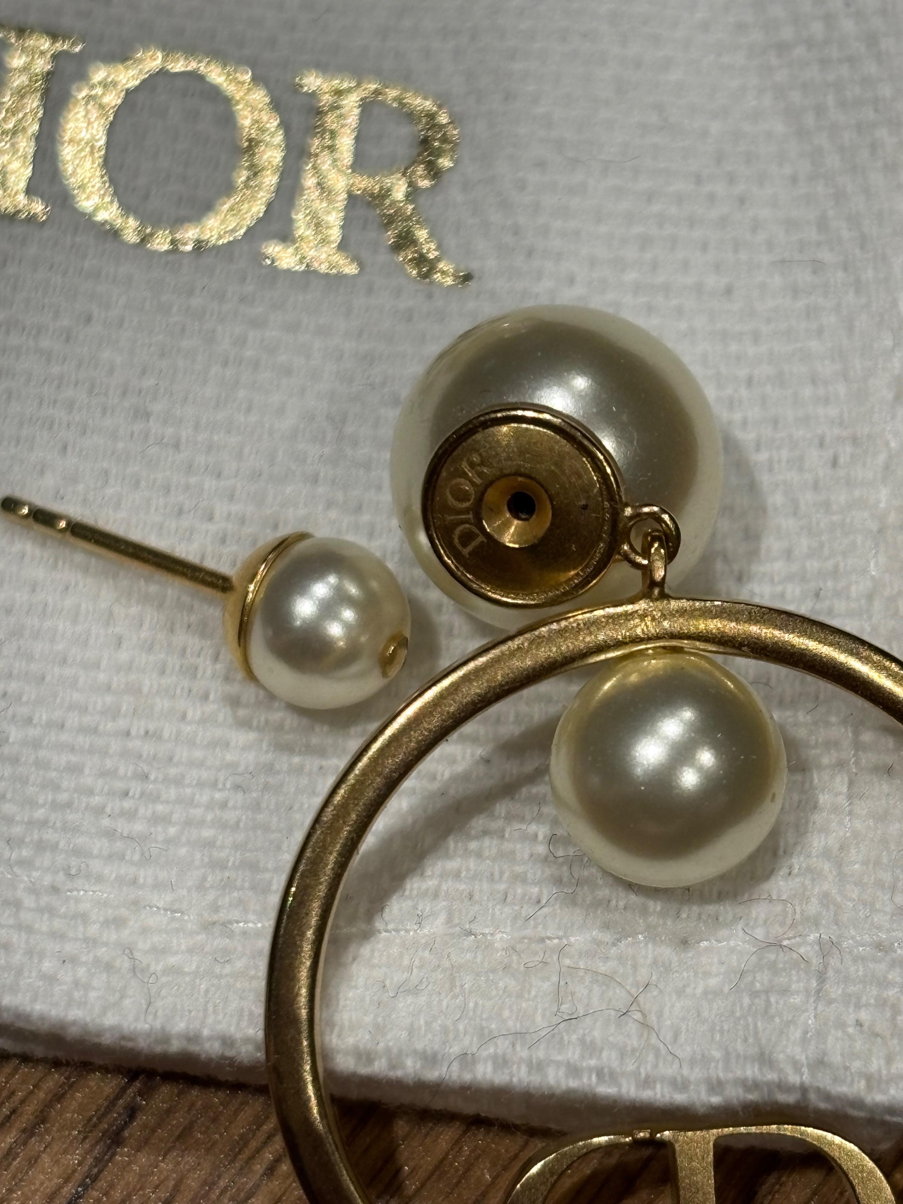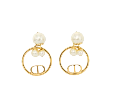 A pair of Dior earrings featuring a hoop with the iconic CD logo and pearl embellishments. The earrings are designed to be worn in multiple ways, with the pearls attaching to the front or back of the ear.