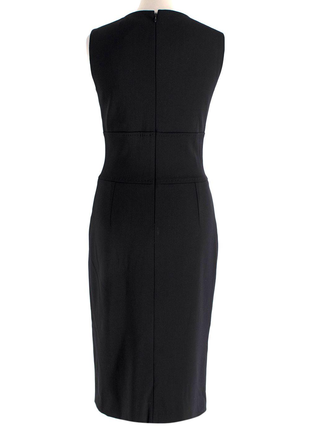 Style / Cut: Sleek, sleeveless sheath / midi-length dress. Round neckline. Back zipper closure. Clean, minimal silhouette.