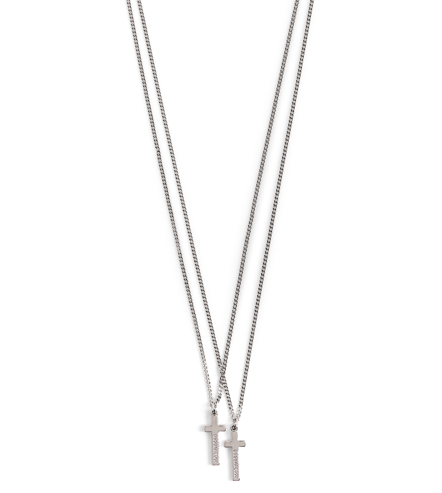 This double chain necklace with two crucifix pendants adds a touch of style to every outfit. The suggestion is to wear it alone, with shirts and T-shirts or plain tops to increase its visibility.