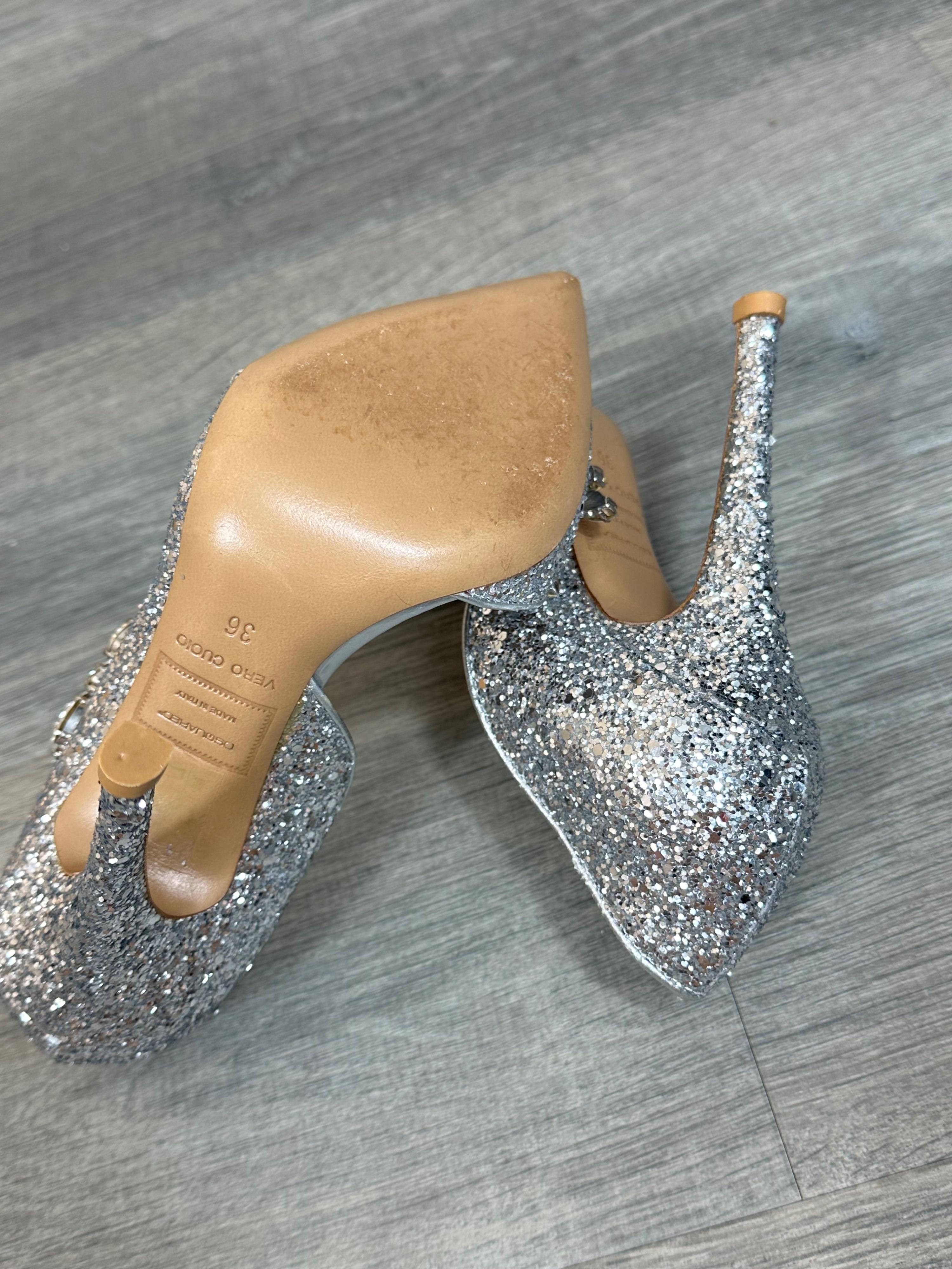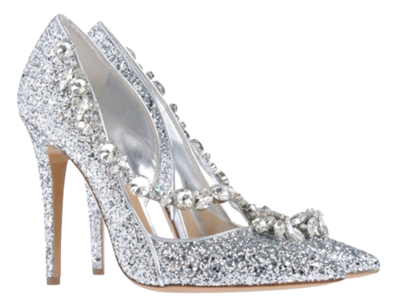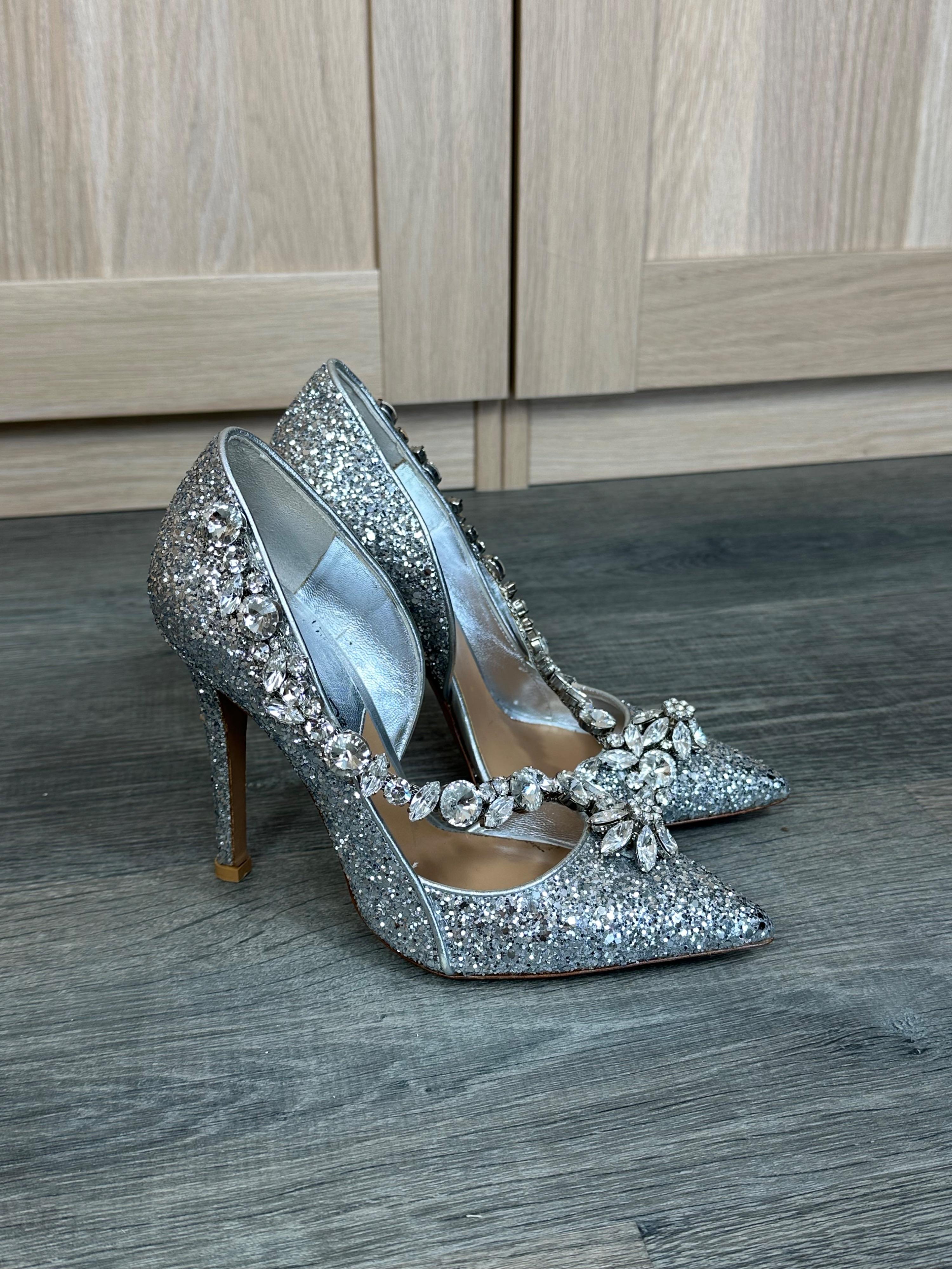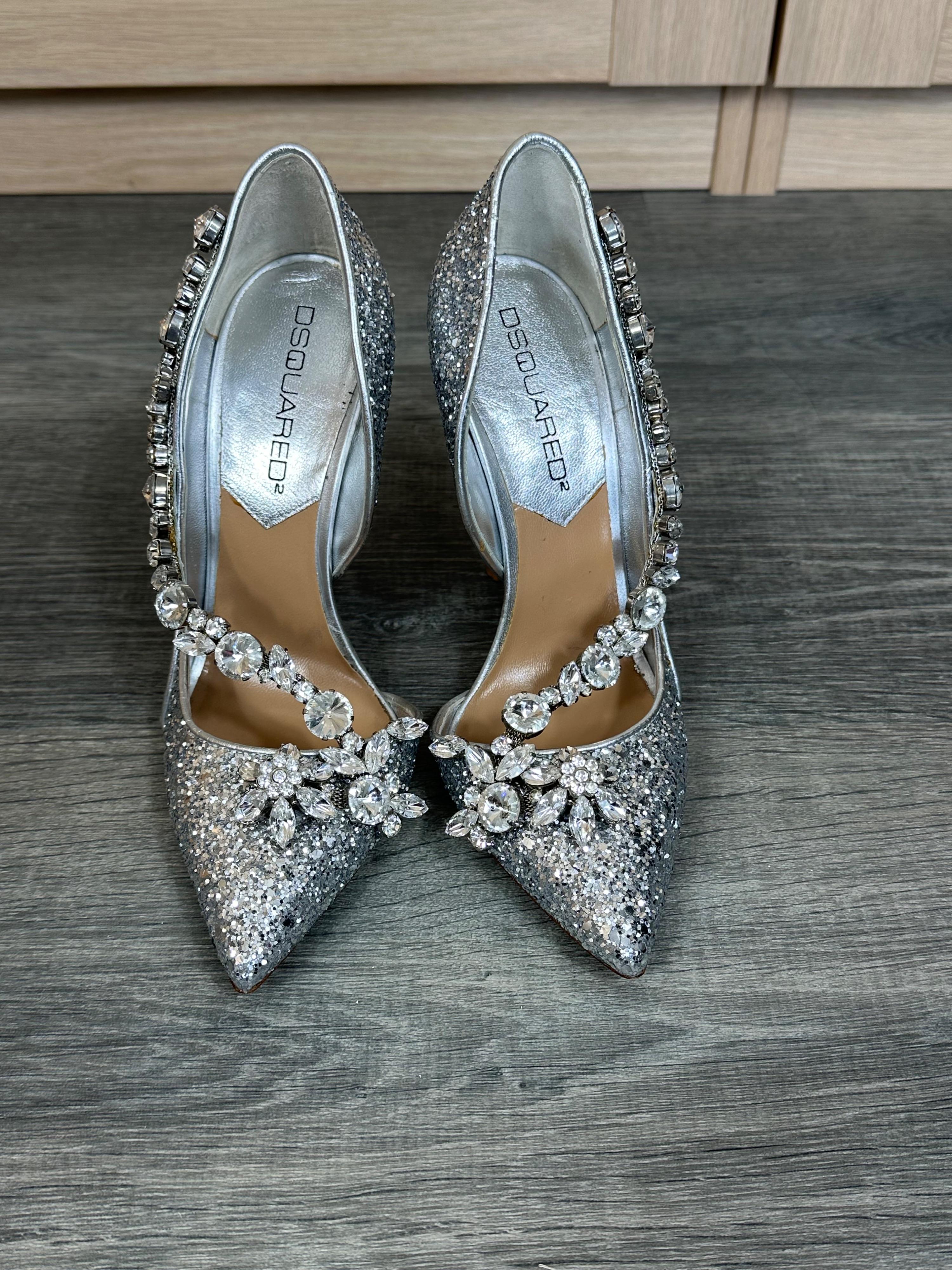 Ds2quared leather heels. Covered in glossier. Large white and silver crystals embellissement. Worn only once