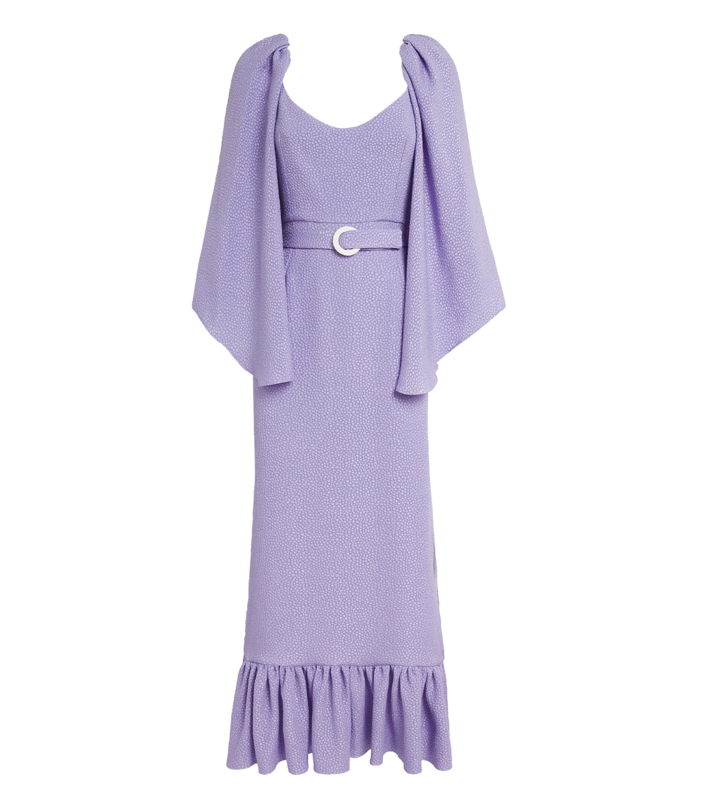 The Edeline Lee Millie dress features a maxi-length silhouette with voluminous sleeves. The sleeves mimic the movement of the ruffle trims to the hemline and are crafted from a pebbled fabric for a textured finish. It has a belted waist and a slit in the skirt.
