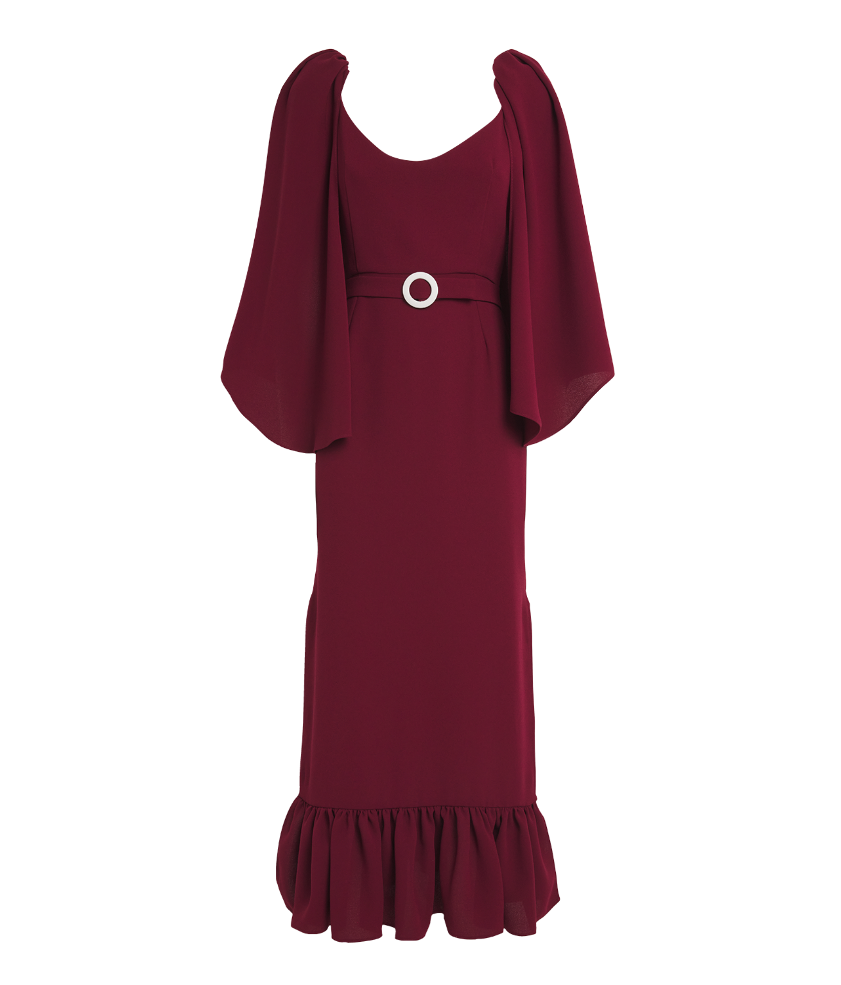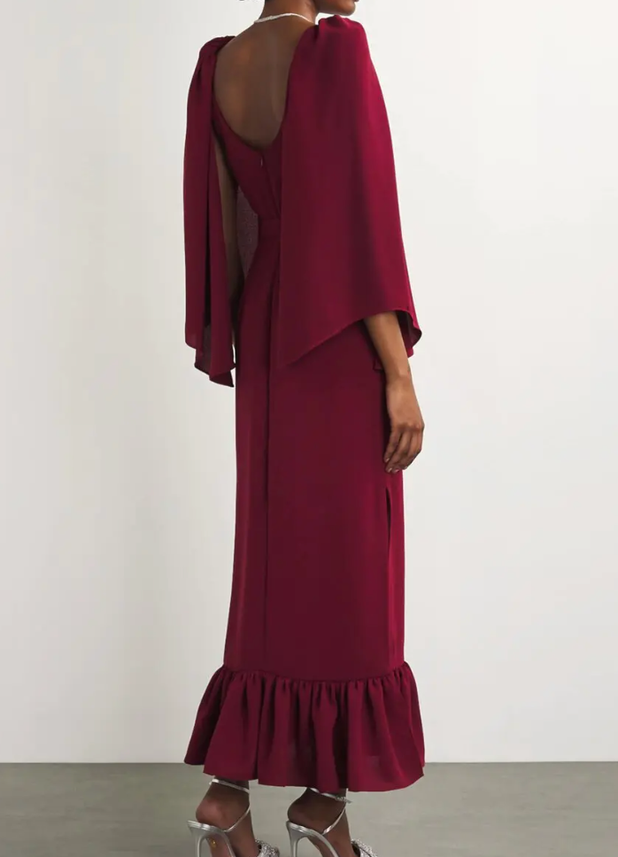 The Edeline Lee Millie Midi Dress features a detachable belt and sleeves, allowing for a modular design to suit any occasion. The dress has a midi length and a ruffled hem. The dress also features a back zipper closure and a fitted silhouette.