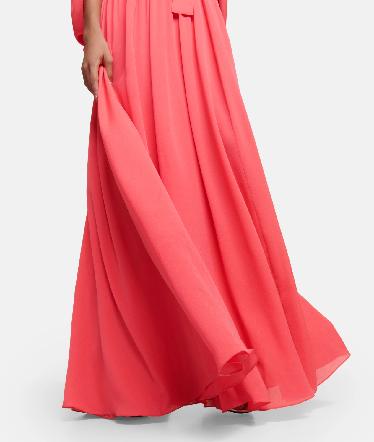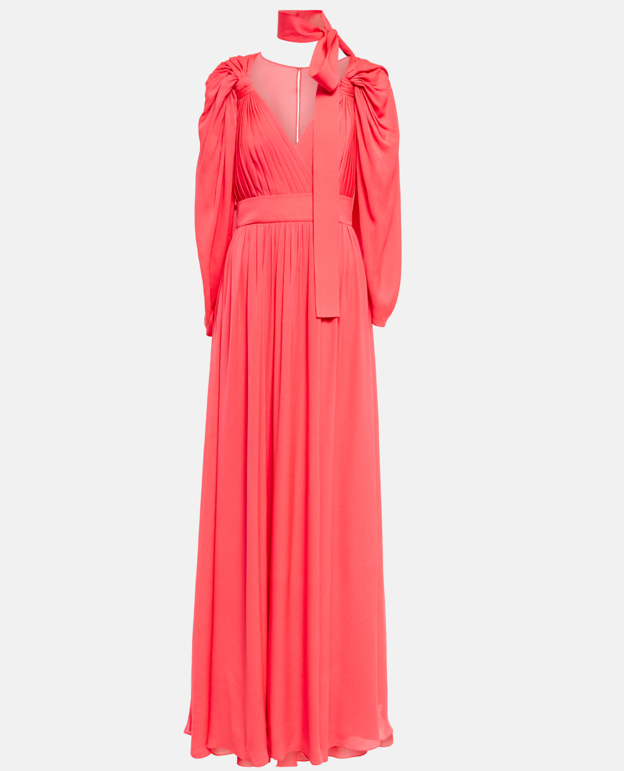 Quintessentially Elie Saab, this statement gown makes an unforgettable impression at every event. Crafted from pleated silk chiffon, it’s shaped with cape-effect sleeves, a cinching, defining waistband, plunging neckline, and flared, floor-length skirt for elegance and grace with every move.