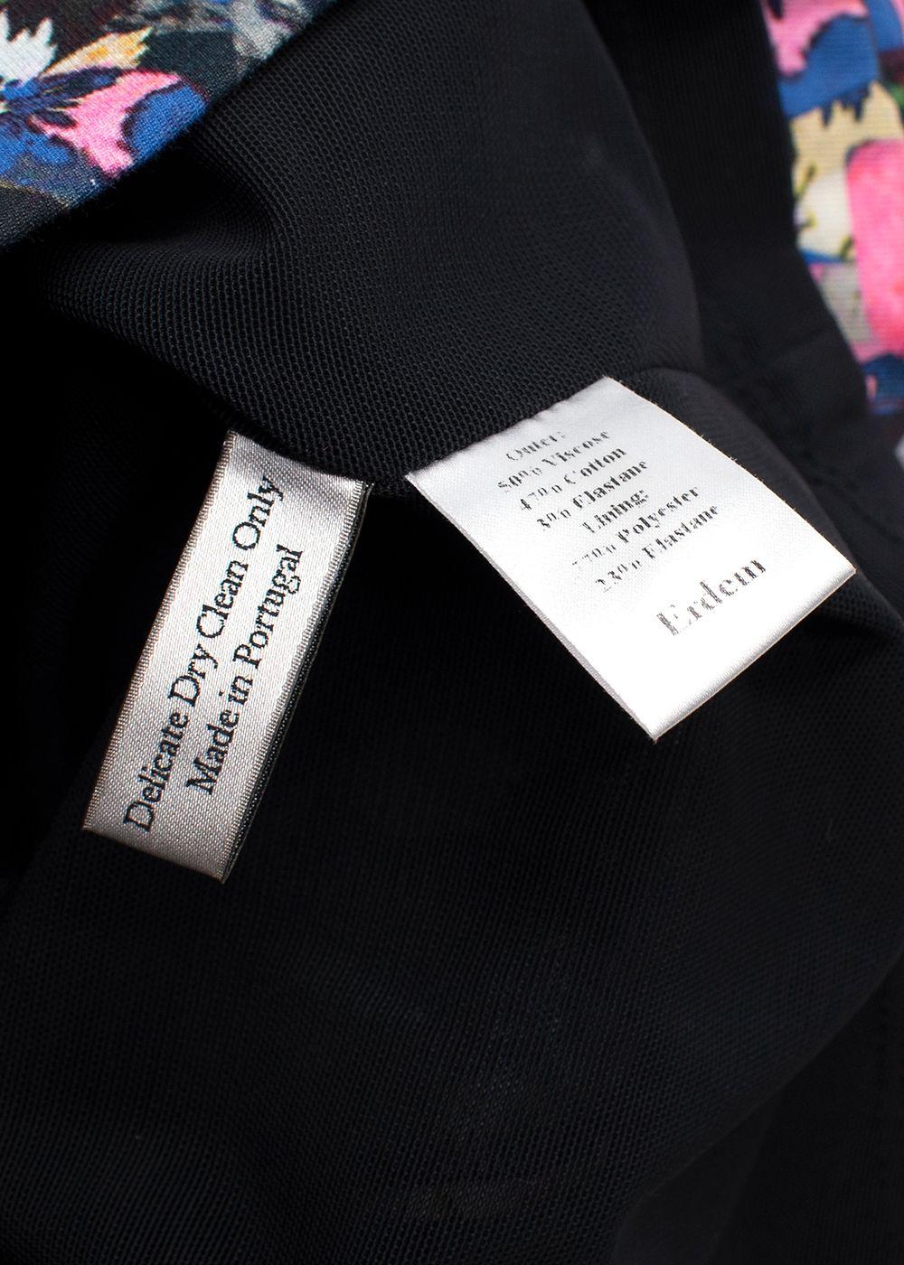 Design details: All-over multicolour floral print (pinks, blues, greens, neutrals on darker base), round / modest neckline, short sleeves, back-zip closure for easy wear.