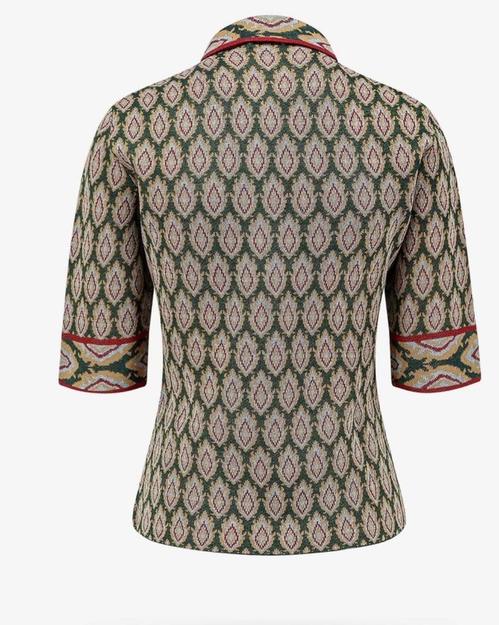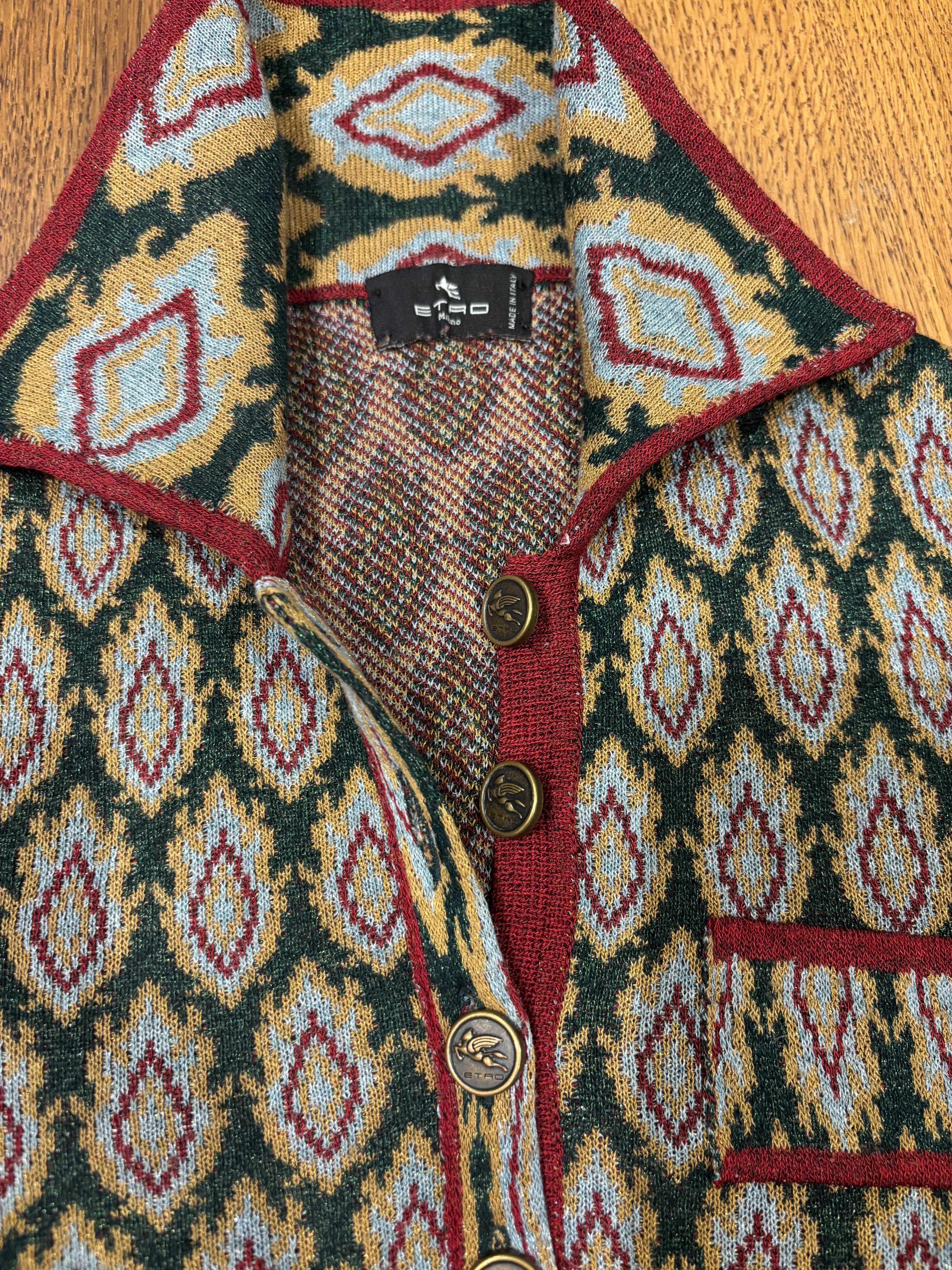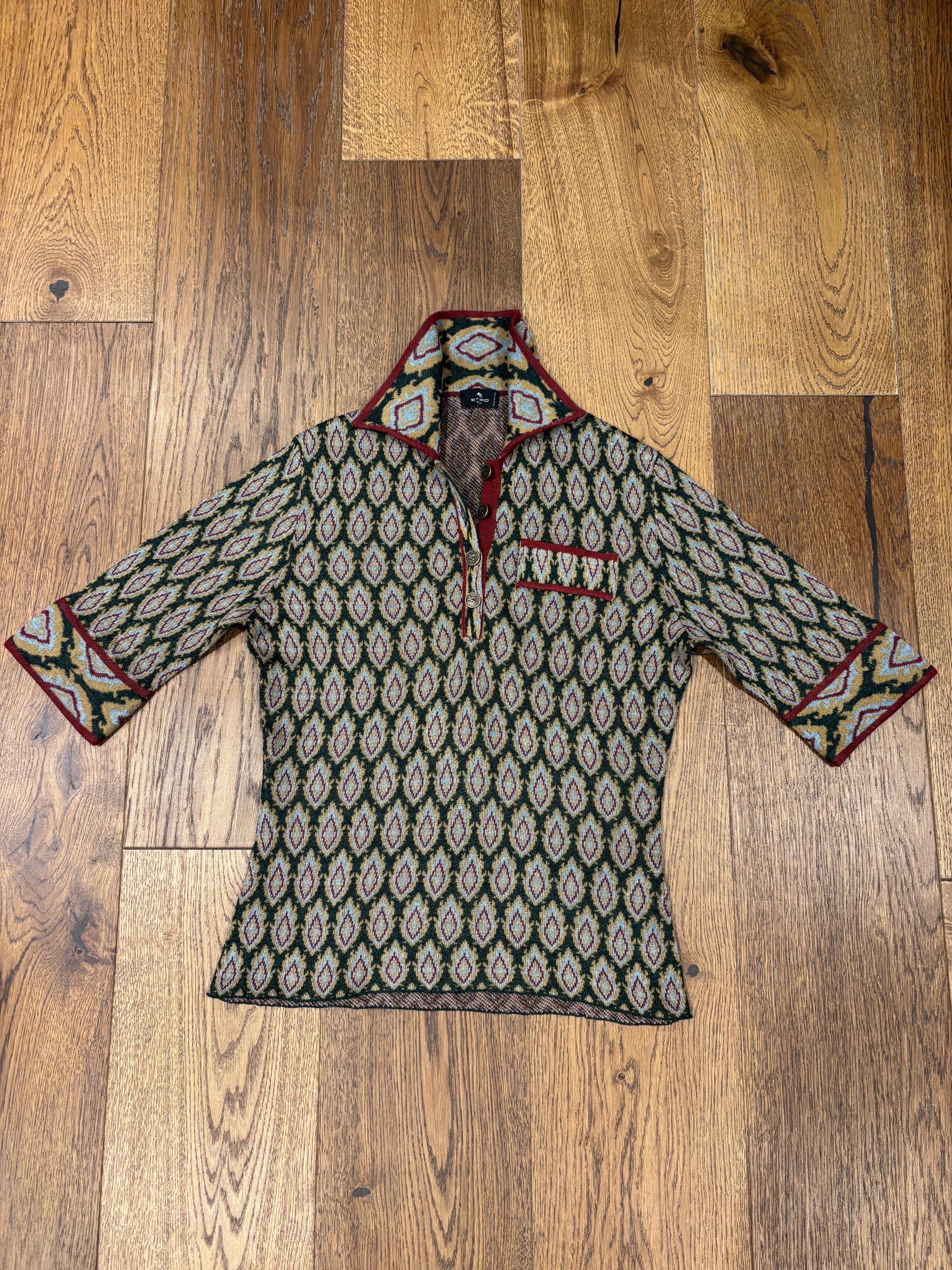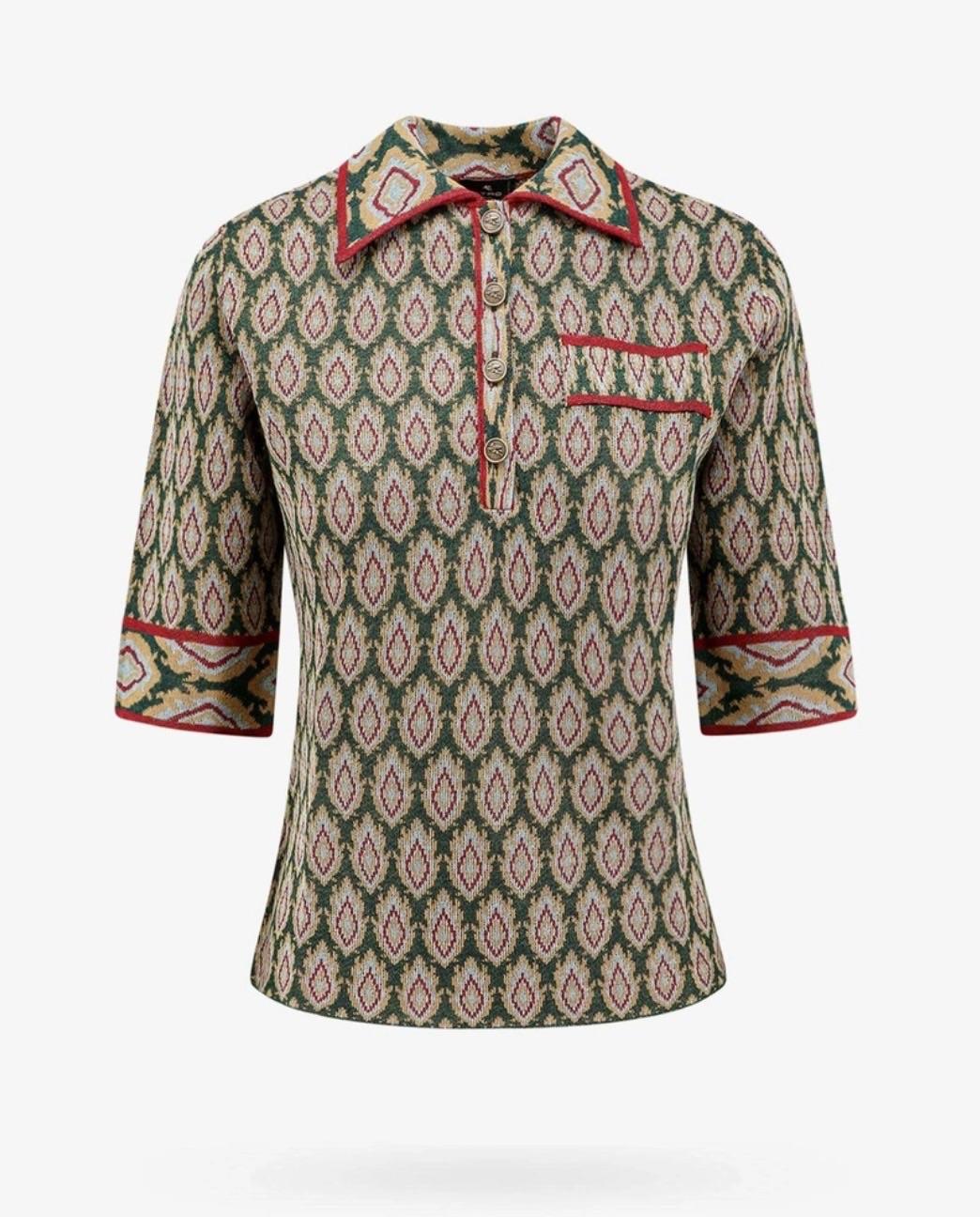 A multicolor knit polo shirt from Etro with a classic collar, button-up front, and a chest pocket. The shirt features a repeating geometric pattern in shades of green, red, yellow, and blue. It has short sleeves with contrasting cuffs and trim.