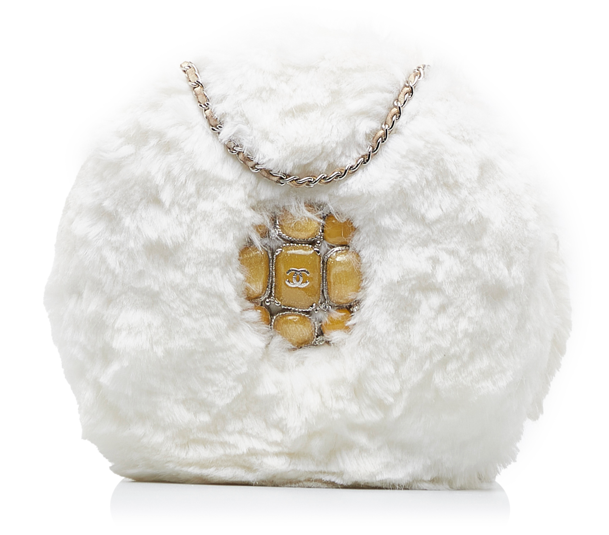 This crossbody bag features a fur body with crystal embellishments, a leather woven chain strap, and a top zip closure.