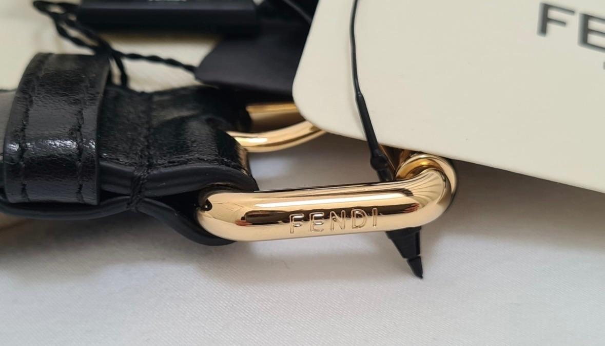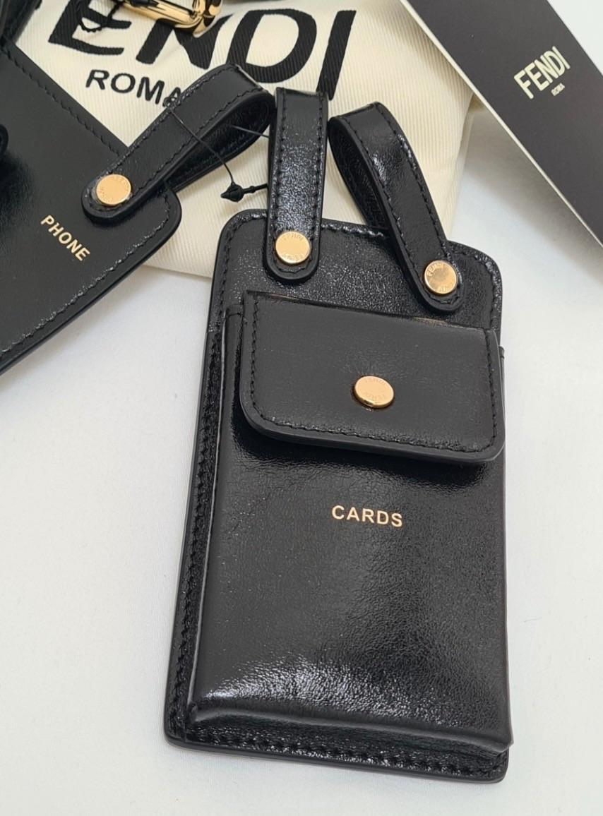 A black leather belt set from Fendi, featuring two detachable pouches: one labeled 'PHONE' and another labeled 'CARDS'. The belt has a gold-tone buckle with the Fendi logo. Includes original tags and dust bag. Made in Italy.