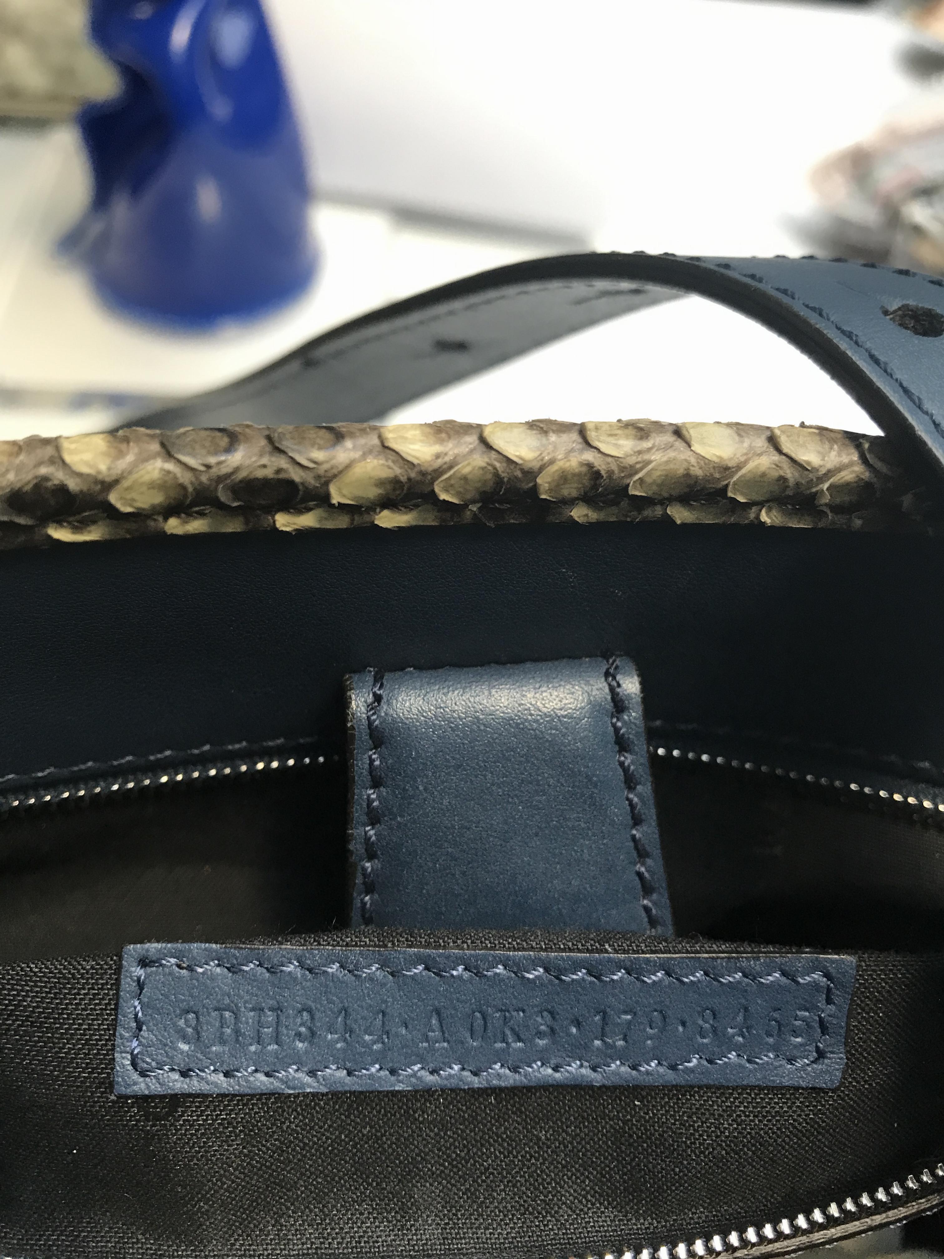 Blue leather with a accented snakeskin exterior pocket and trim. The interior is made with one large compartment, 2 flat pockets and one zippered pocket. This bag is made with removable short leather strap for carrying by hand are at the crook of your arm it also has a long strap for crossbody or shoulder wear. It has a mix of gold and silver hardware . The side is designed with large silver eyelets.