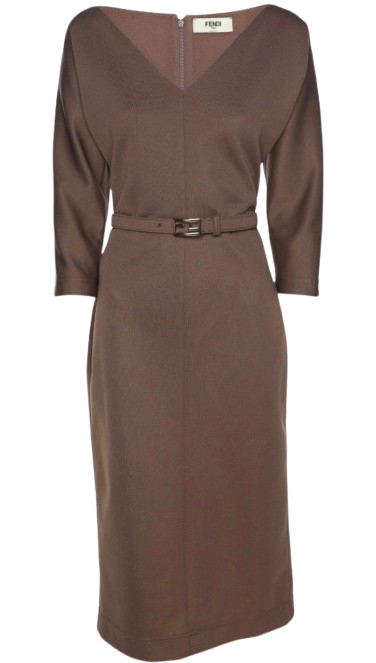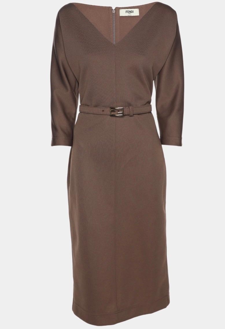 A sophisticated Fendi midi dress in a rich brown hue, crafted from a blend of polyester and silk. The dress features a V-neckline, three-quarter sleeves, and a flattering silhouette. It is accented with a matching fabric belt adorned with the iconic Fendi FF logo buckle in gold-tone hardware. Made in Italy.