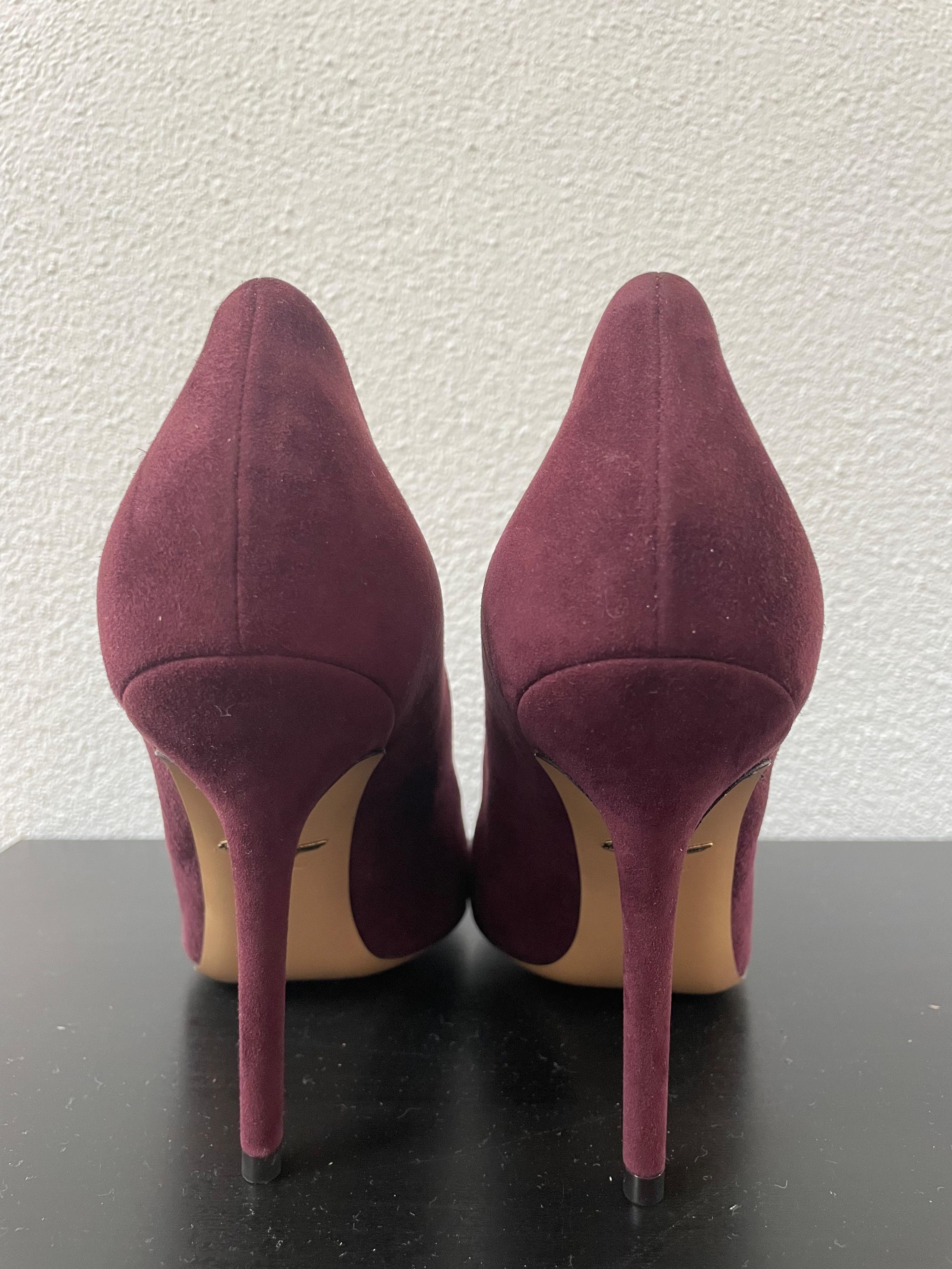 A pair of burgundy luxurious suede pumps.