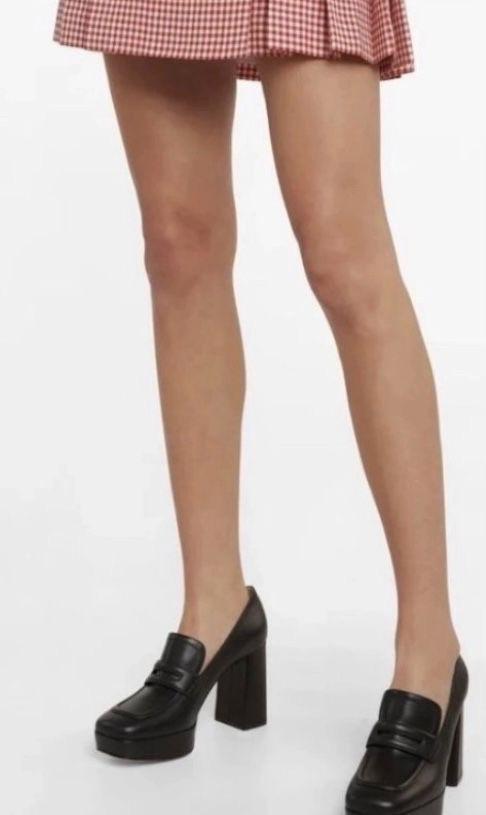 Black leather platform loafer heels with a chunky block heel and a square toe. Features a classic loafer strap across the vamp. Made in Italy.