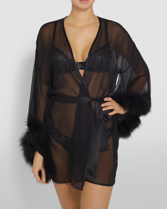 Black silk Diana sheer robe from Gilda & Pearl featuring a faux fur trim, a wrap style V neck, billowing sleeves and a tie fastening.