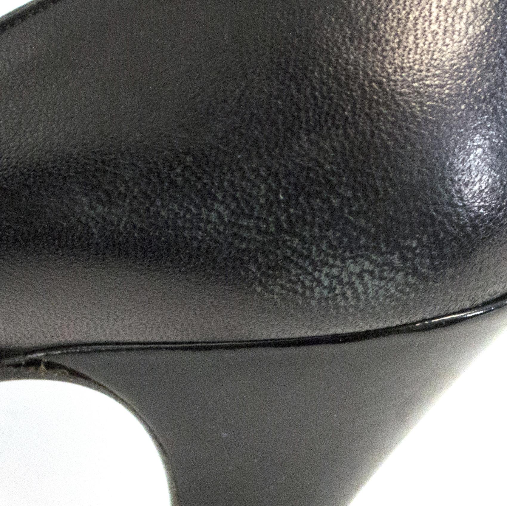 Gina black pointed court shoes with patent leather heel and patent detailing on sides of shoe.