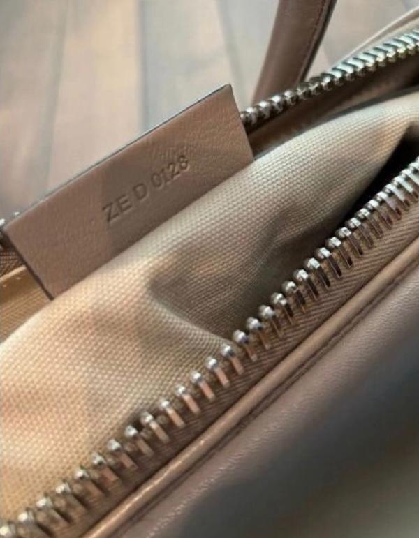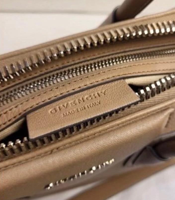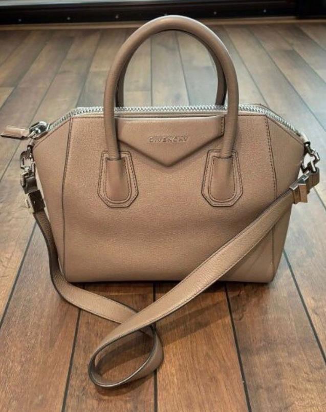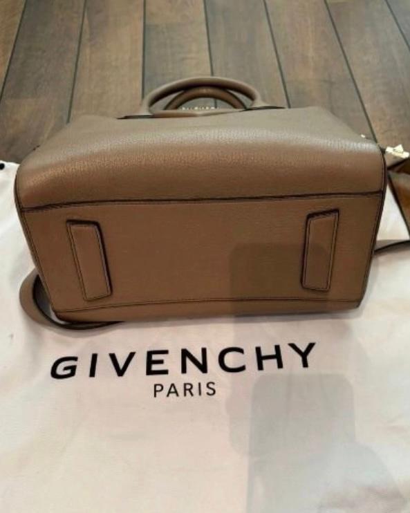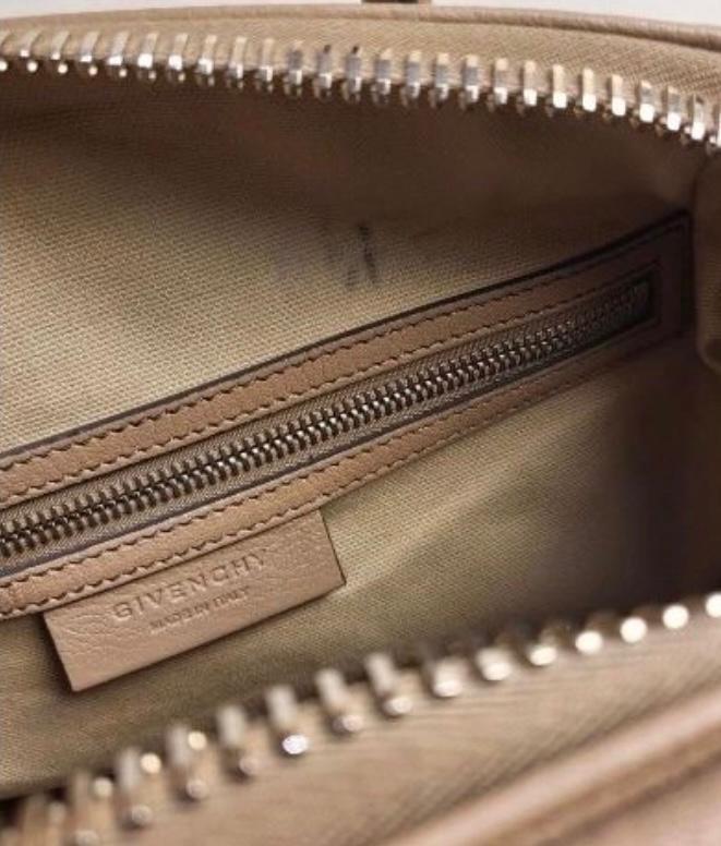 A taupe leather Givenchy Antigona handbag with silver hardware. The bag shows some signs of wear, including a small stain on the interior lining. Otherwise, it is in good preowned condition.