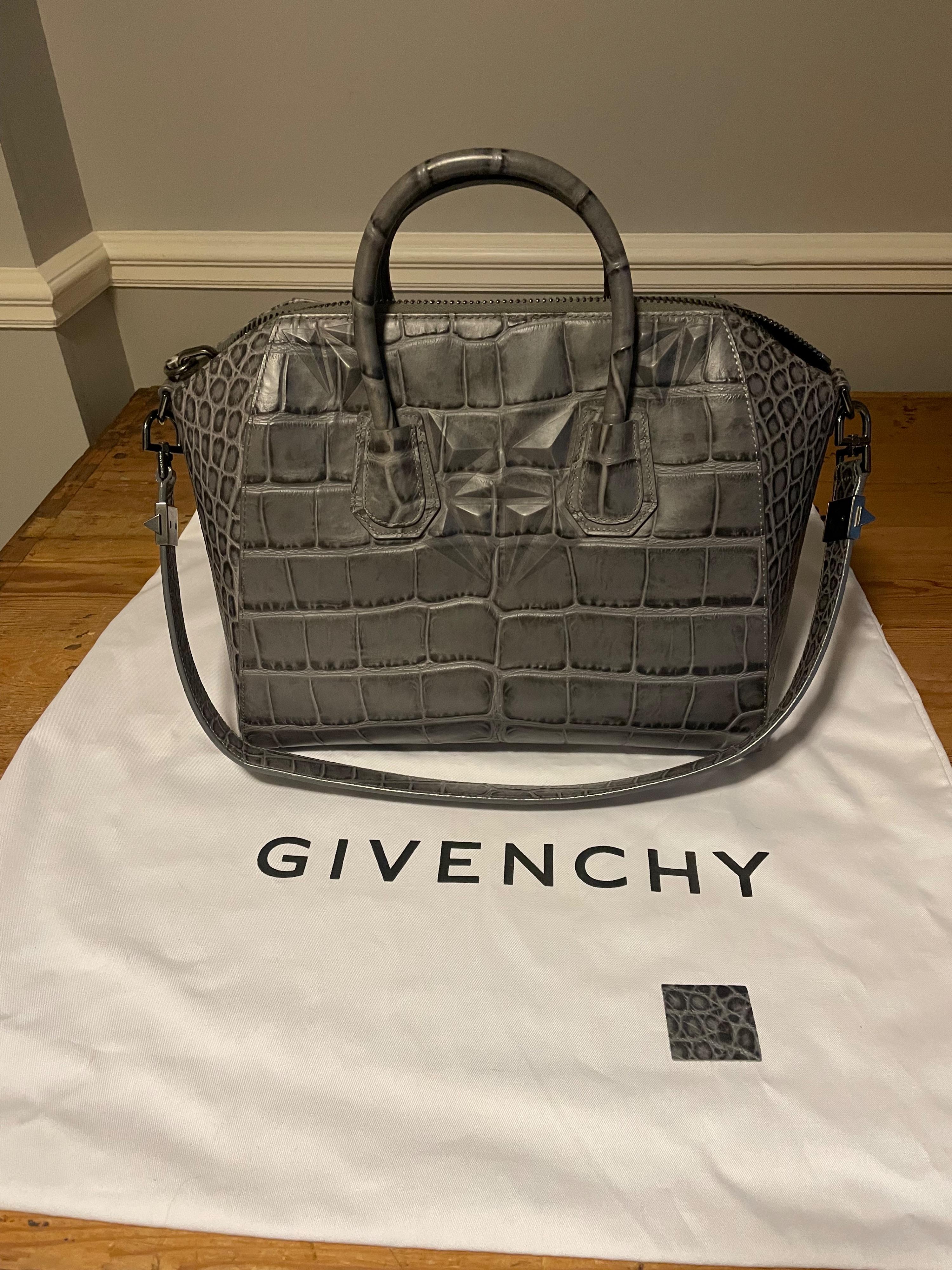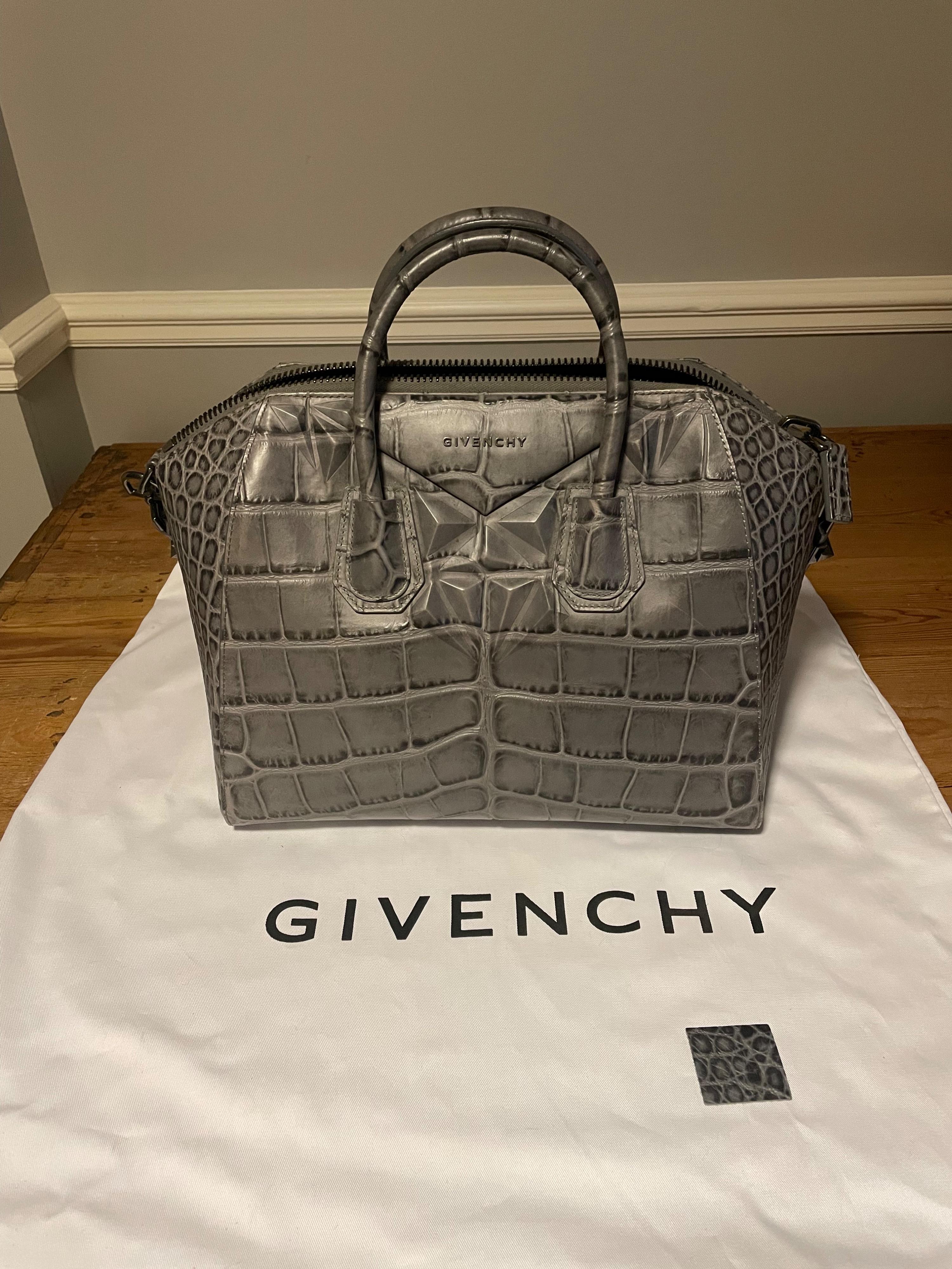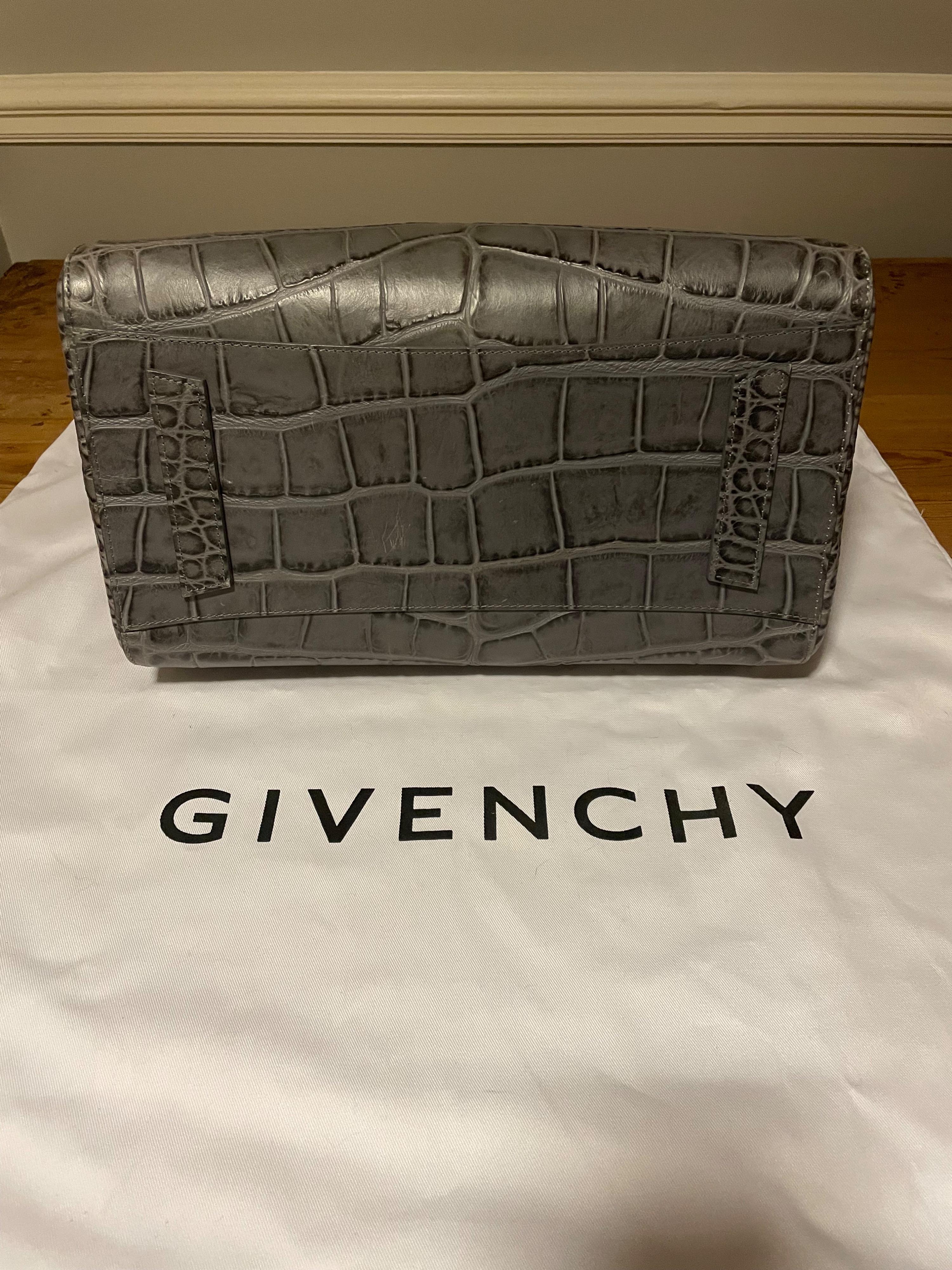 Near perfect condition, vintage (2013) Givenchy medium Antigona handbag in grey crocodile print leather. Original tag, leather patch and dust bag included.