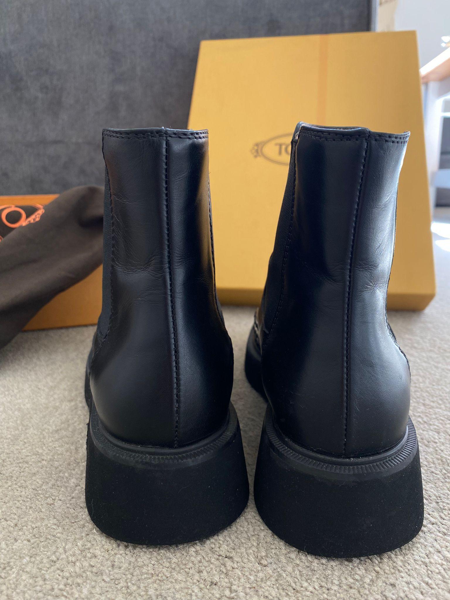 Black Tod's chelsea boots "Gomma Basso Guscio 04C Tronchetto". Worn a handful of times, so has some creasing in the leather but in great condition. Rubber heel and rubber lining around the front.