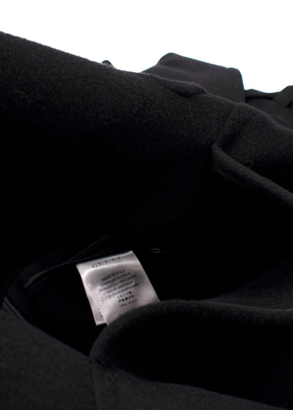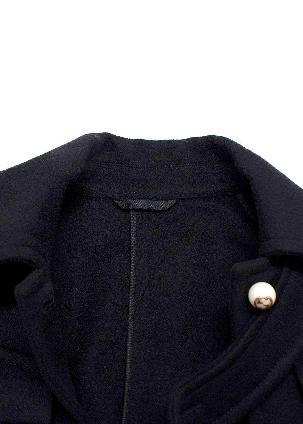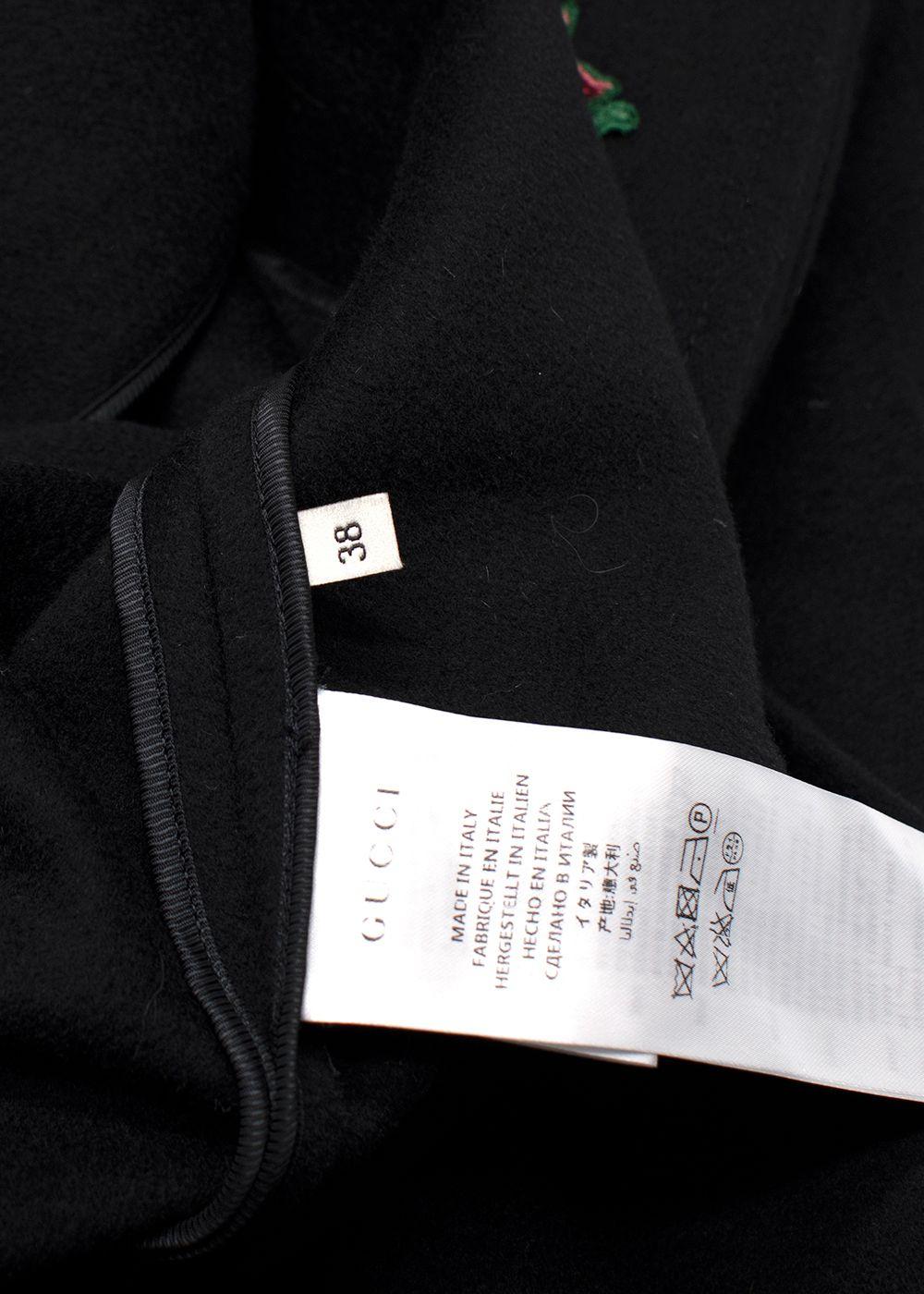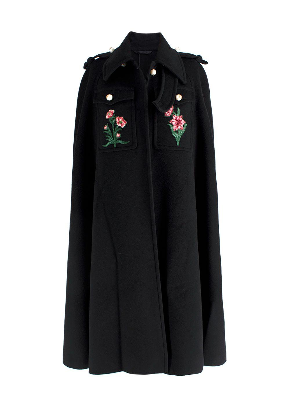 A stunning statement piece from Gucci, this cape blends high-fashion drama with classic military tailoring. Crafted from a structured, heavy-weight black wool, it features beautiful, vibrant floral appliqués on the front pockets that add a feminine touch to its structured shape.