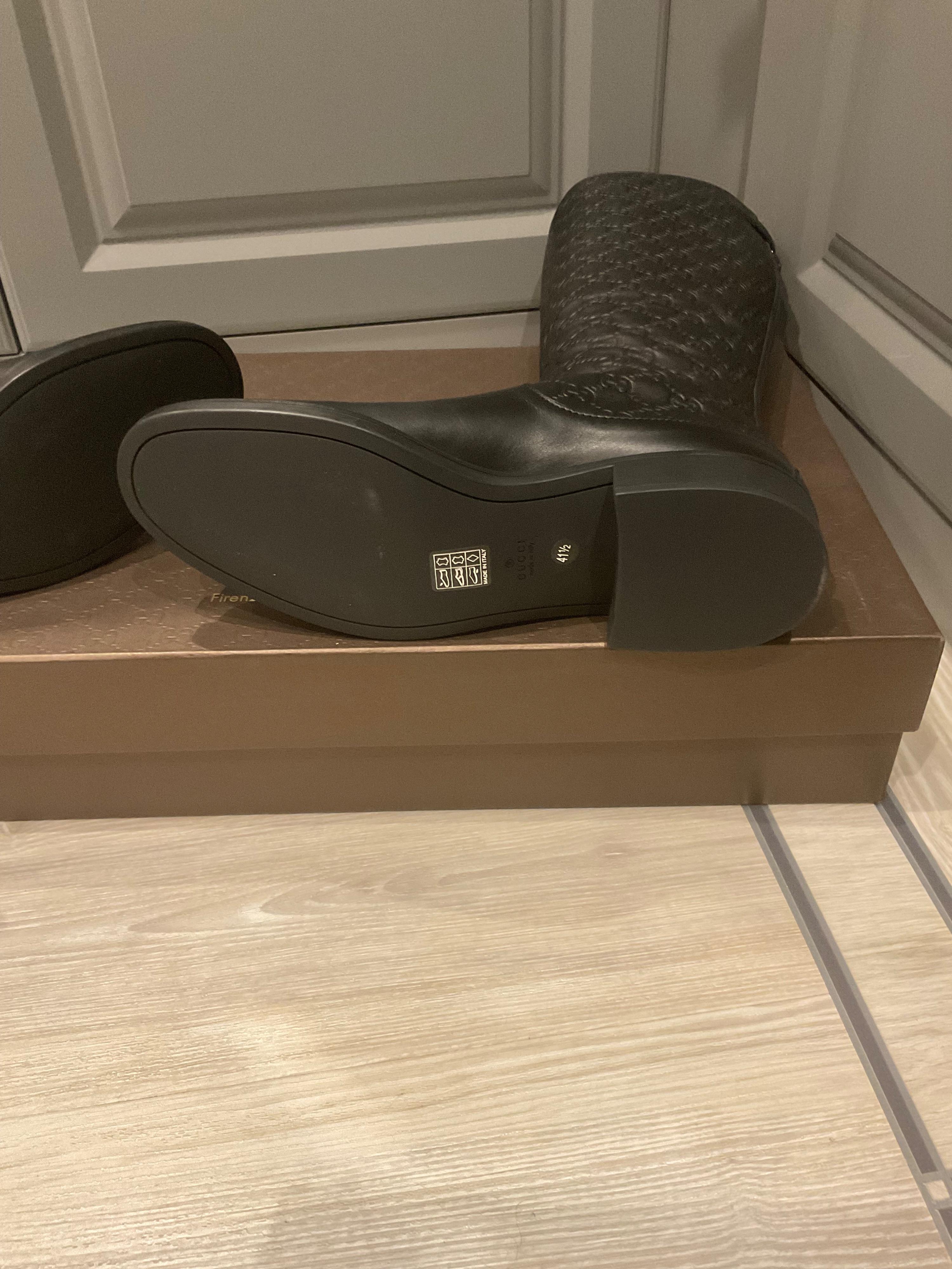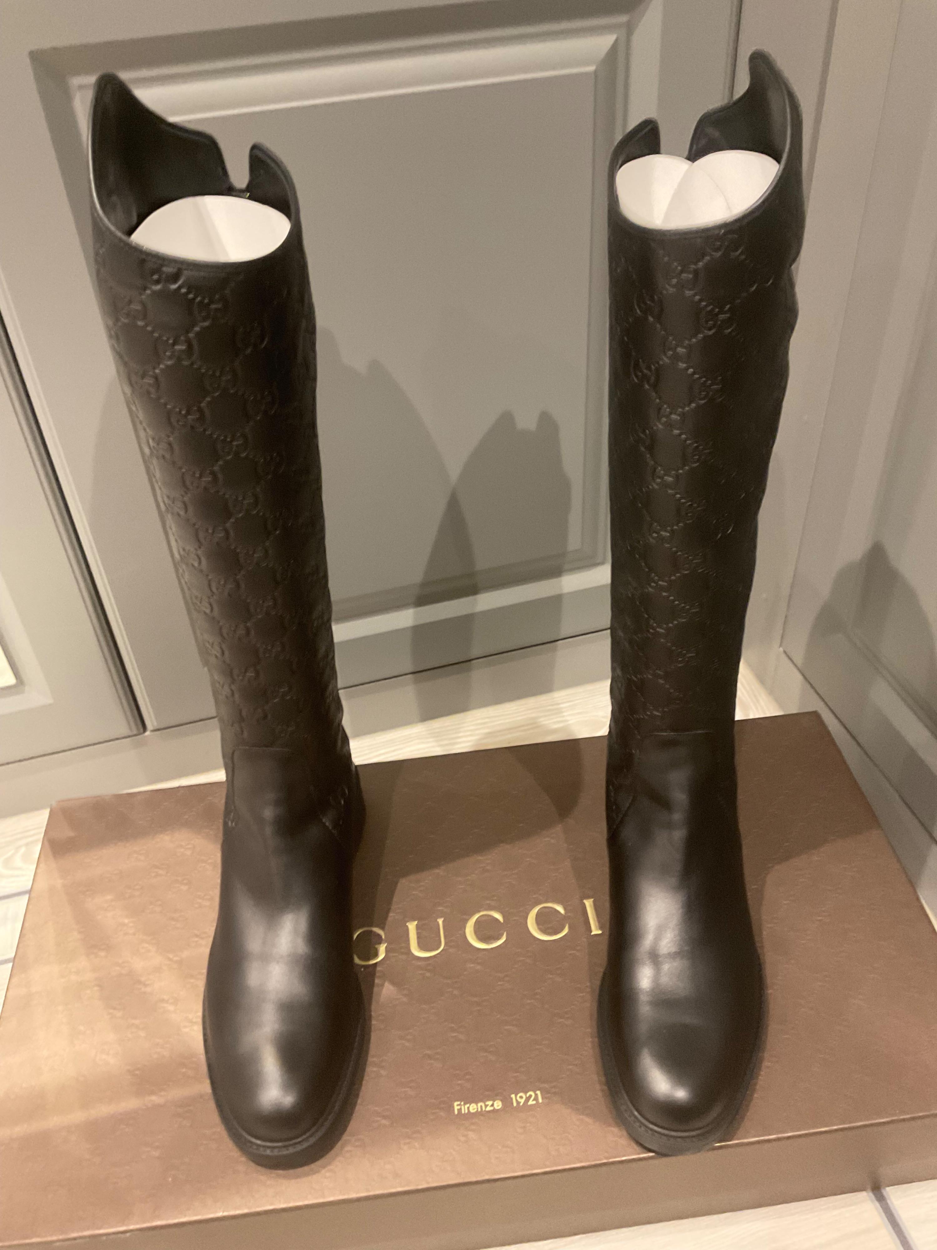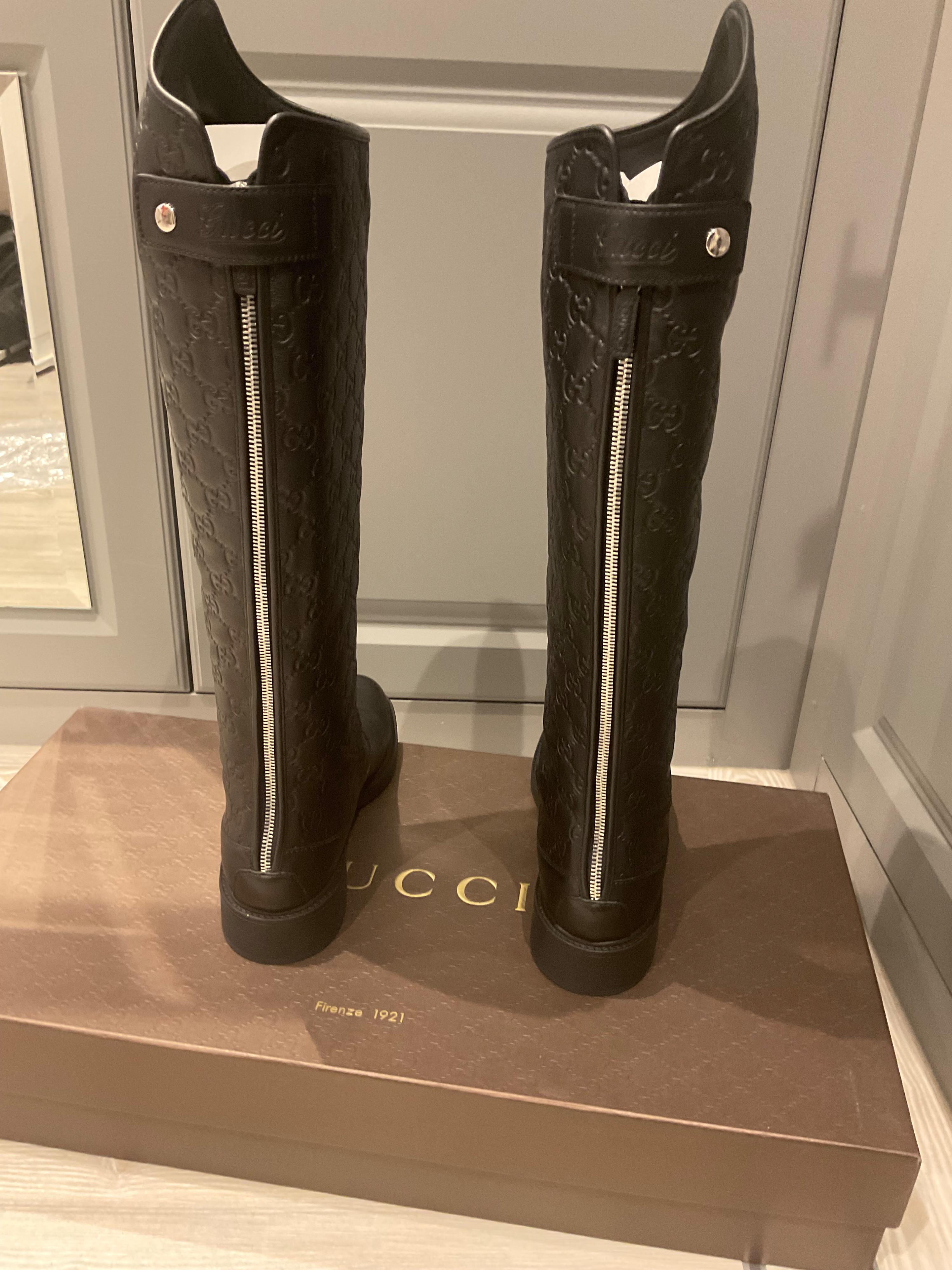 Details: • Model: Gucci Maud High Riding Boots • Color: Black • Material: Guccissima embossed calfskin leather upper + smooth leather foot • Size: 41.5 EU • Condition: Never worn • Date code: 296161 • Includes: Original Gucci box + dust bag • Heel: Low flat heel • Discontinued model — rare to find in new condition, especially in larger sizes. A perfect piece for collectors, Gucci archive enthusiasts, or anyone looking for an impeccable vintage riding boot from the Guccissima era. Sizes above 40 are particularly hard to find, making this pair even more desirable. [BR] [BR] Gucci Maud Boots / Guccissima Boots / Gucci Riding Boots / Equestrian Gucci / Vintage Gucci / Discontinued Gucci / Gucci Archives / Black Gucci Boots / Rare Gucci Boots / Gucci Leather Knee-High Boots / New Gucci.