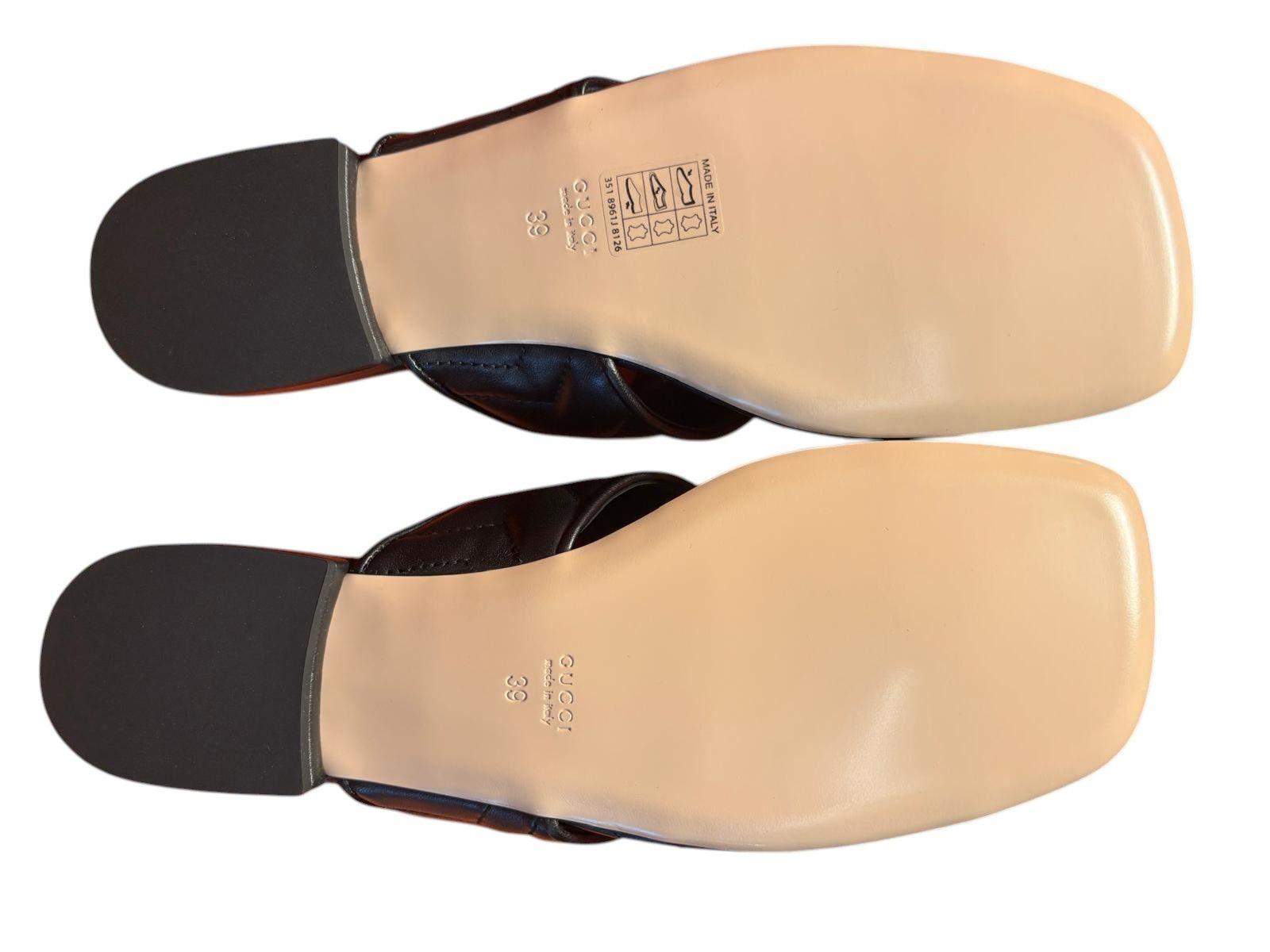 The padded strap and chevron quilting reflect one of the most recognizable design signatures of the Gucci Marmont line. The minimal silhouette combined with the luxurious leather construction creates a sophisticated yet easy-to-wear summer sandal.