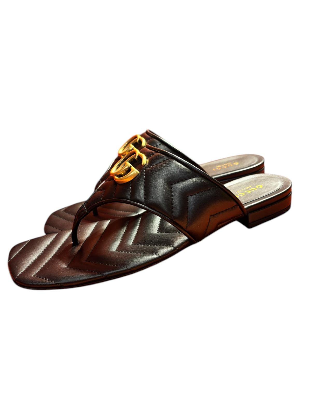 Elegant Gucci thong sandals crafted from soft black quilted leather and finished with the iconic GG Marmont double G hardware in antique gold-tone metal.