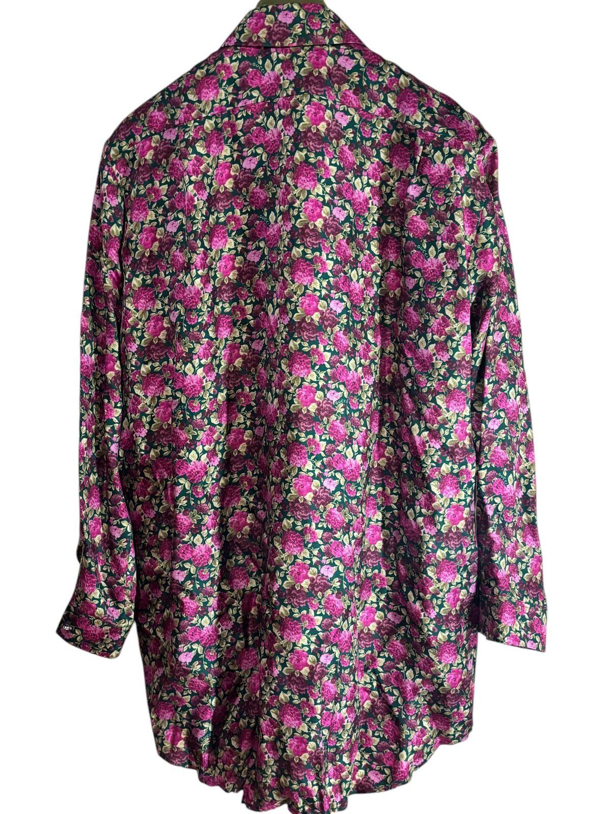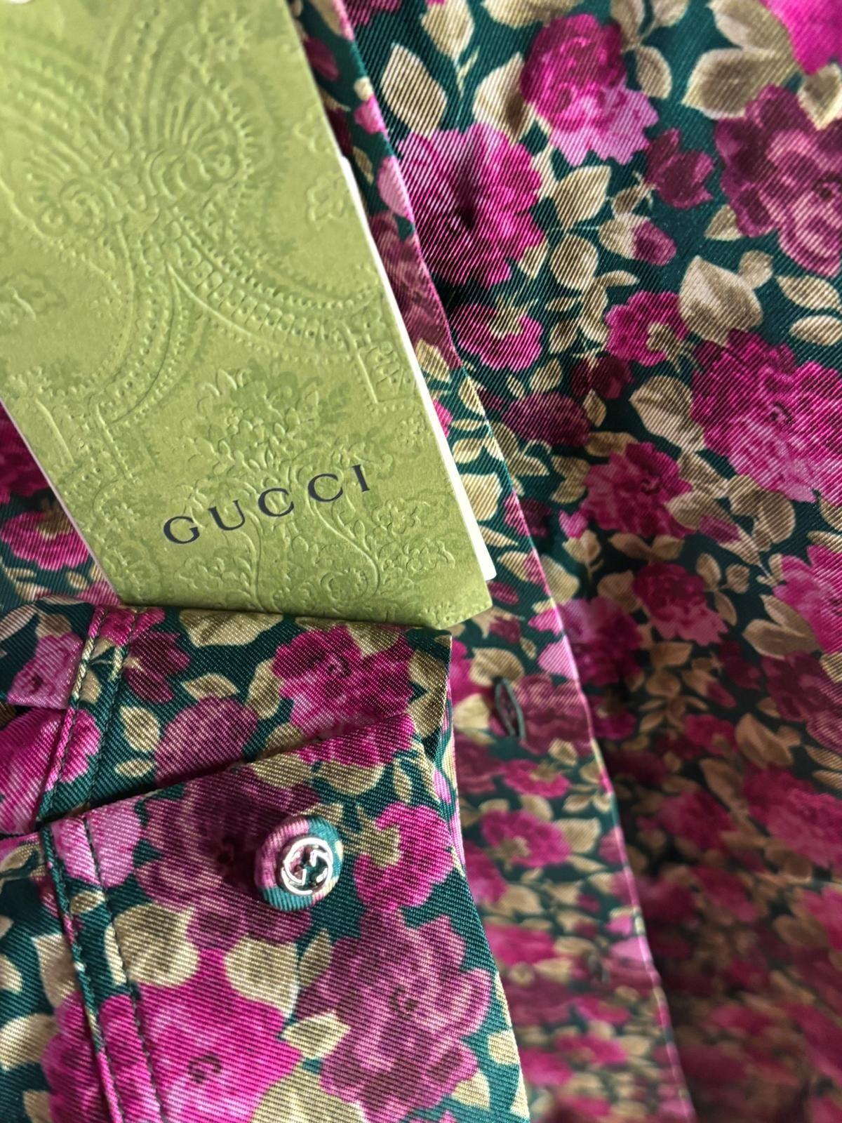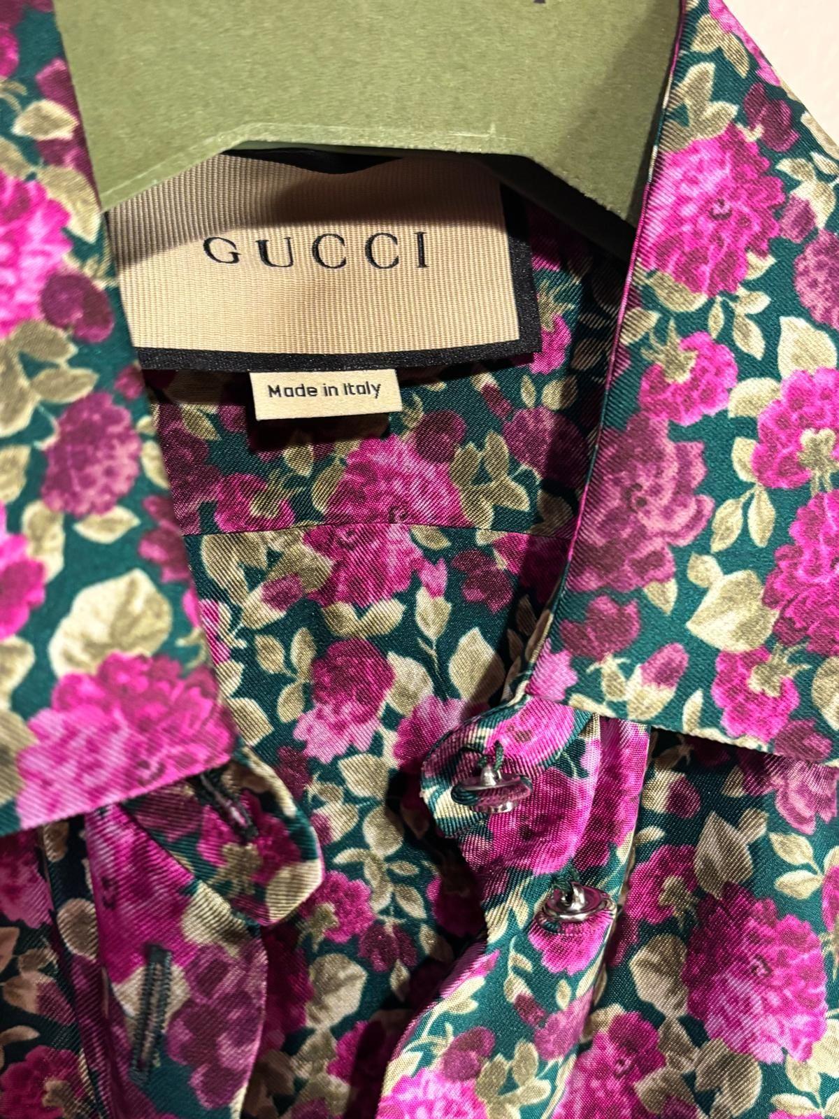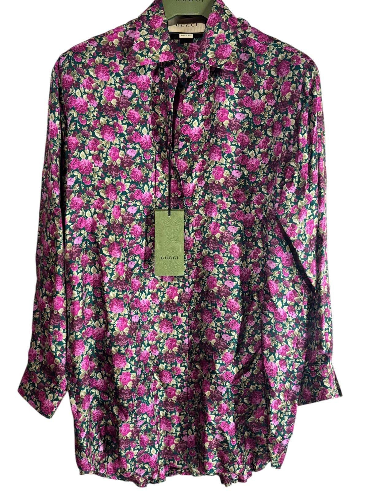 The design features a classic collar, front button closure and a soft, relaxed fit typical of Gucci silk shirts. The floral motif reflects the maison’s romantic and distinctive aesthetic.