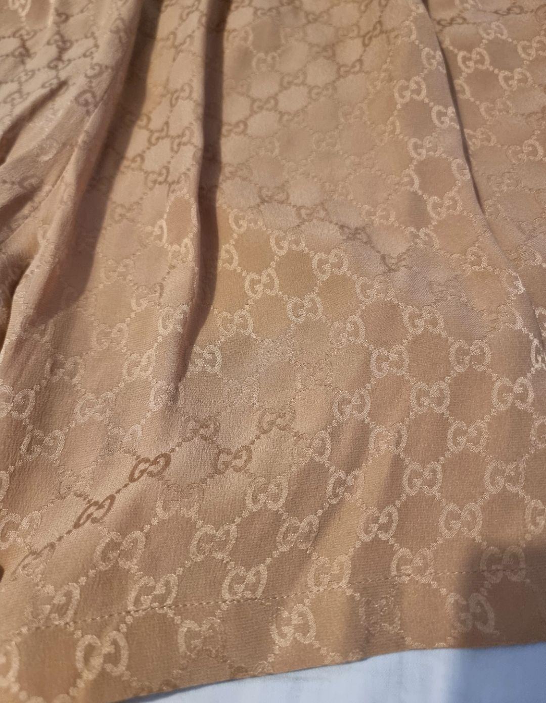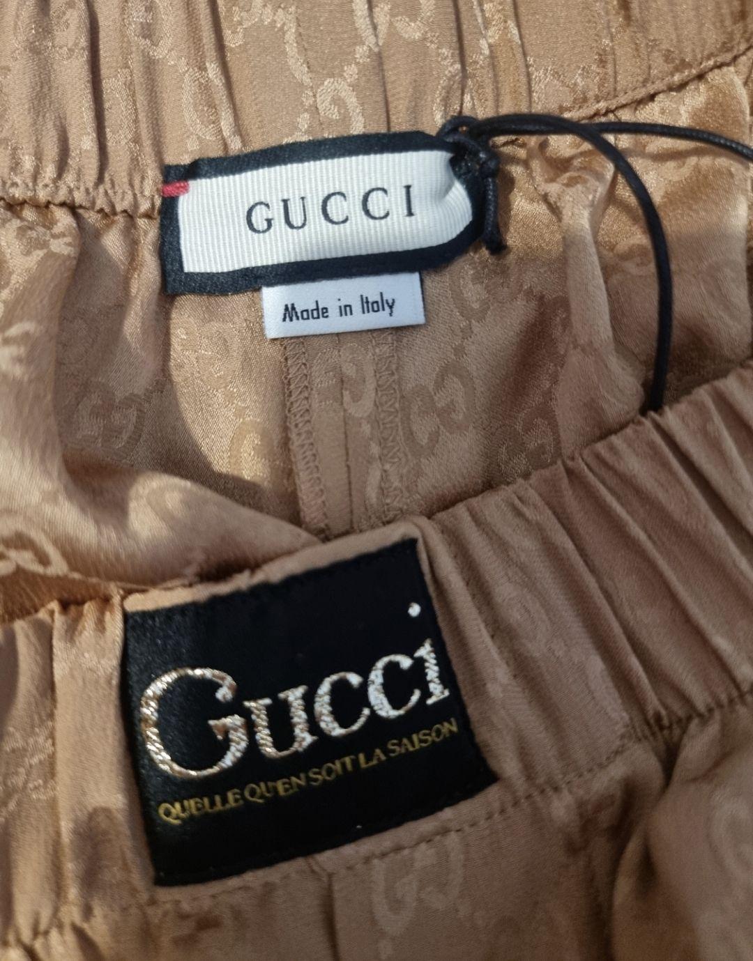 Cashew cream silk Gucci print shorts from GUCCI featuring signature GG Supreme print, elasticated waistband, glitter logo patch to the front and pleat detailing.