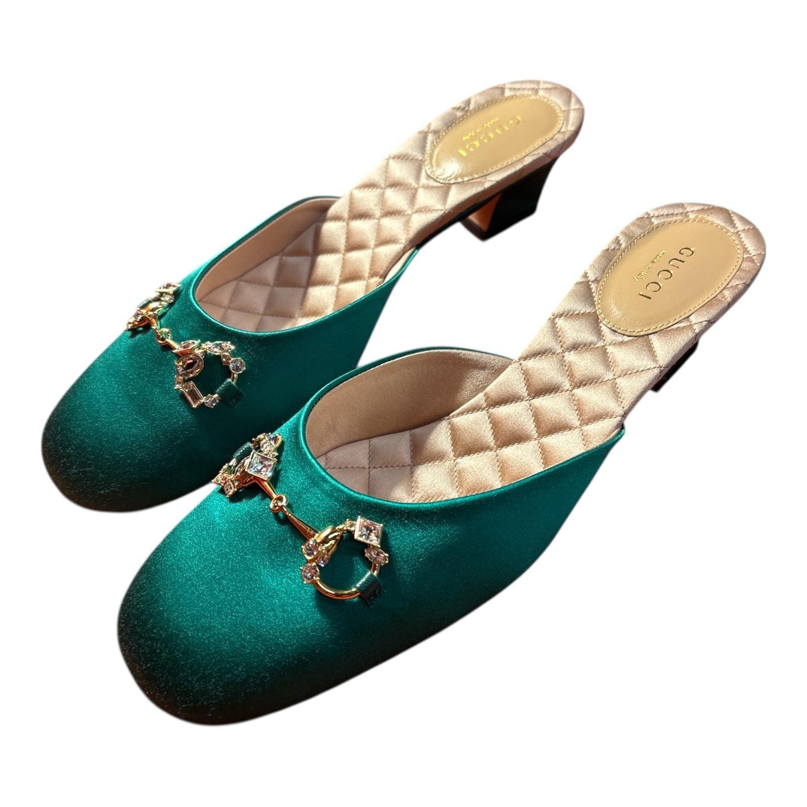 Green satin mules featuring a square toe, quilted leather insole, mid block heel, and gold-tone Horsebit detail with crystal embellishments. Slip-on design with leather sole.