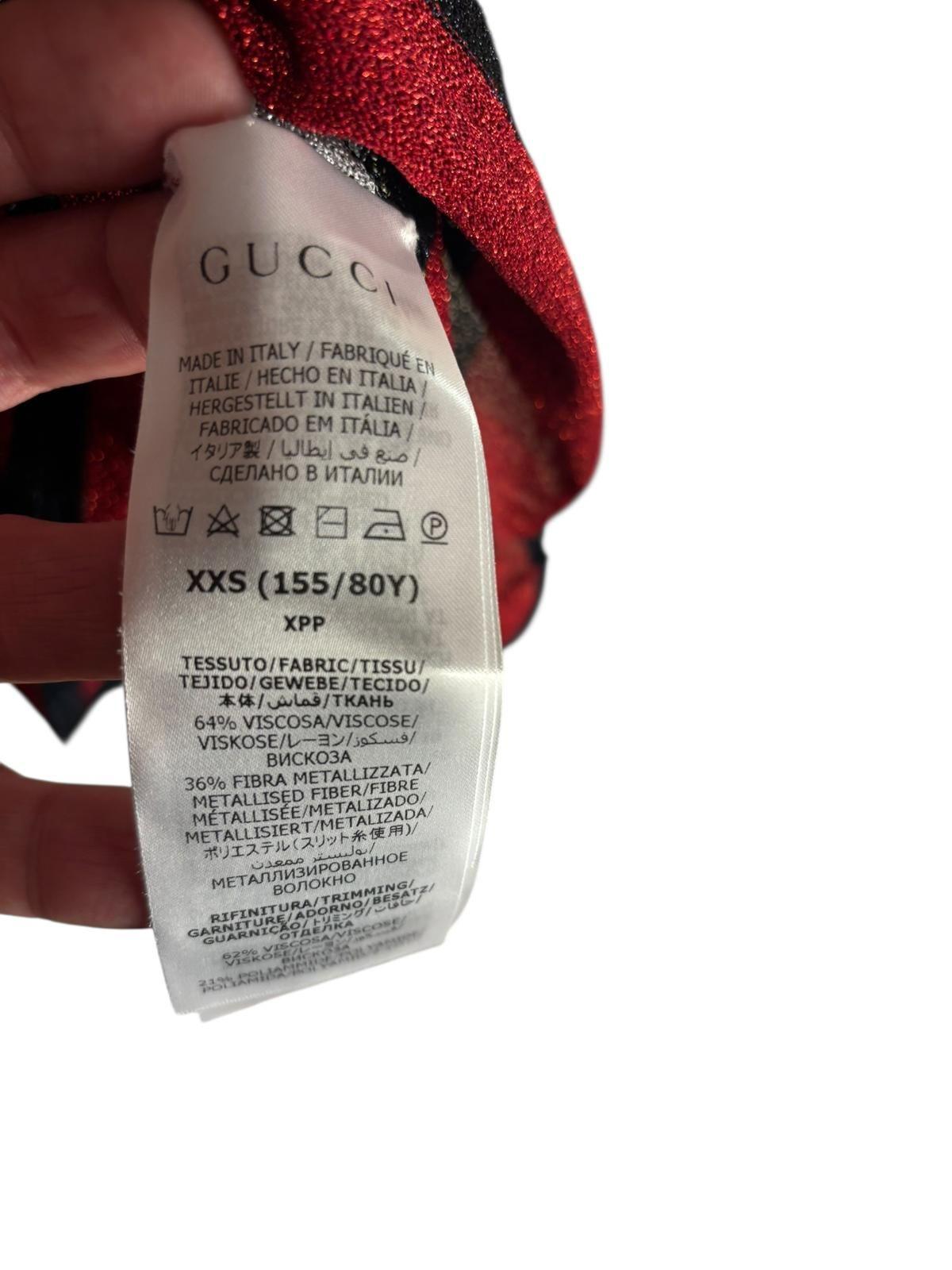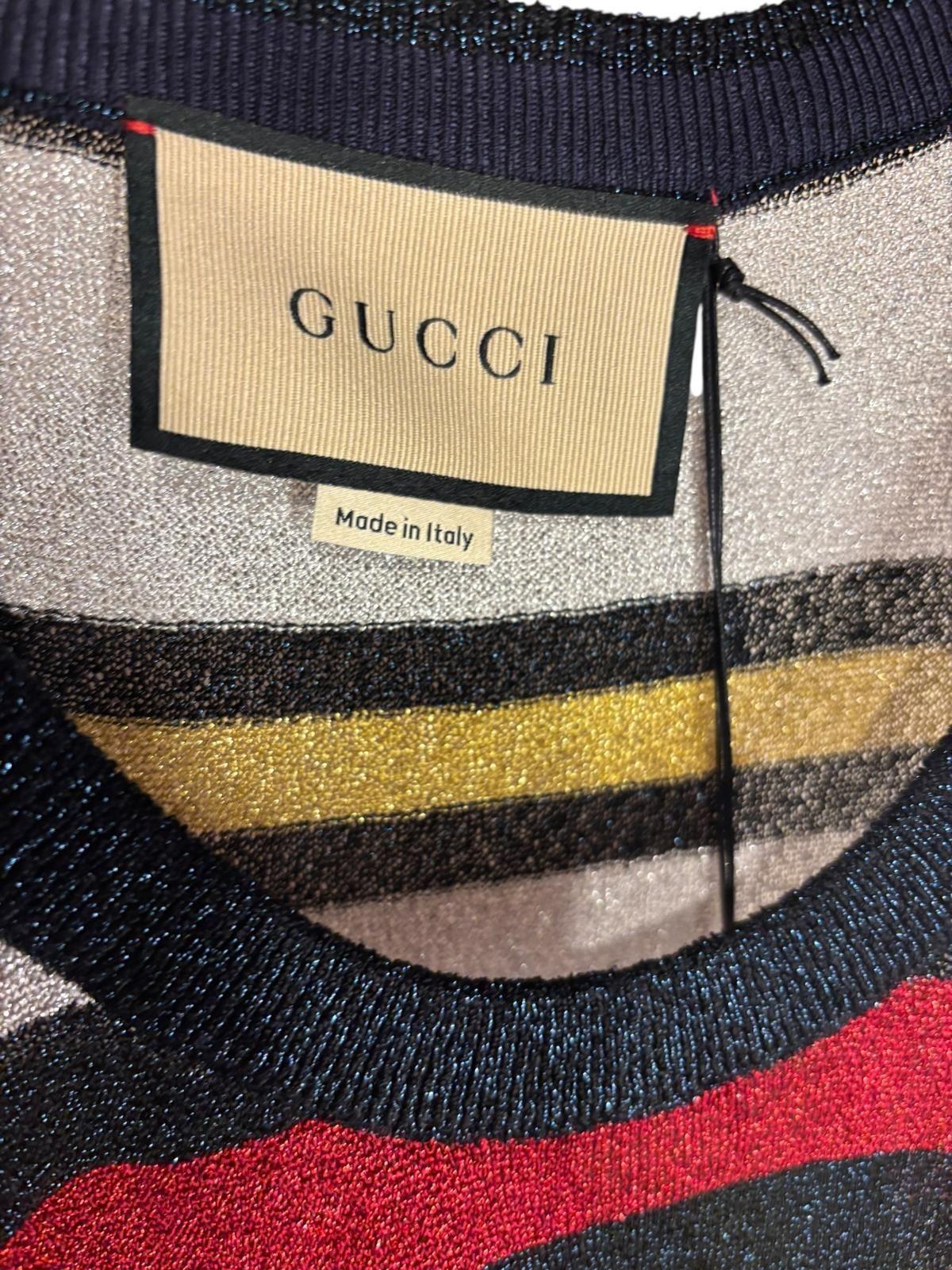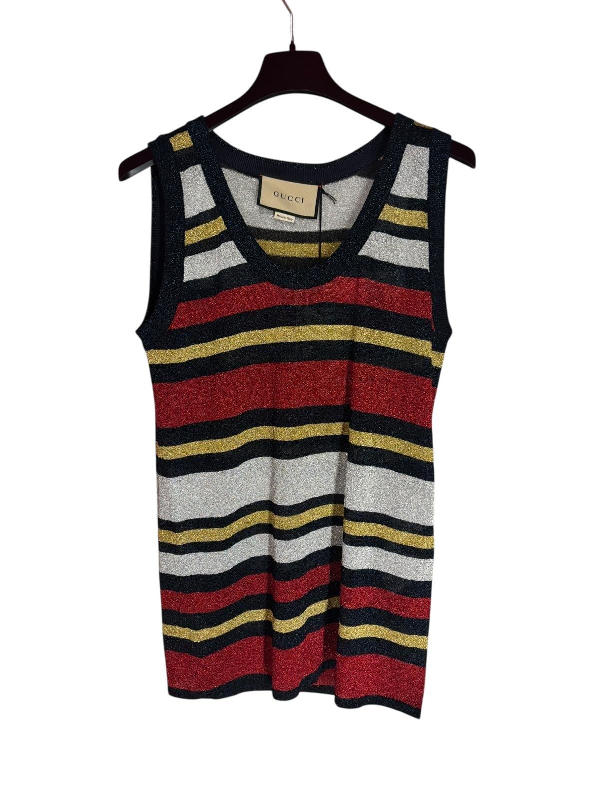 An eye-catching piece crafted in a shimmering knit fabric, featuring a bold striped pattern in black, red, gold and silver tones. The metallic finish gives the top a luminous, luxurious effect, perfect for statement looks and evening styling. The sleeveless cut and clean neckline enhance its modern and elegant silhouette.