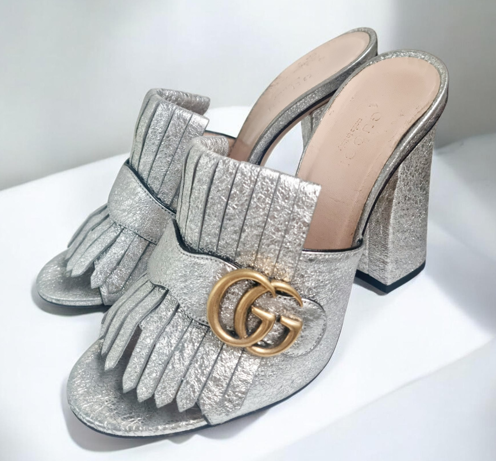Gucci Metallic Silver Leather GG Marmont Fringe Mules Sandals in very good condition, hardly worn.