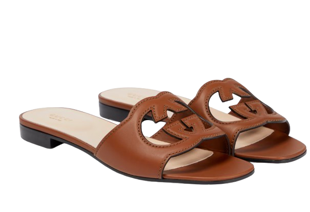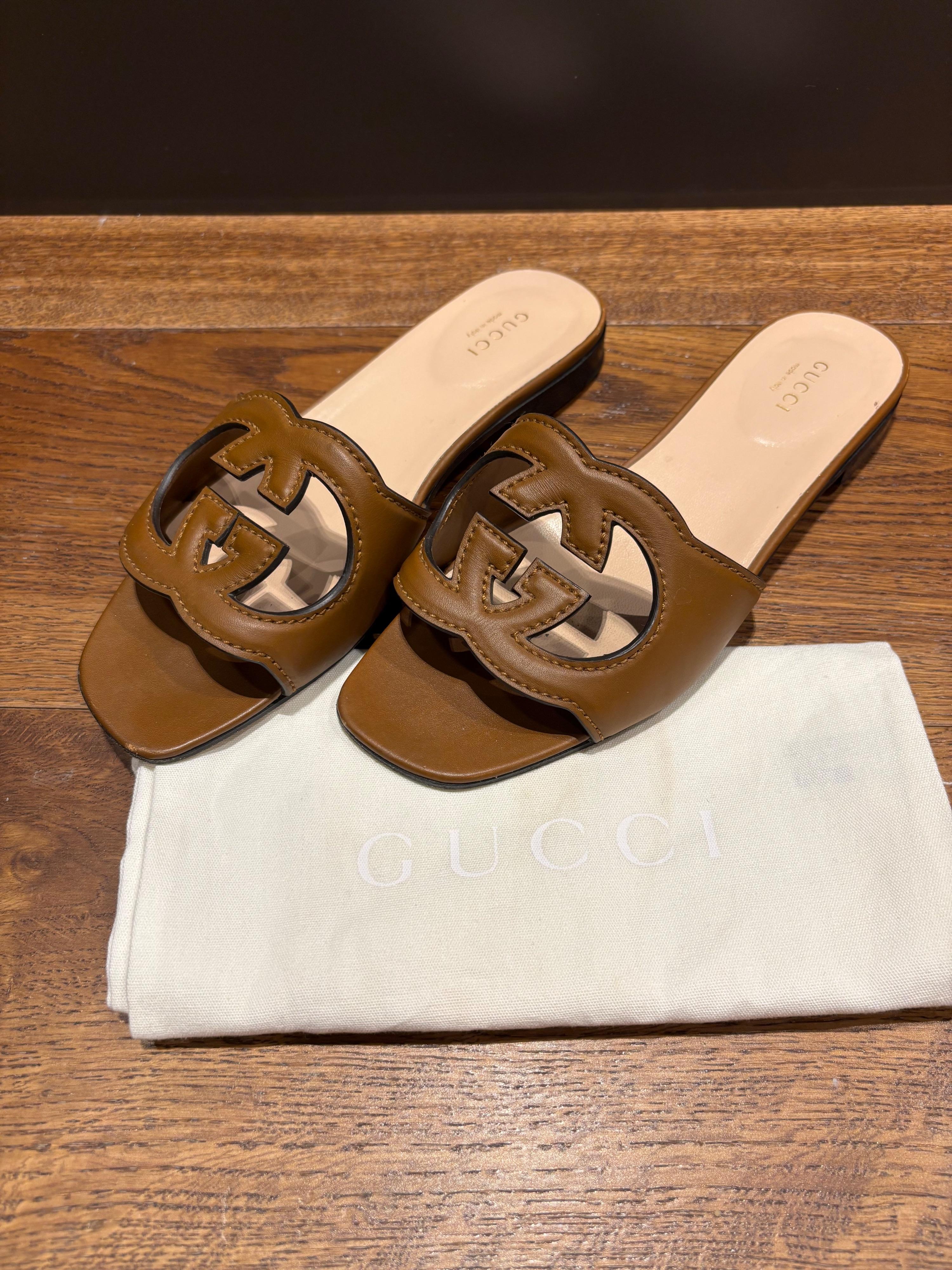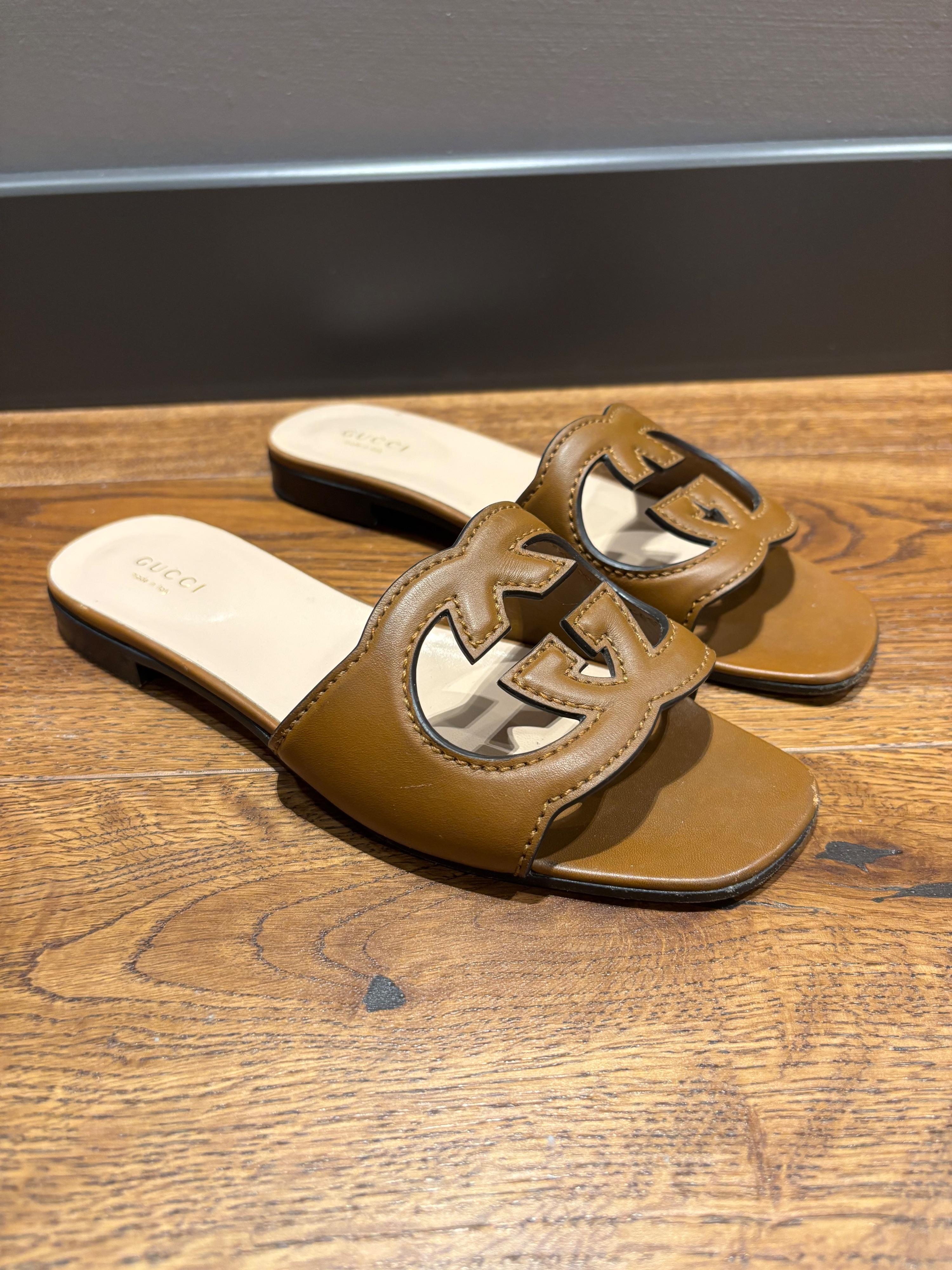 Brown leather Gucci slide sandals with the iconic GG Marmont logo cut-out detail. Made in Italy. The soles show signs of wear, consistent with preowned condition.