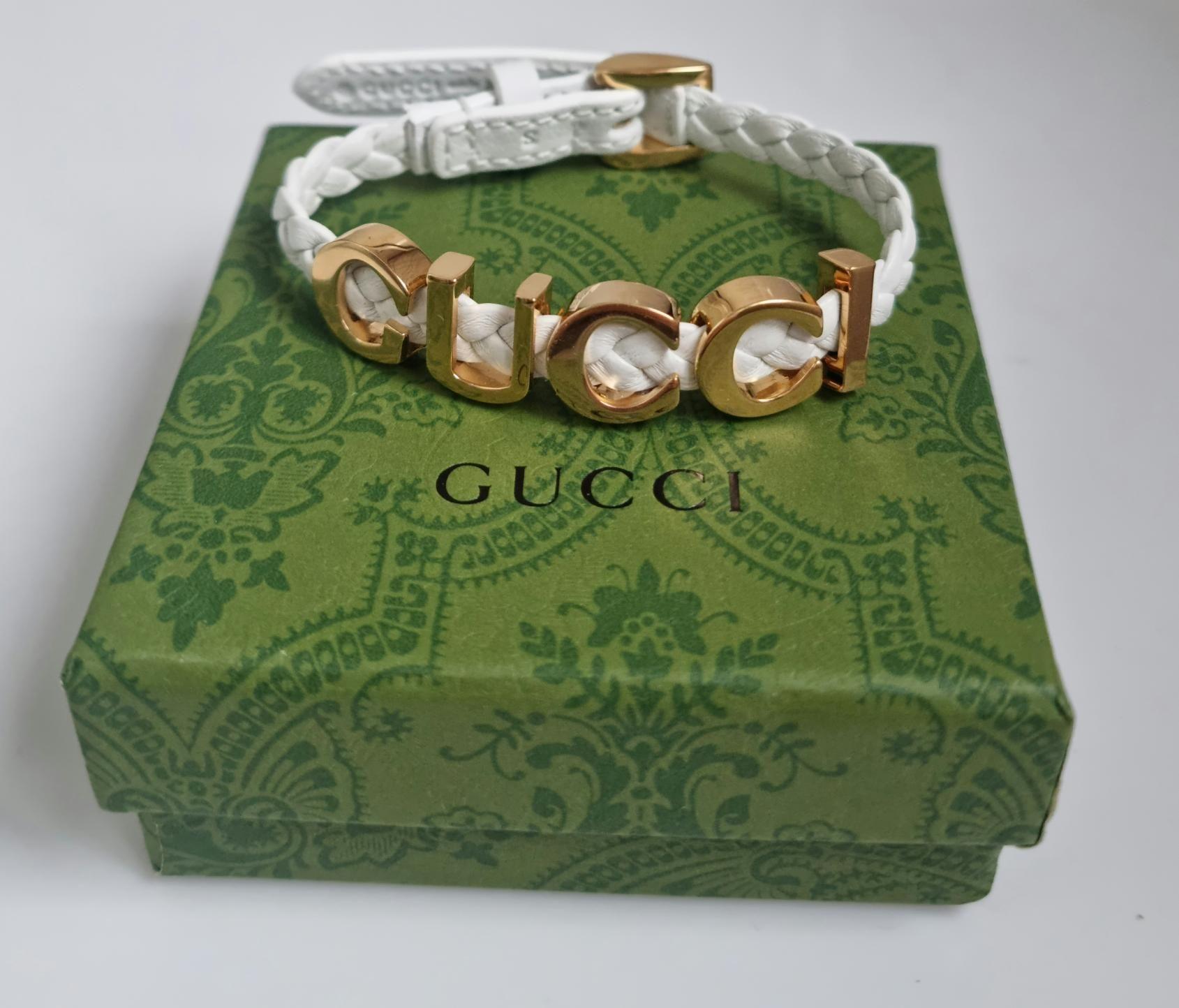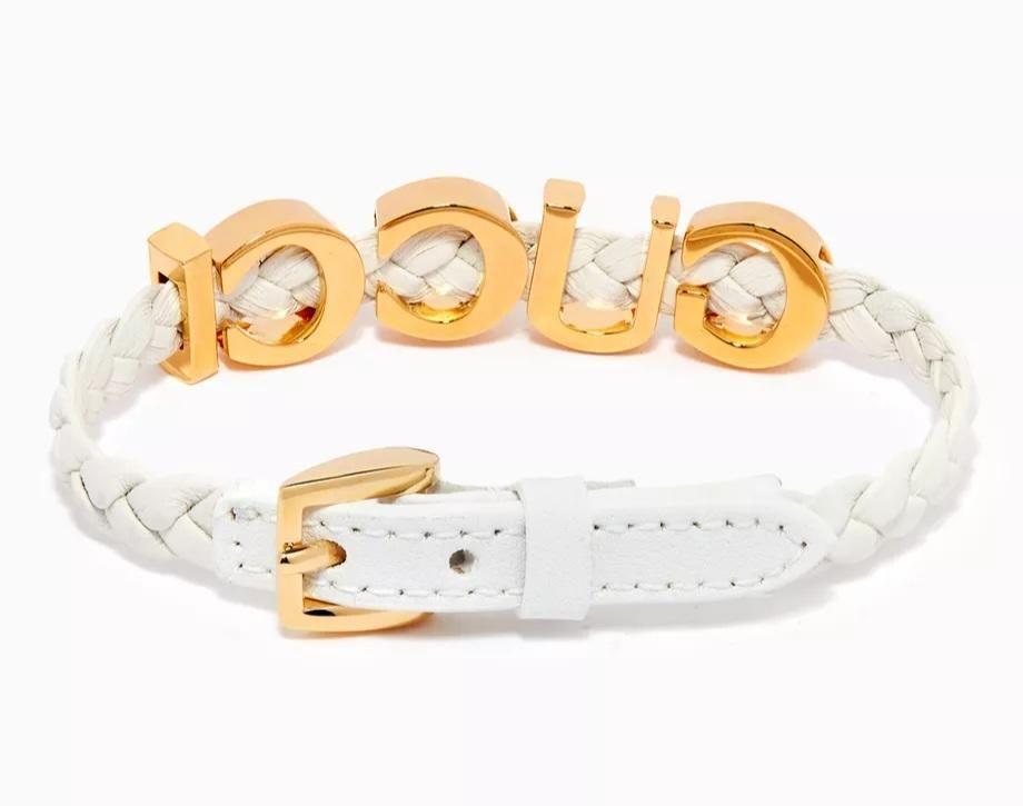 GUCCI logo motif bracelet designed on woven white leather.