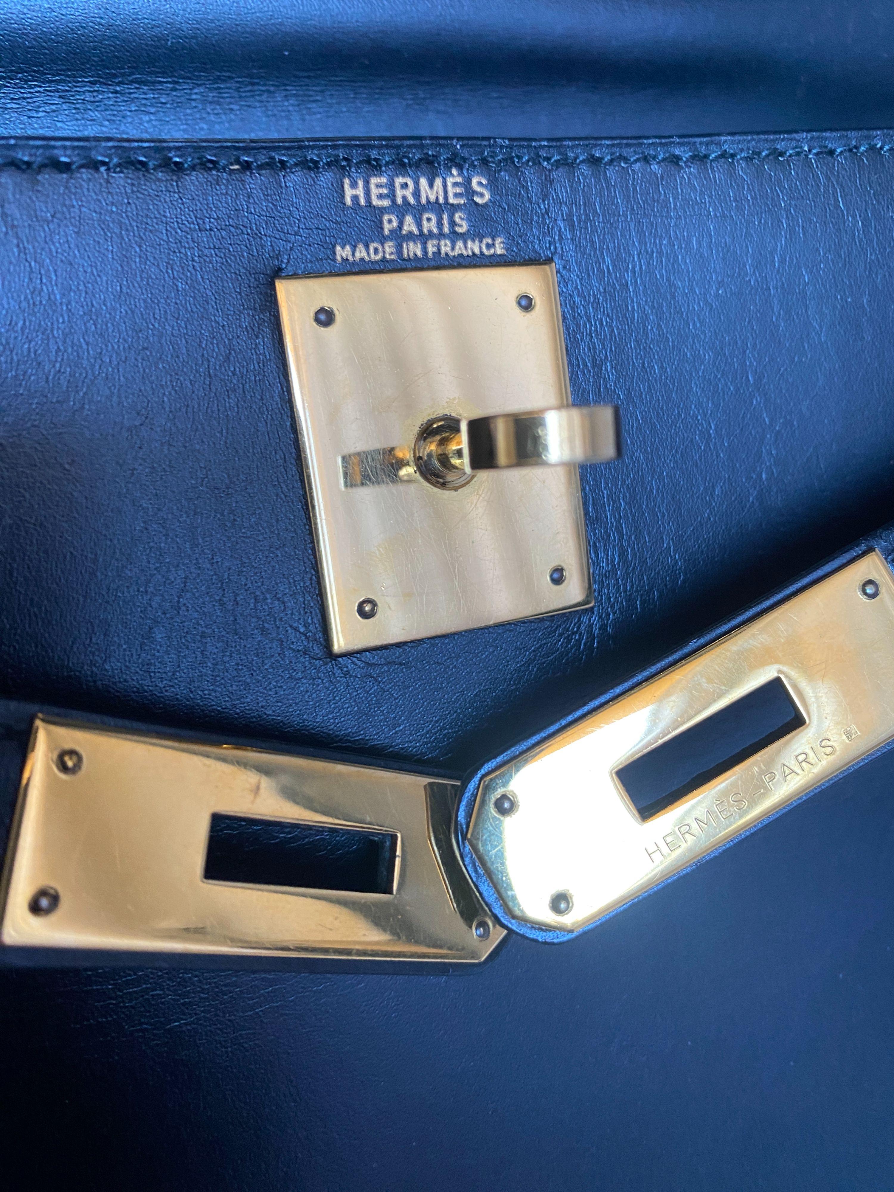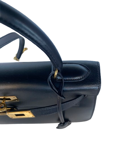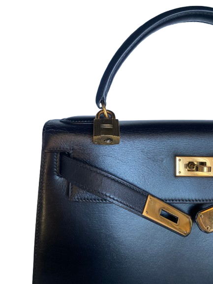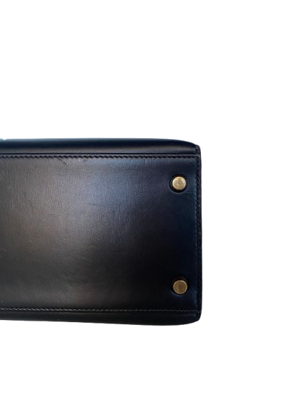 Hermes Kelly 28 Sellier bag in black box leather. A classic style with structured silhouette.