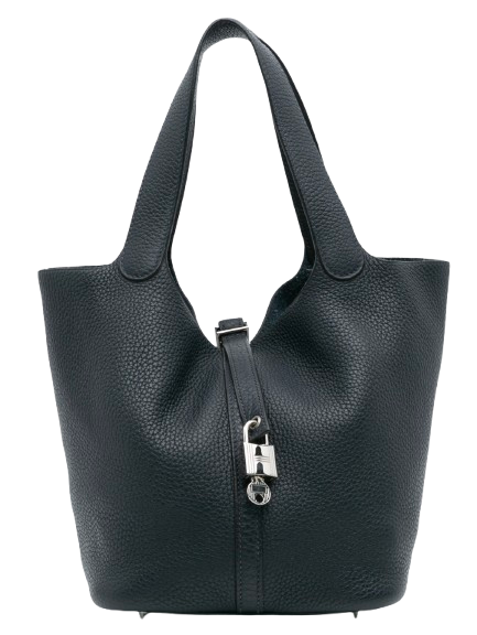 The Picotin 22 features a clemence leather body, flat handles, and an open top with a pull through flat strap and padlock closure. The straps were repainted.