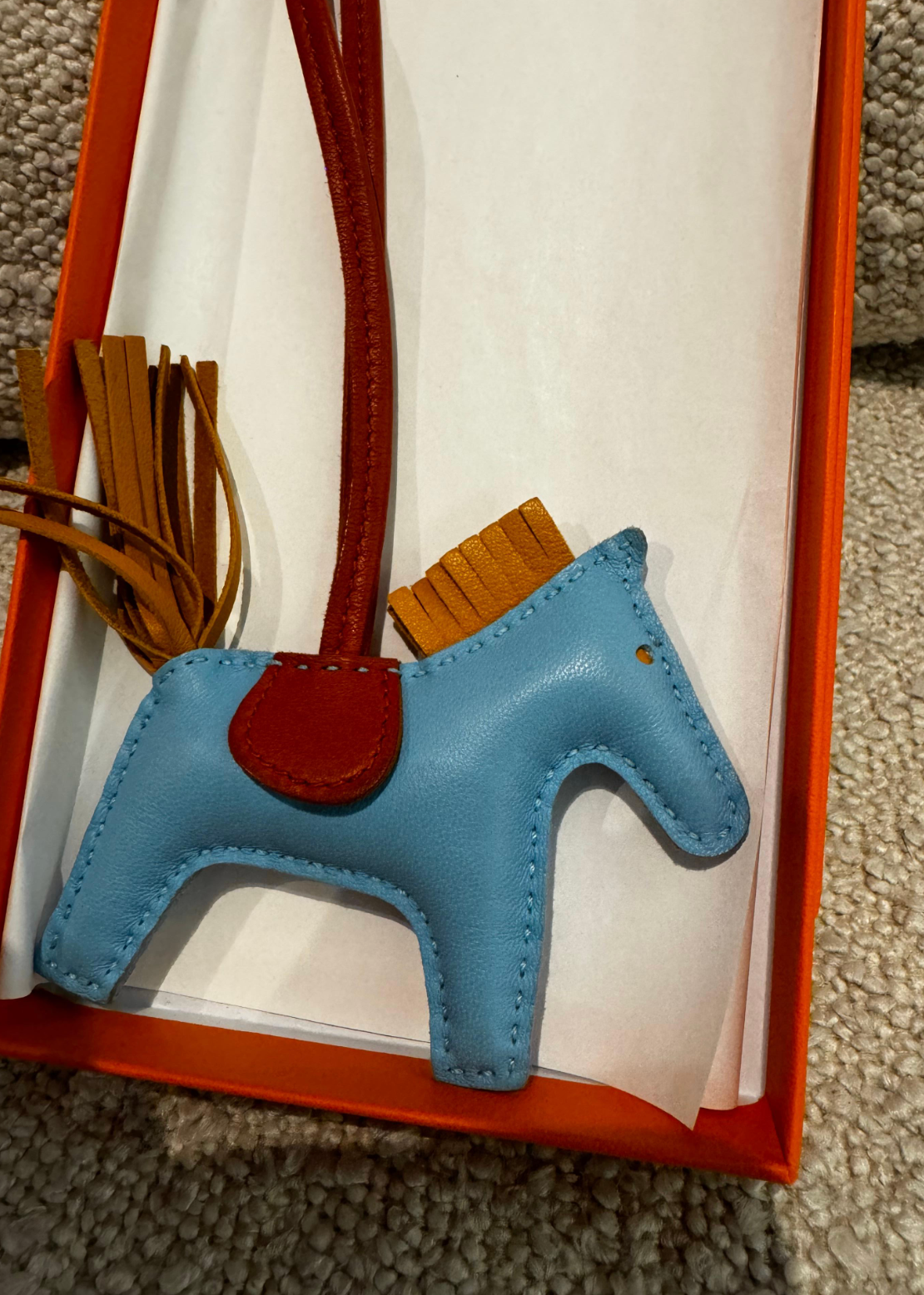 HERMES Milo Lambskin Horsehair Grigri Rodeo Horse Bag Charm PM in Celeste, Naturel Bouton D'Or and Cornaline. So rare, some rodeo are more appreciated than the Hermes Birkin/kelly bags. This lovely bag charm is crafted of stuffed blue lambskin leather with a tan mane and tail on an orange leather strap.
