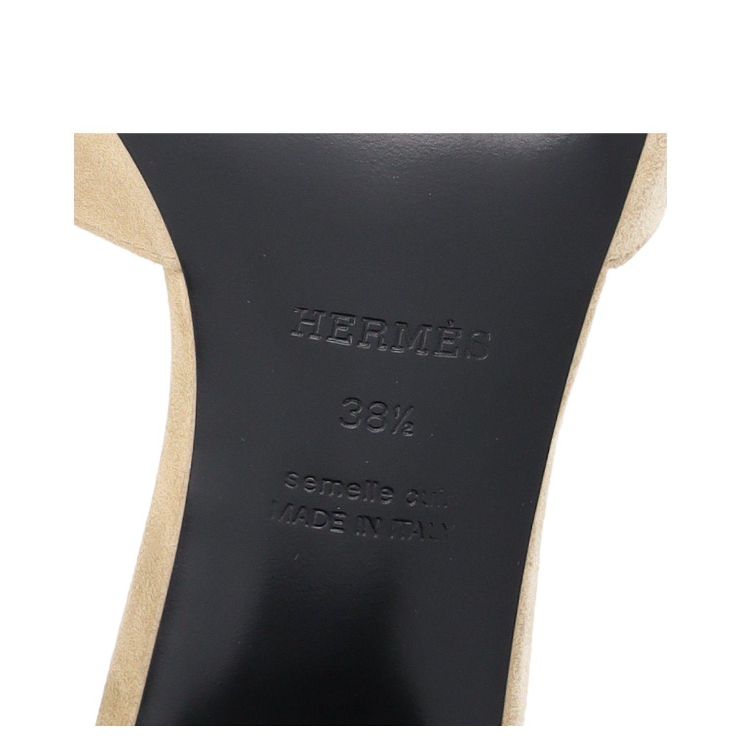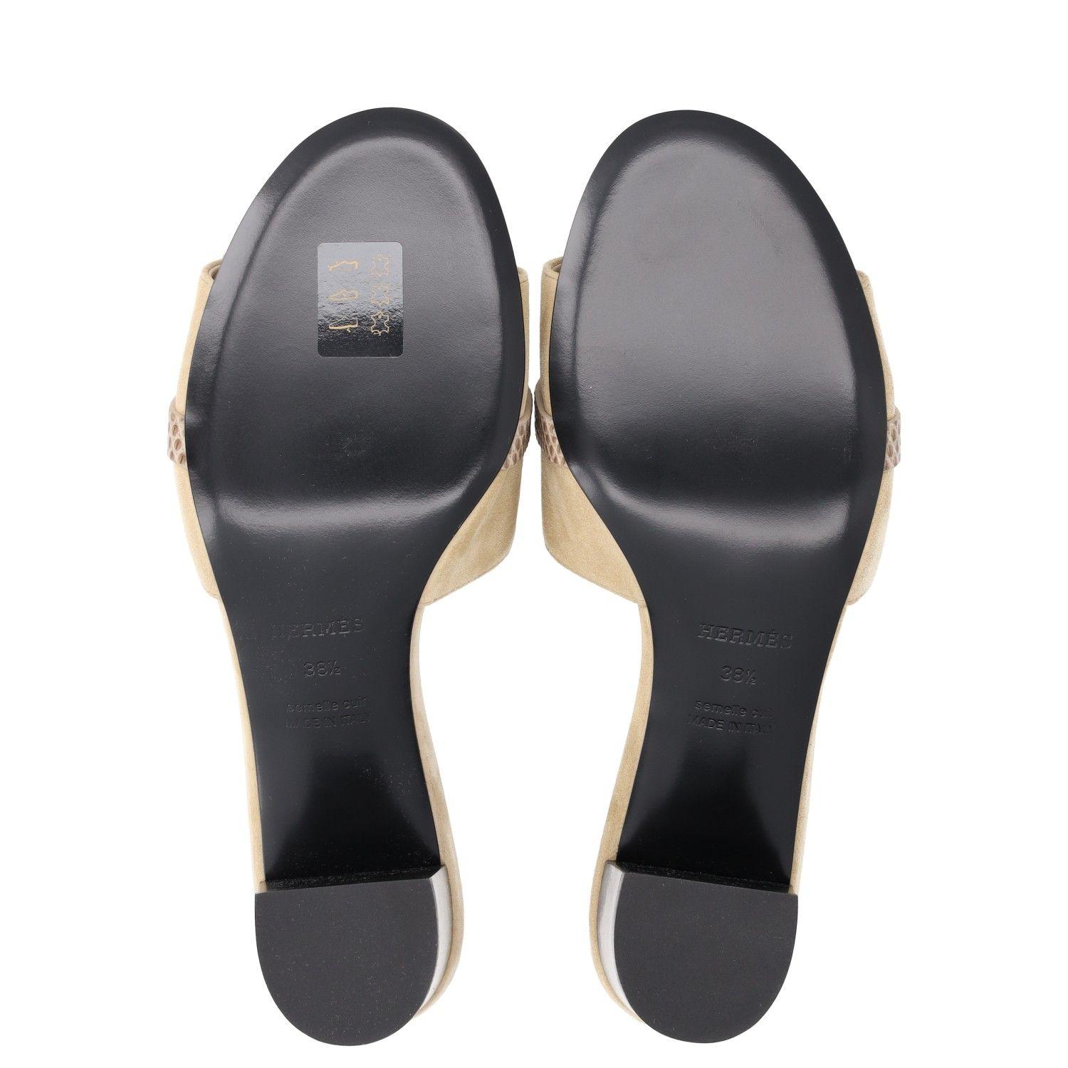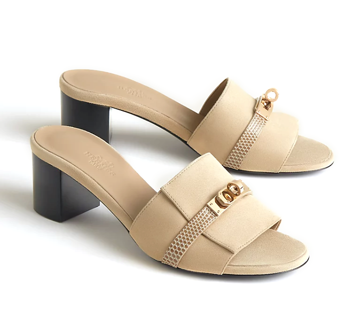 High heel sandal in suede goatskin and shiny Java lizard with iconic Kelly buckle.