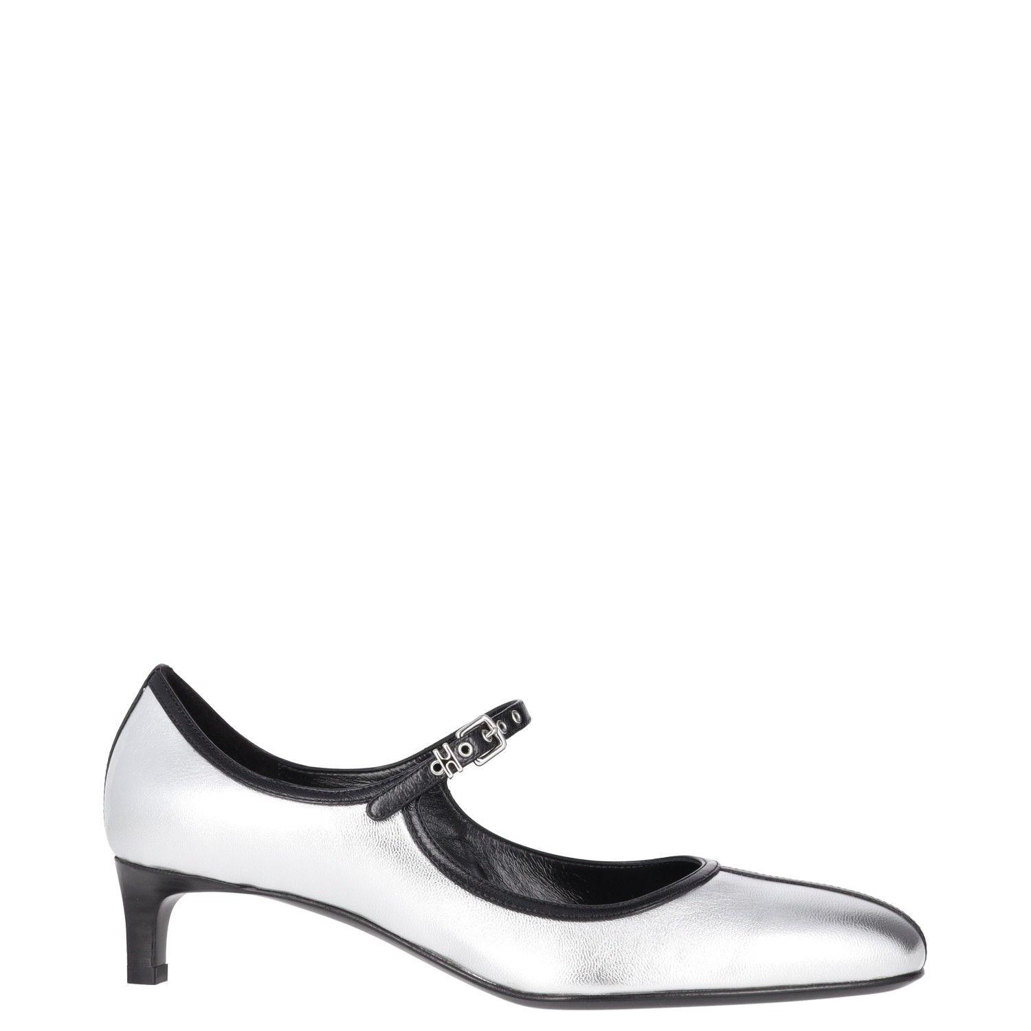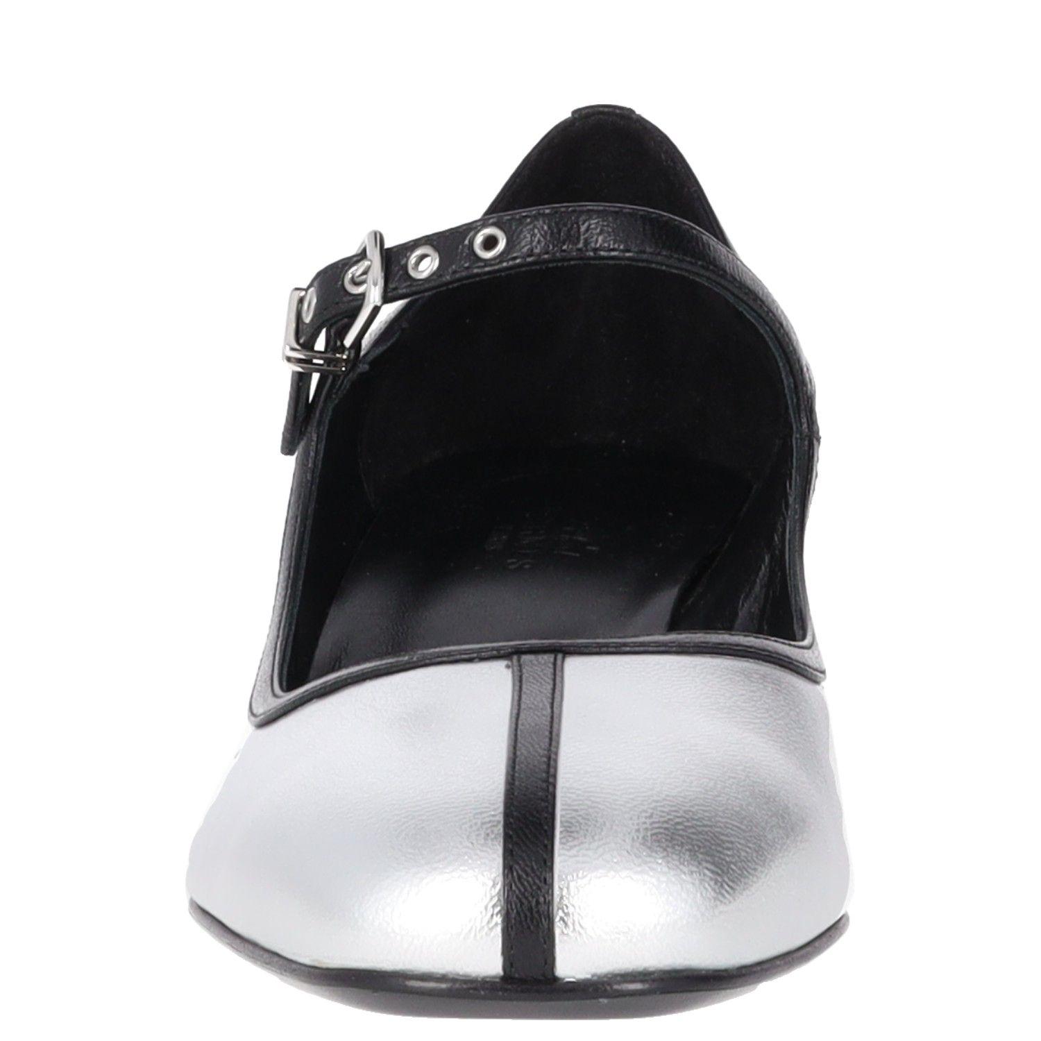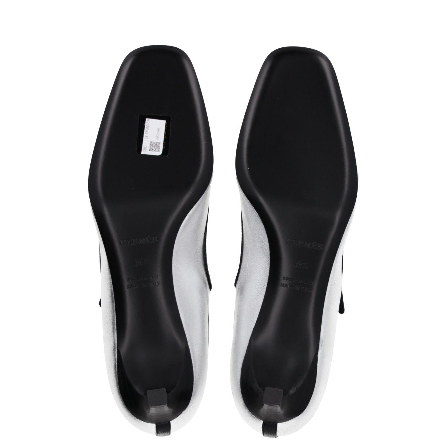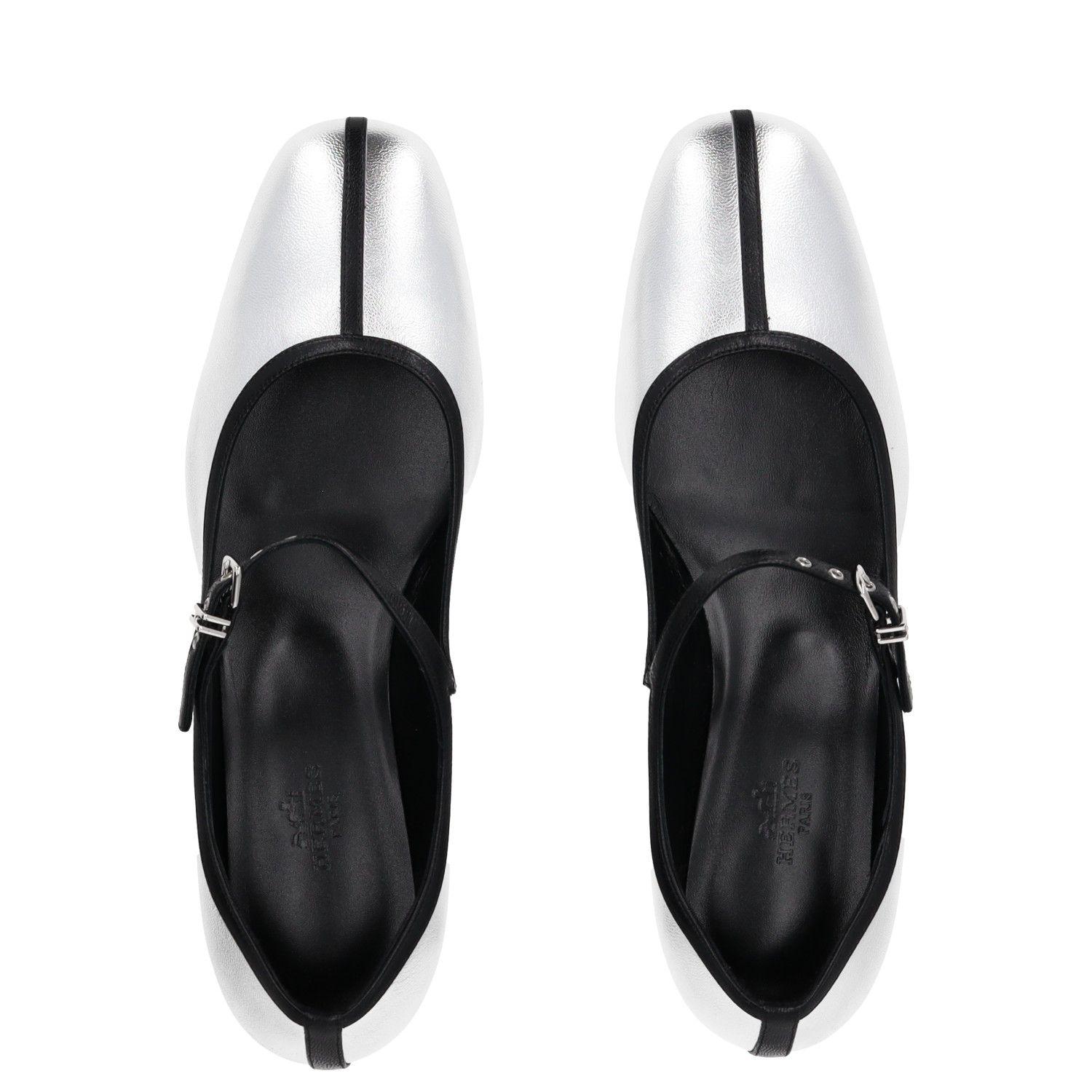 Pump in goatskin with metallic finish and goatskin with iconic "H" buckle and contrasting piping.